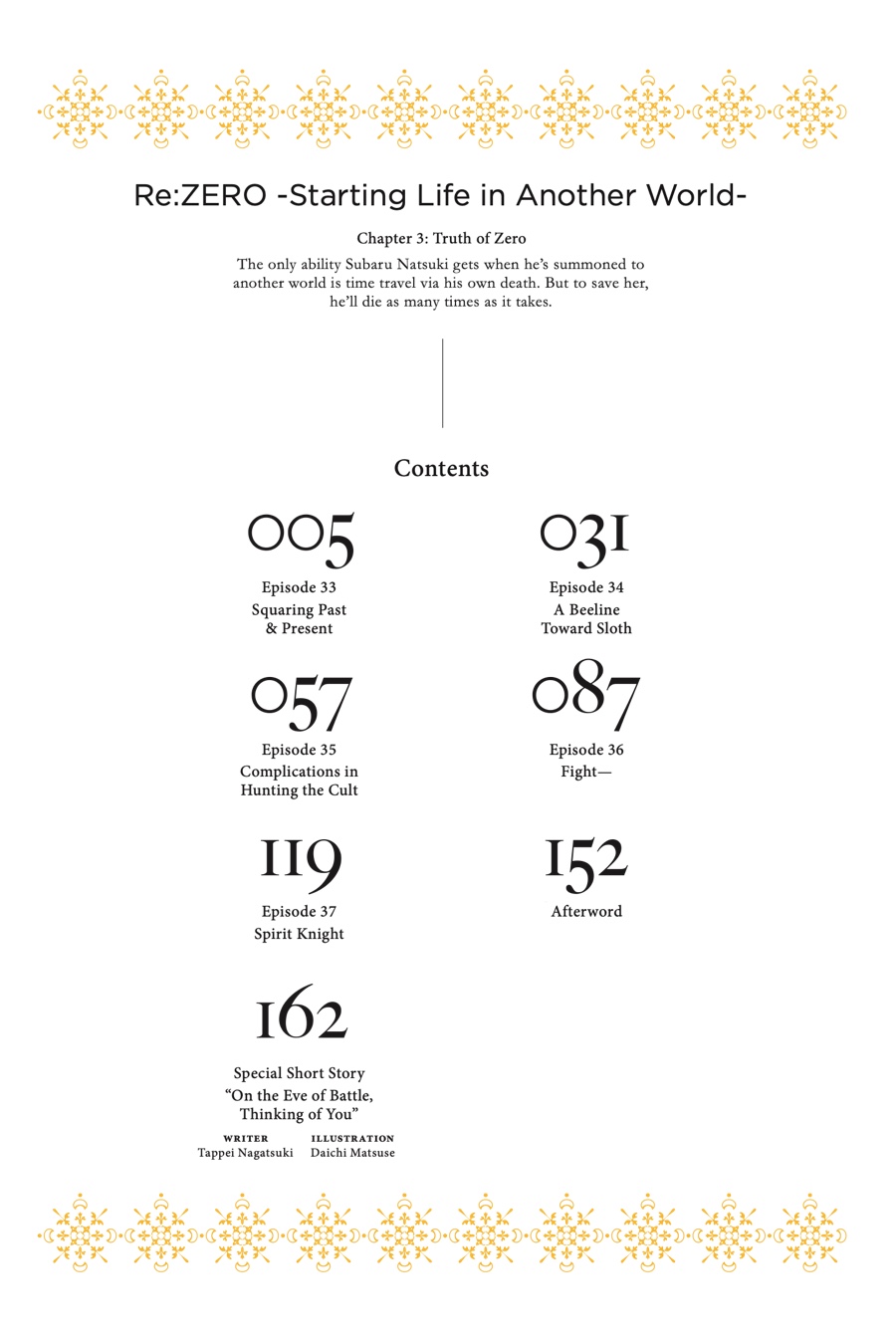 The battle against the White Whale has concluded, but Subaru’s fight is far from over. He knows the Witch Cultists have their eyes on Emilia, so he’s brought forces—including Julius the knight, of all unlikely allies—to ambush them and crush their scheme. But when things go a little too smoothly against Subaru’s nemesis, the “Archbishop of Sin” Petelgeuse, a suspicion lingers: Is there something vitally important they’ve failed to realize…?