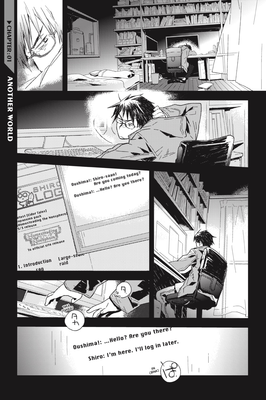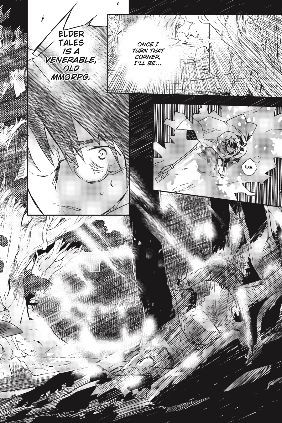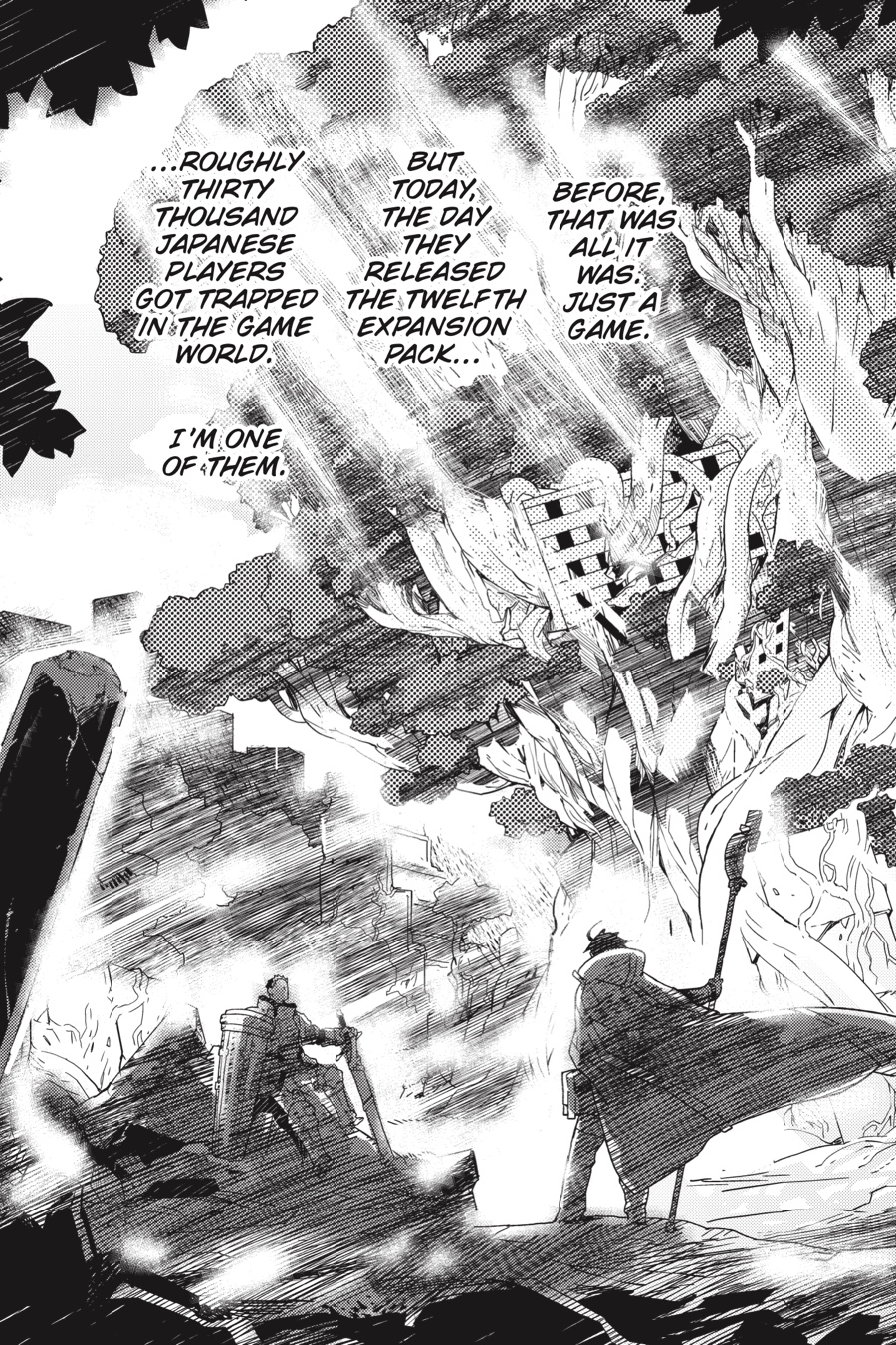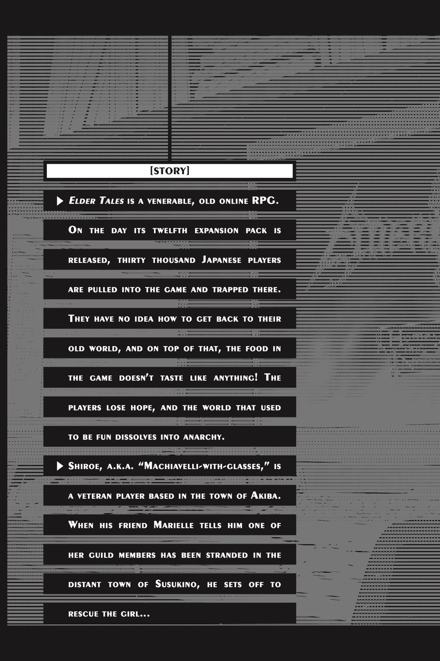 The world of Elder Tales was supposed to be fun for everyone, but ever since the 12th expansion pack came out and trapped thirty thousand gamers within its fantastical confines, it's not much fun anymore! Nobody knows how to return to the real world, the food has no taste, and even death is no escape. Since the change, the world has fallen into lawlessness, and a strong guild is a player's only hope for survival. It's amid these dire circumstances that Shiroe sets off across the virtual landscape with his friends Naotsugu and Akatsuki on an adventure of discovery as they try to understand the nature of their new reality. Illustrator Kazuhiro Hara has adapted Mamare Touno's light novel series into a comic that gamers and manga fans alike won't want to miss!