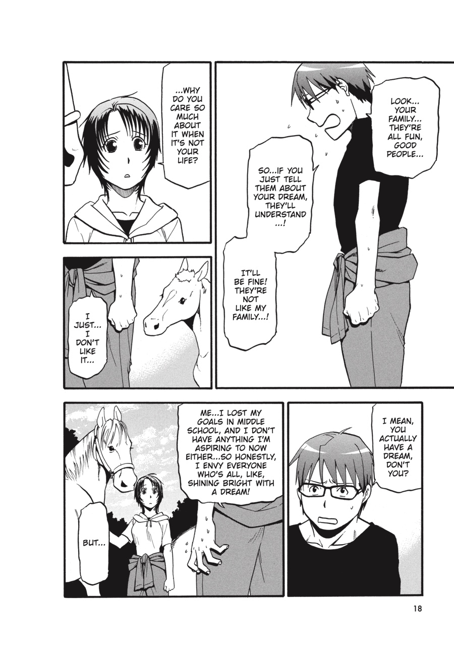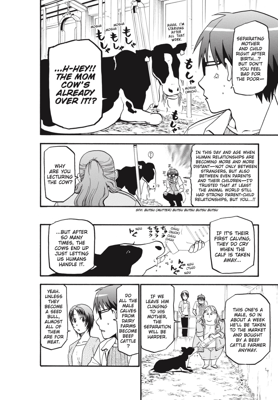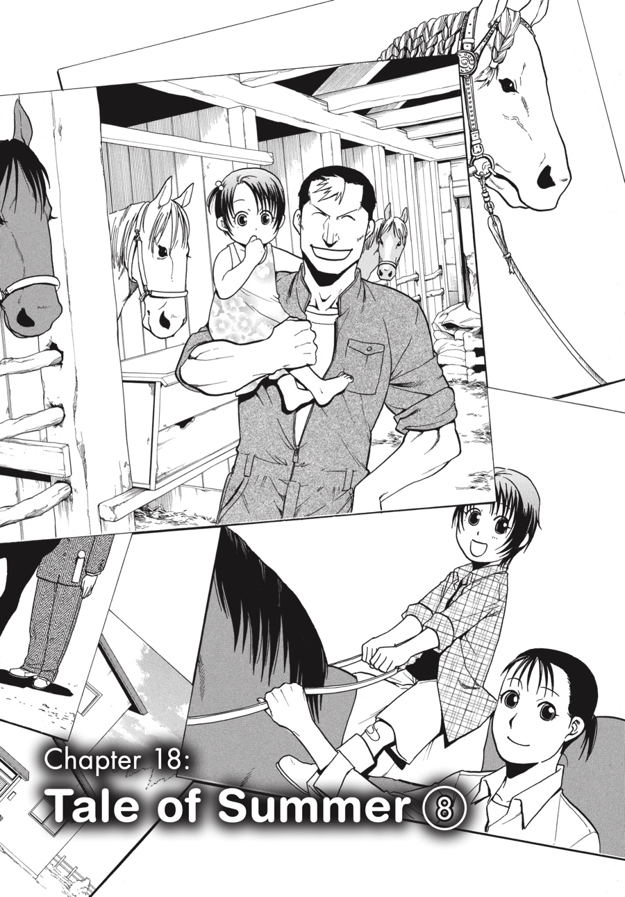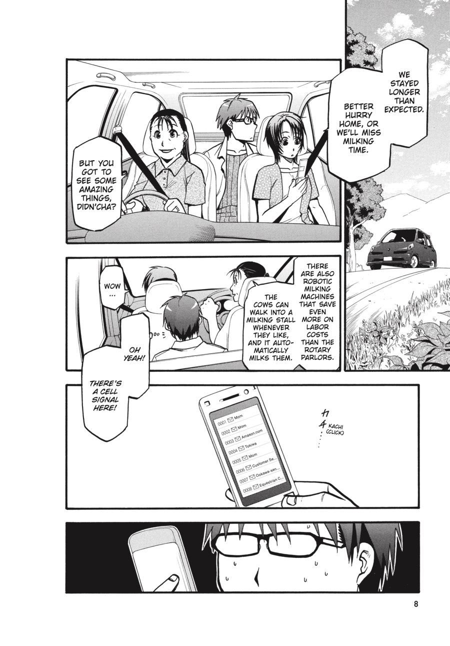A few weeks into his summer job at Mikage Ranch, Hachiken has proven himself a hard worker, even under the skeptical gaze of Aki's father. His first term at Ezo AG has given him a great deal to think about-the future, the fate of Pork Bowl-but open pastures and fresh air provide a very different backdrop to his worries than his previous life in the city. Still, when he chose not to go home for summer break, Hachiken hardly expected home to come to him!