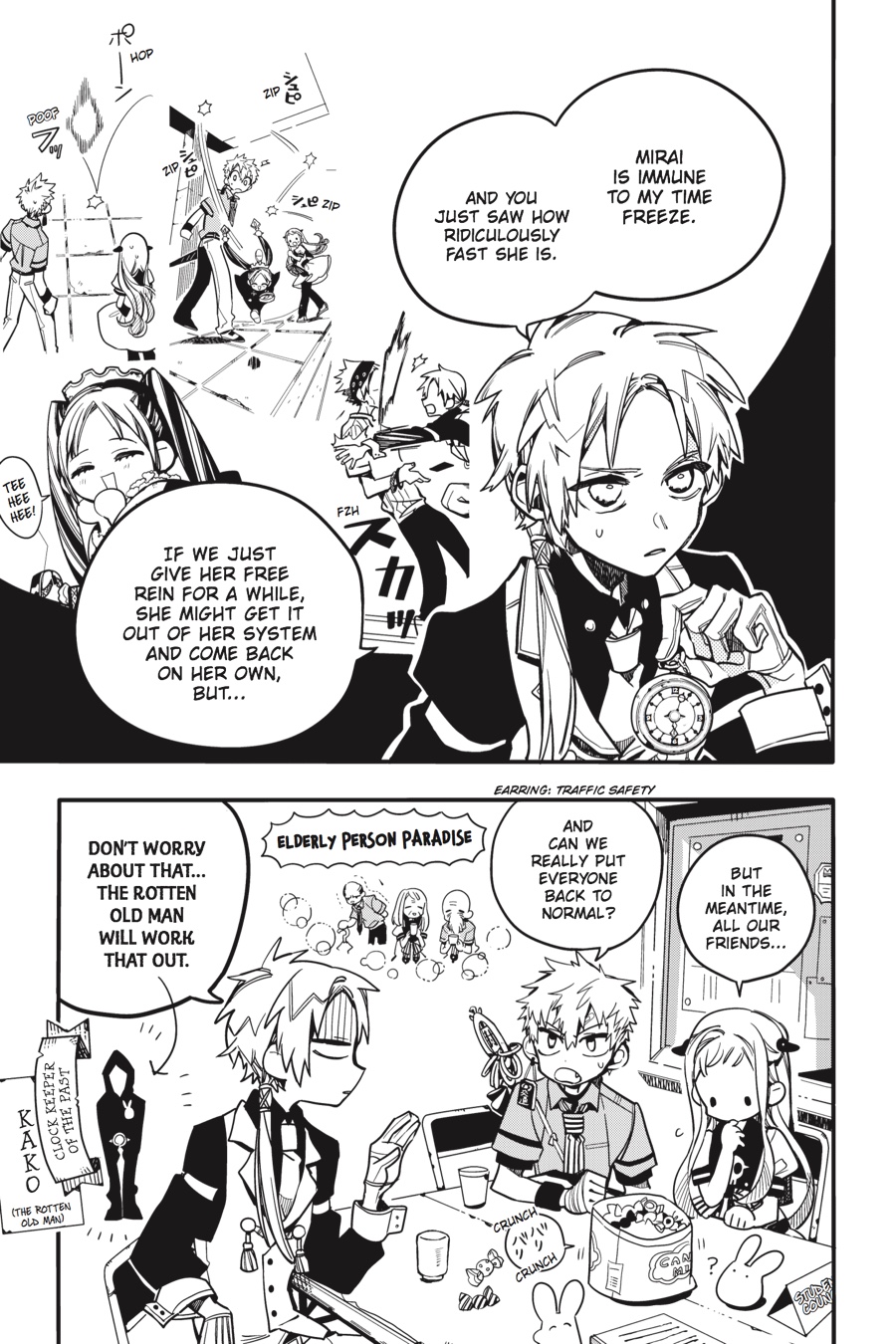School Mystery No. 1’s Clock Keeper of the future has gone out of control, turning Kamome Academy’s entire student body into wrinkly old people! Hanako-kun, Nene, Kou, and Akane will have to work together to catch this agile trickster and keep the school from becoming a retirement home. But just when they seem to have Mirai cornered, one final prank goes horribly wrong, bringing Nene’s secret out into the open...