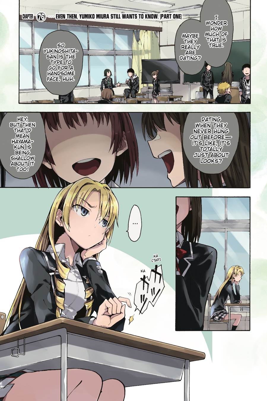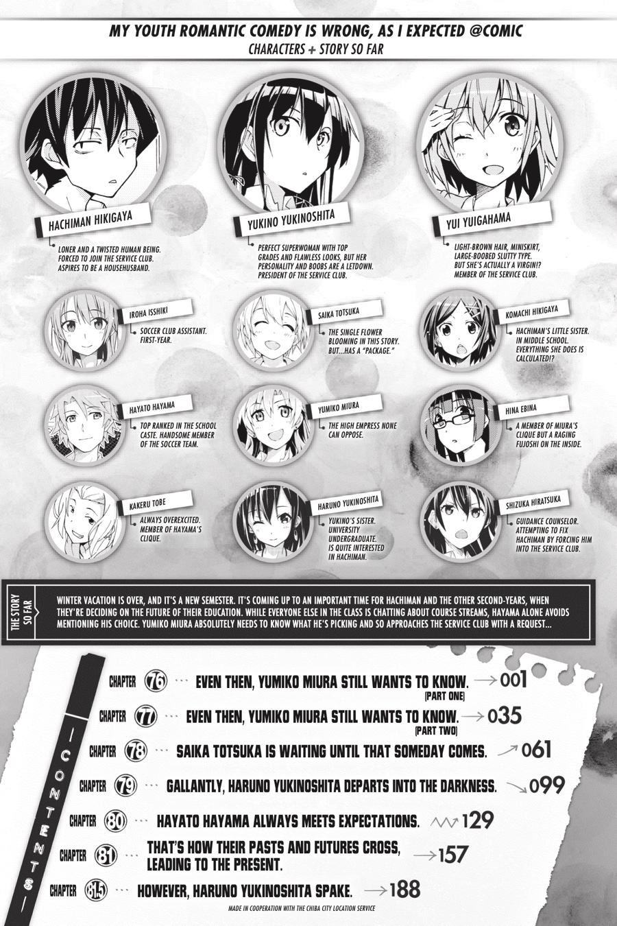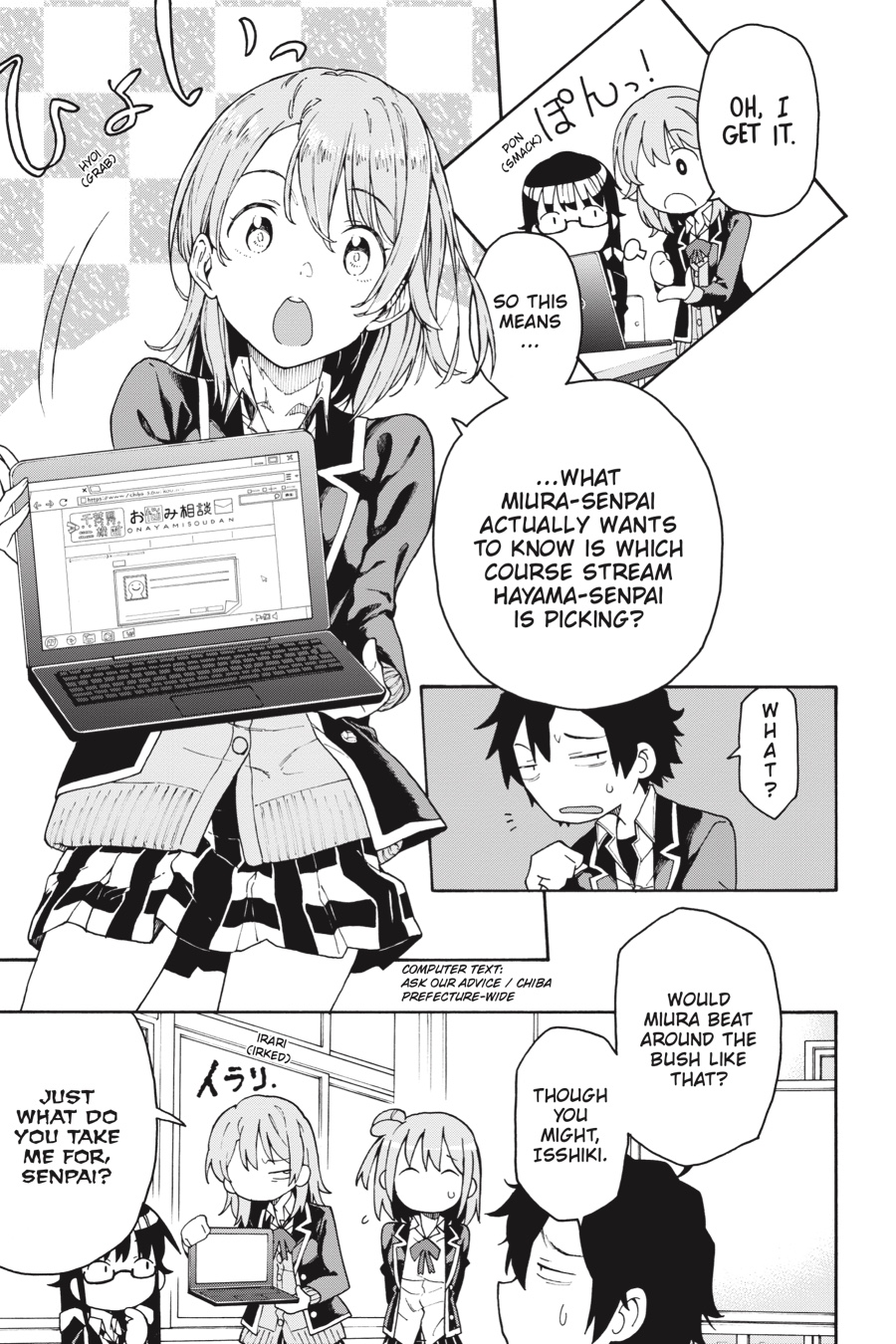 Soubu High’s queen bee, Yumiko, has come to the Service Club with a forlorn expression and a request: Find out Hayama’s plans for his educational track. Now it’s up to Hachiman to deduce the truth, and he’s well aware that cracking the flawless facade of the most popular guy in school is no small feat. But the attempt may just lead to some revelations—about Hayama, himself, and the weight of expectations.