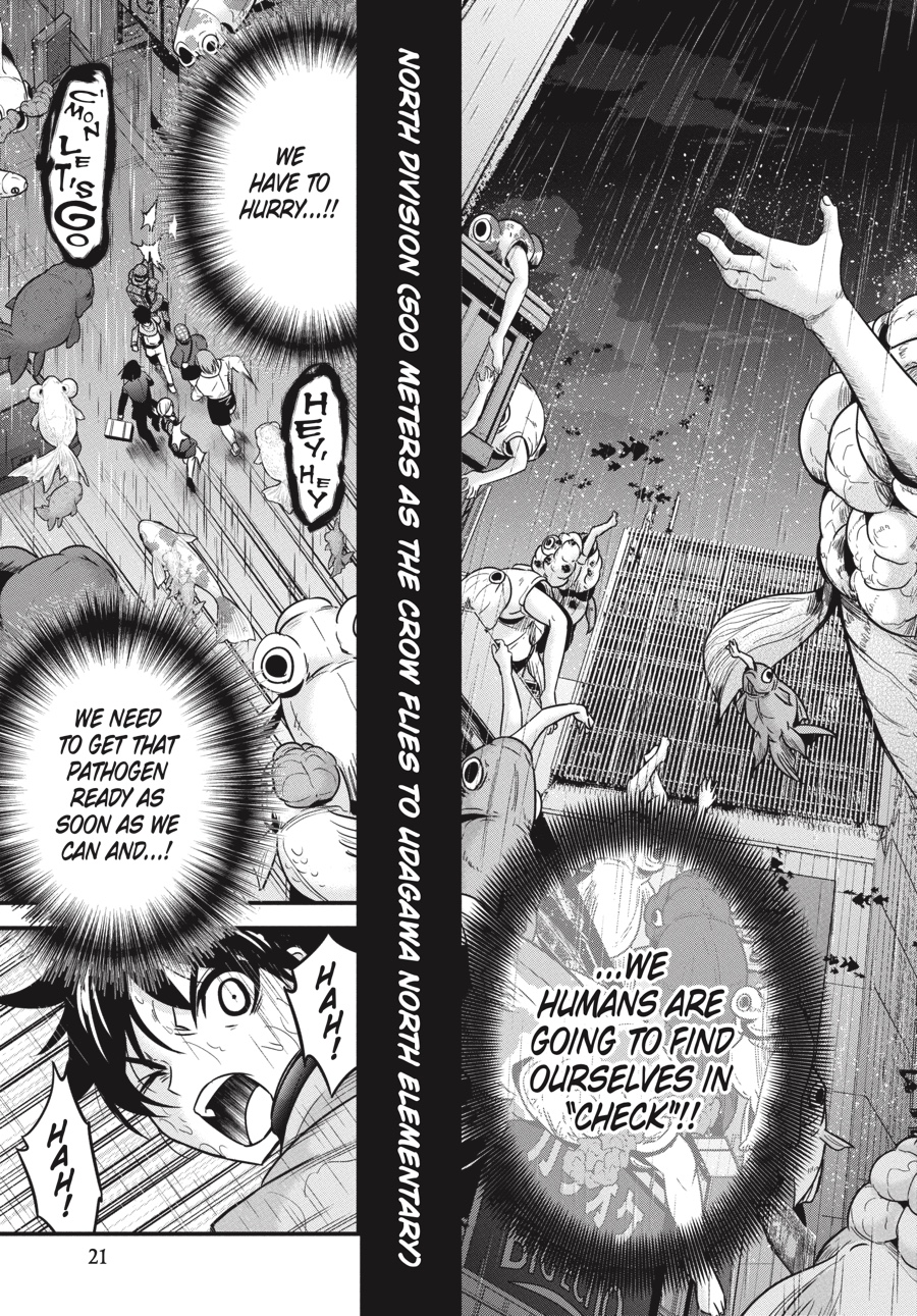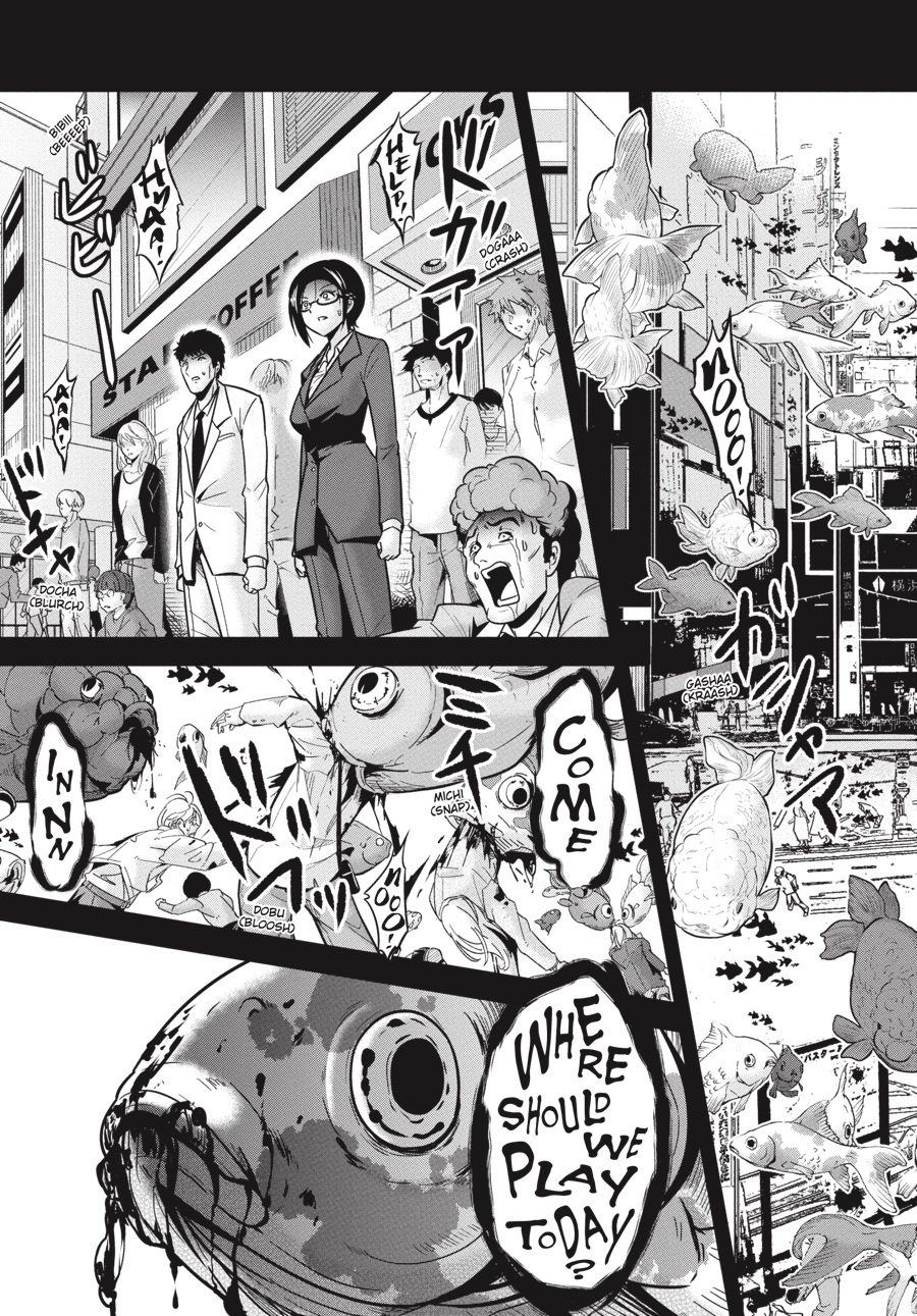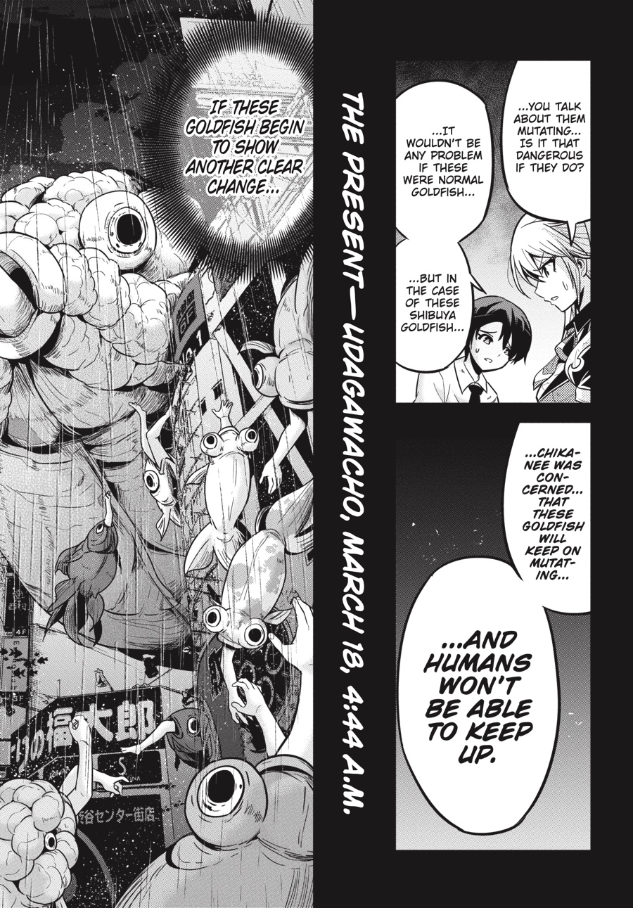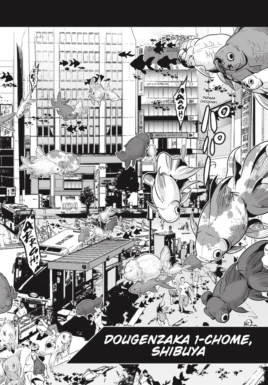 Thwarted at every turn by swarms of Limbs, the survivors make slow progress toward Udagawa North Elementary, where Hajime hopes to reunite with his friends— _and commandeer an SDF Type 10 tank! Every Limb encounter has resulted in at least one grisly death, but how the mutant goldfish cause their victims to literally explode into a bloody flurry of tiny fry remains a mystery. The party needs to know more if they’re to have any hope of surviving against the Limbs, but the answer may reveal an even greater threat to all of Shibuya… and perhaps the whole world!!
