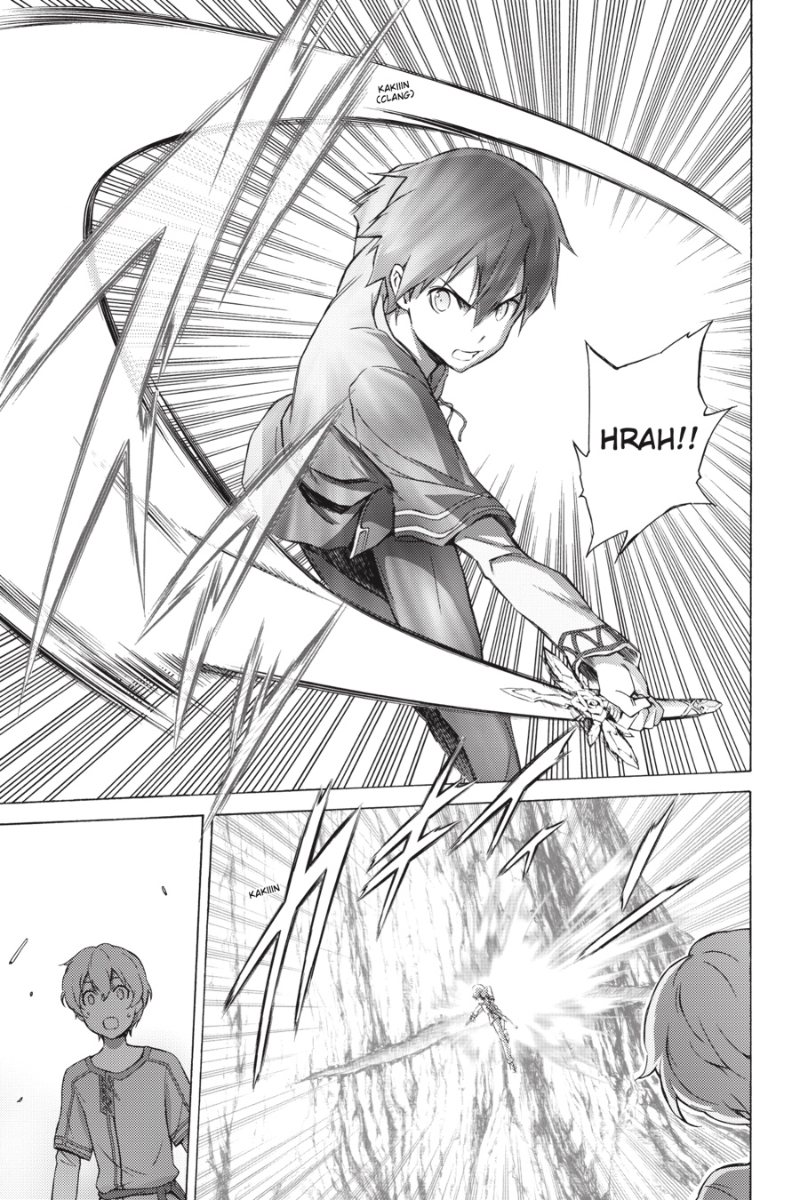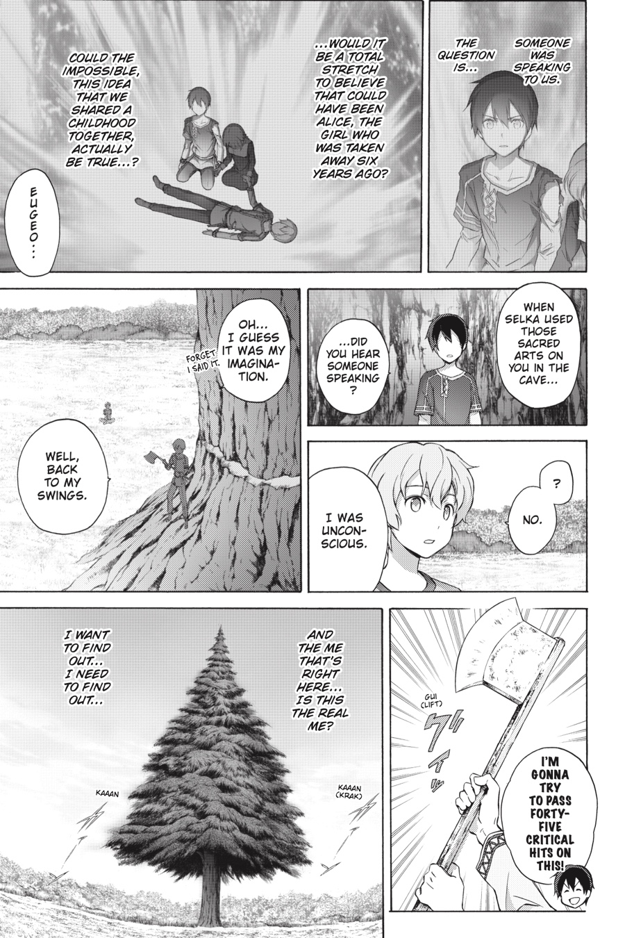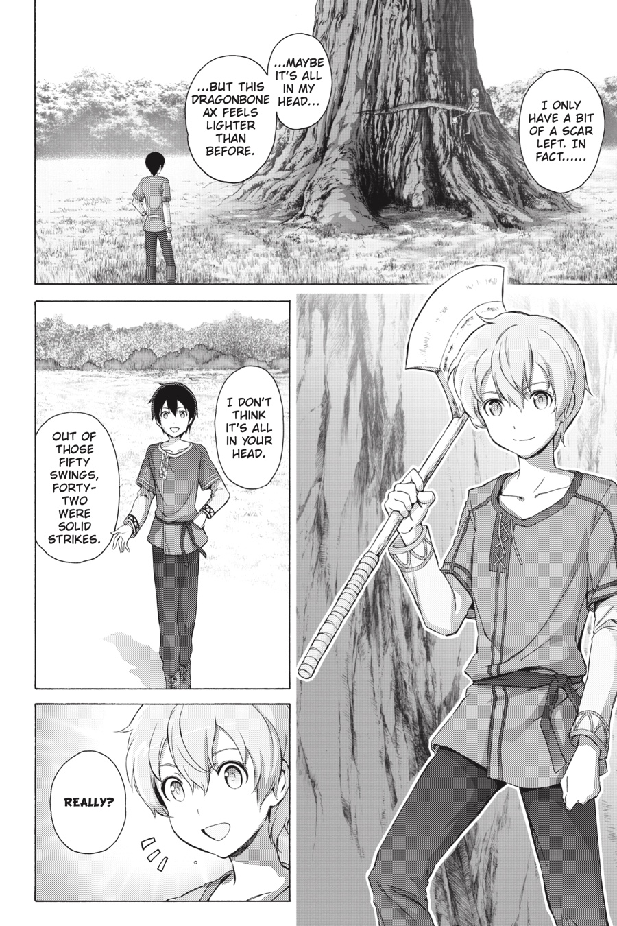 “This might be a game, but it’s not something you play.” - Akihiko Kayaba, Sword Art Online programmer After Kirito and Eugeo’s brush with death in their fight against the goblins, it’s back to the Gigas Cedar, the massive tree that Eugeo’s destined to hack away at for the rest of his days. But Kirito feels a lot stronger now-even the Blue Rose Sword feels lighter in his hands. As he approaches the fearsome Gigas Cedar with a new “ax” in hand, he realizes that felling the giant just might be within the realm of possibility…