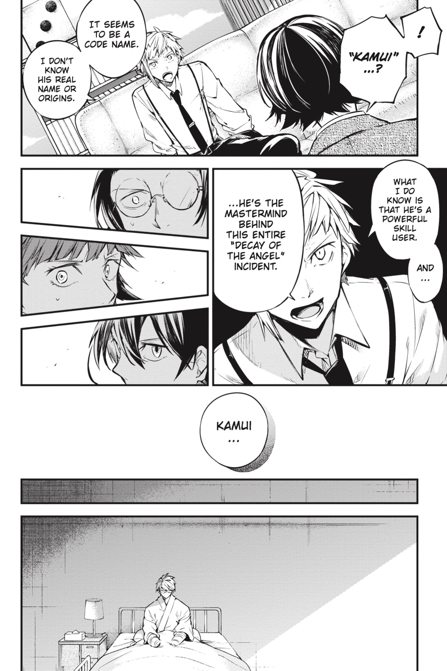Scattered and alone, the members of the Armed Detective Agency disappear one by one as Kamui, the leader of the Decay of the Angel, seeks to eliminate them once and for all! But Atsushi and the others aren’t out of the fight just yet. As they piece together allies and information in preparation for a counterattack, the return of a familiar face brings hope that they may be able to turn their desperate situation around! However long the night, the dawn will break-the agency’s revival is at hand!