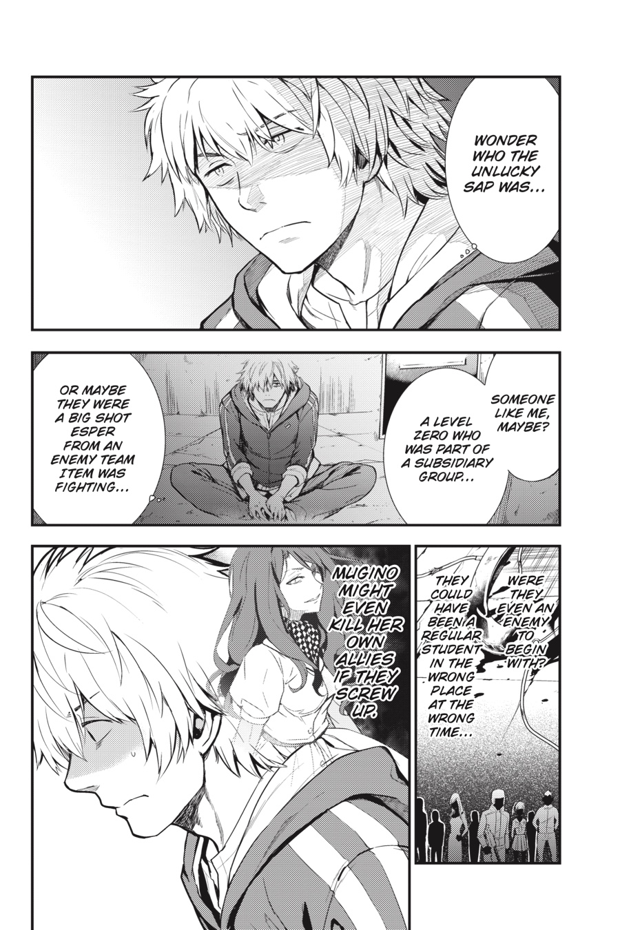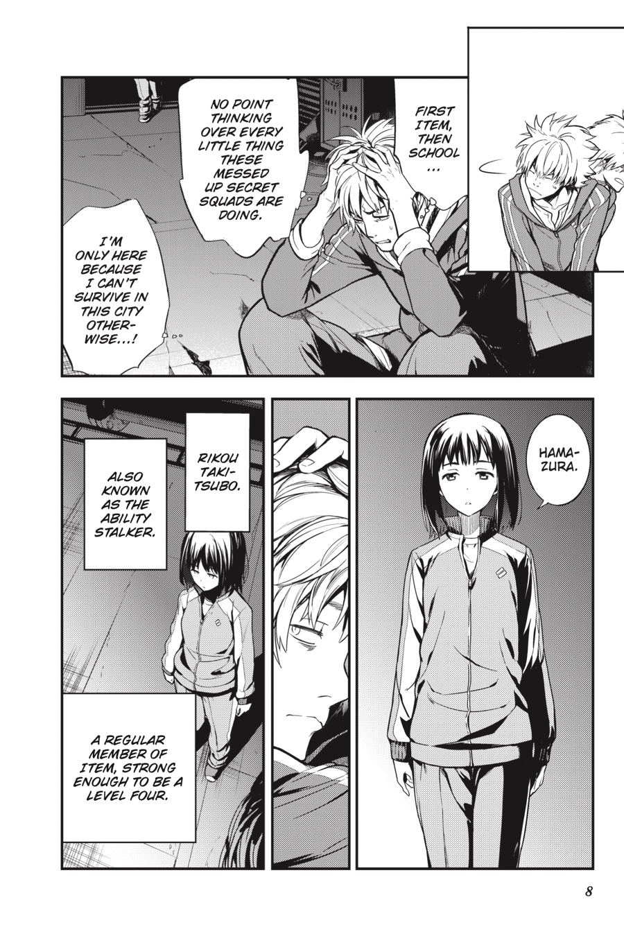 Item’s battle comes to a head as their hideout is raided, and the team reaches its breaking point. Disgusted with Mugino’s disregard for the other members’ lives, Hamazura finds the resolve to stand up to her. Mugino may be a Level Five, one of the strongest espers in Academy City, but she’ll see that even a powerless Level Zero like Hamazura can put up a fight when his back is against the wall!