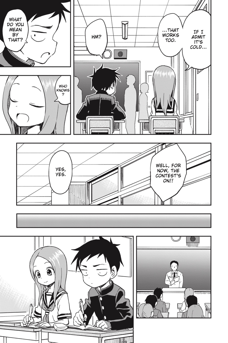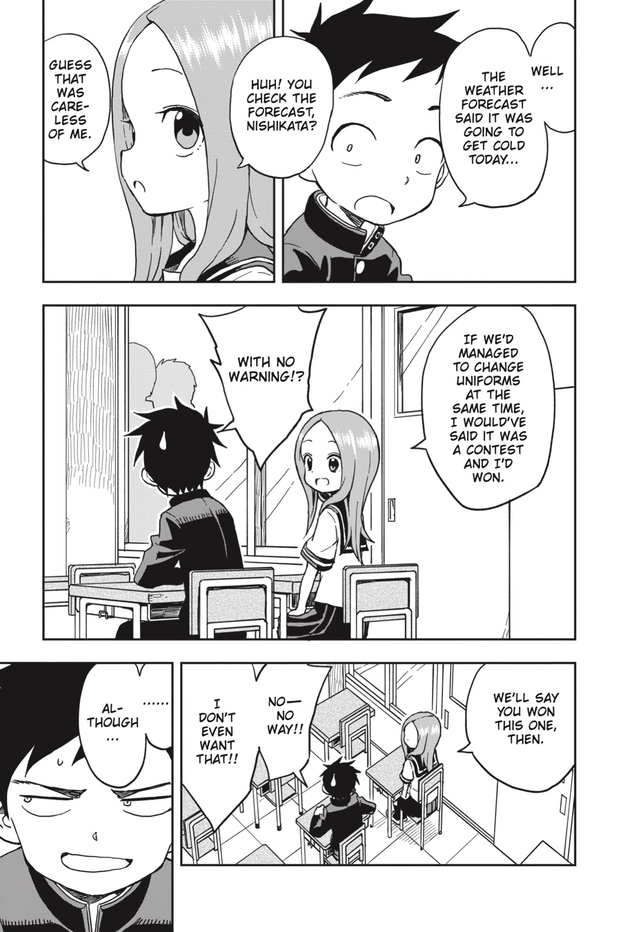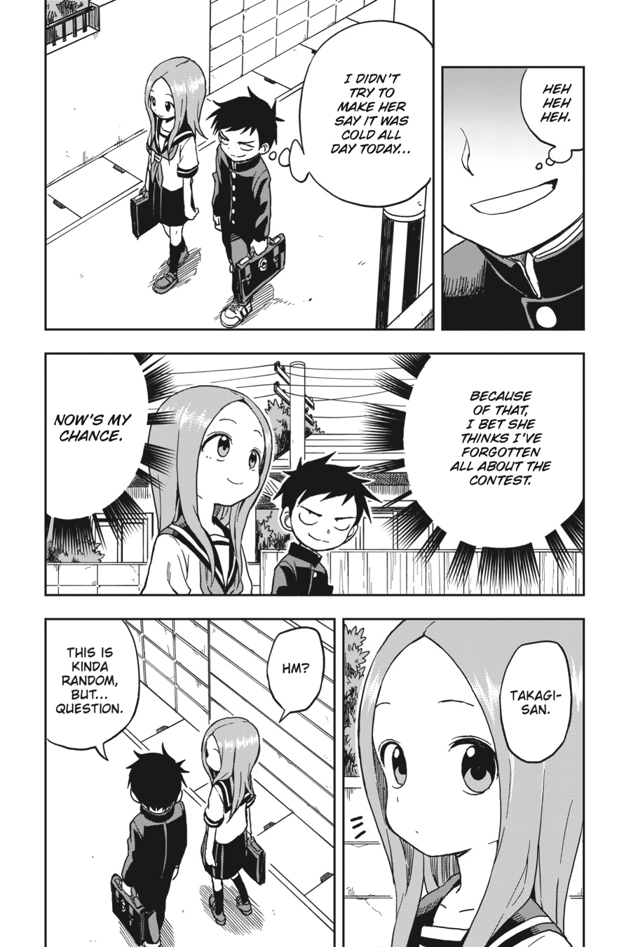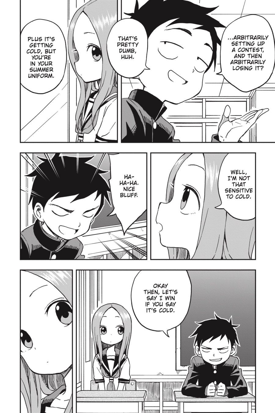 Even when Nishikata feels like he’s got the upper hand, Takagi-san never makes things easy for him. Whether he’s doing his best to make her admit she’s cold in her summer uniform, giving her a strict speech while pretending to be her teacher, or simply trying to avoid getting slapped on the back after a bad sunburn, escaping embarrassment is always a tall order! But he’s no quitter, and he can’t lose every time…can he?