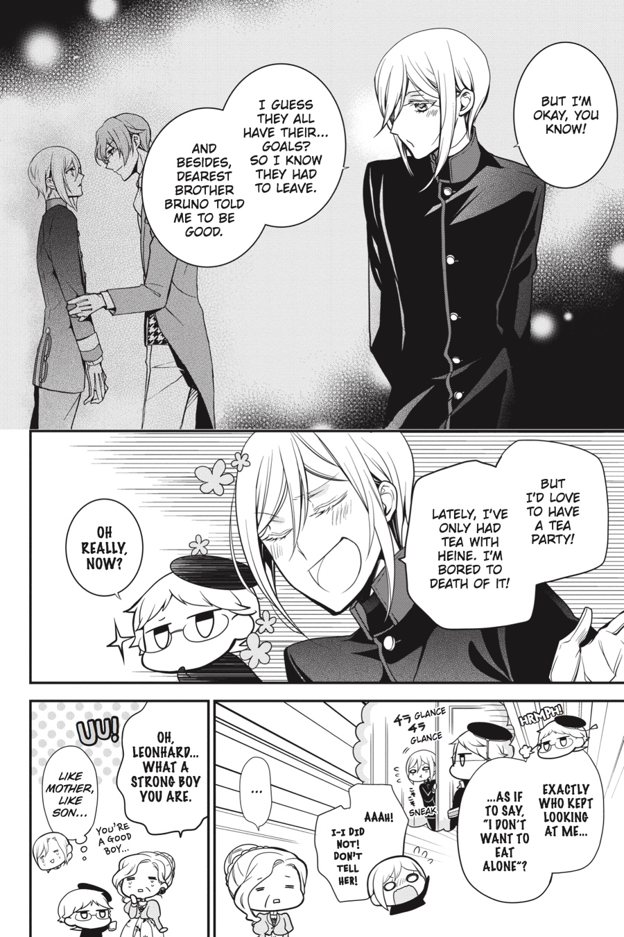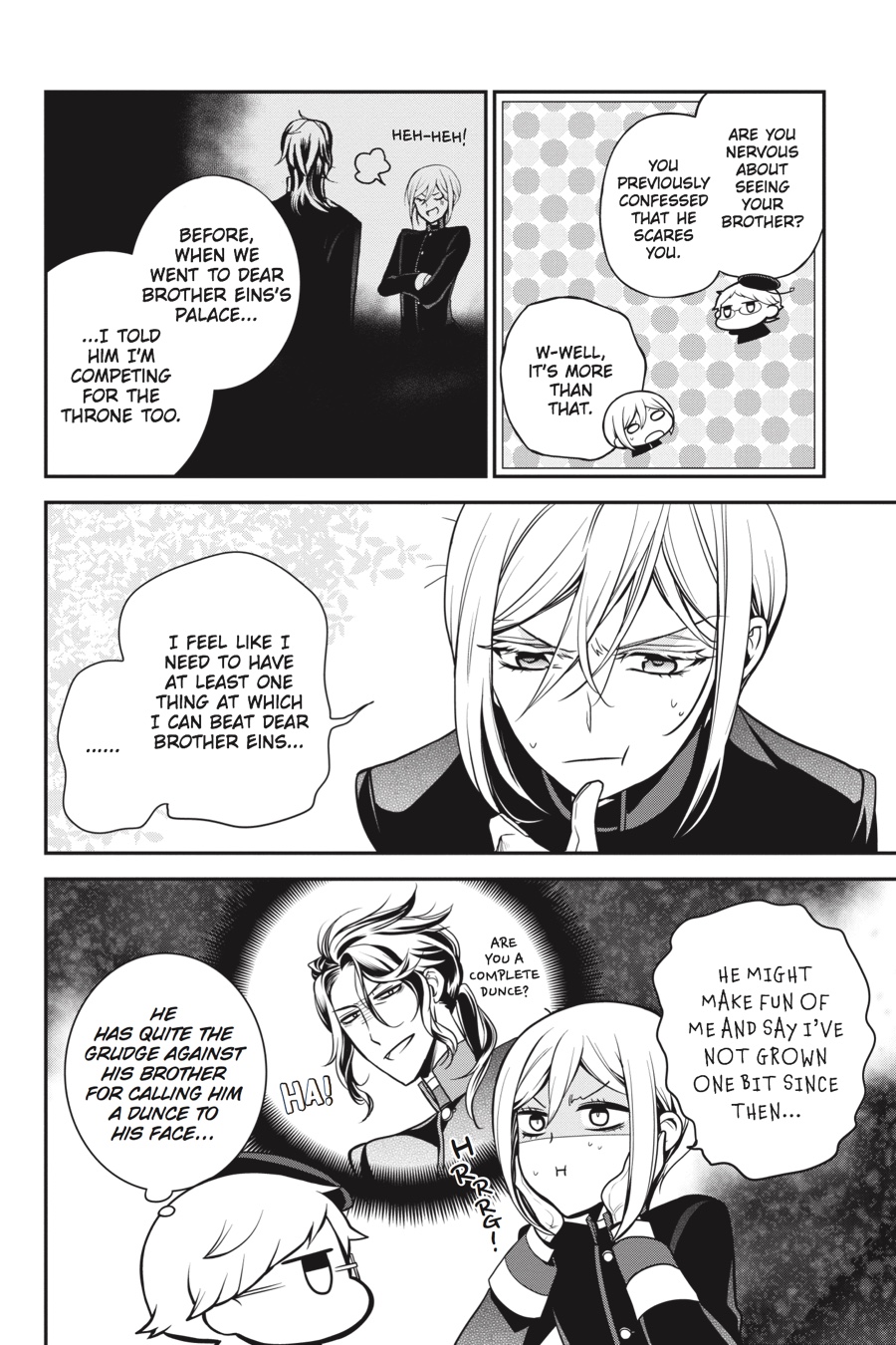 Three of the princes have left home to study away from the castle and the guidance of Heine, but Leonhard remains, still under the strict observation of the Royal Tutor! Beneath the surface of everyday life lies the fierce will to fight for the right to the throne! With change all about them, now comes the time to grow and learn...