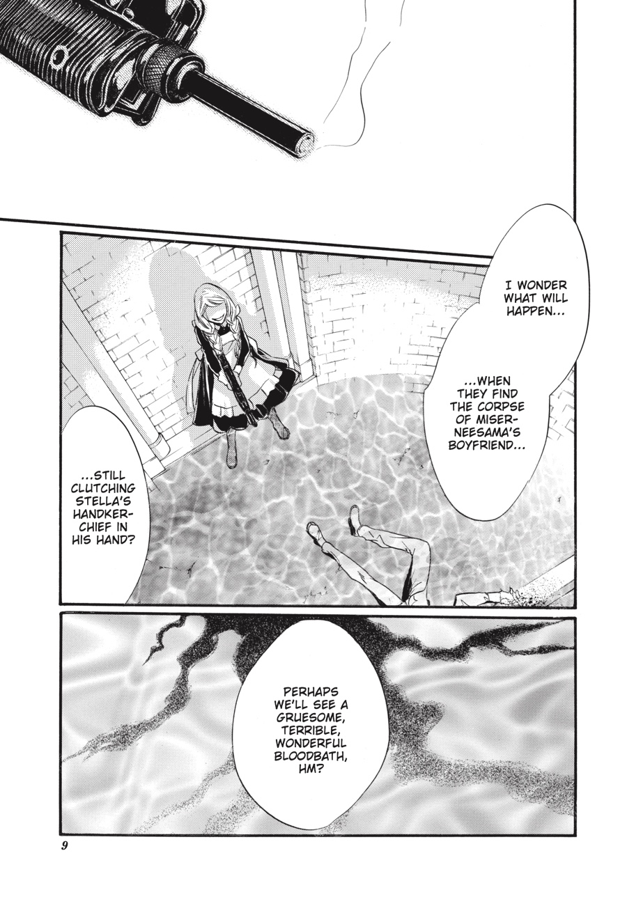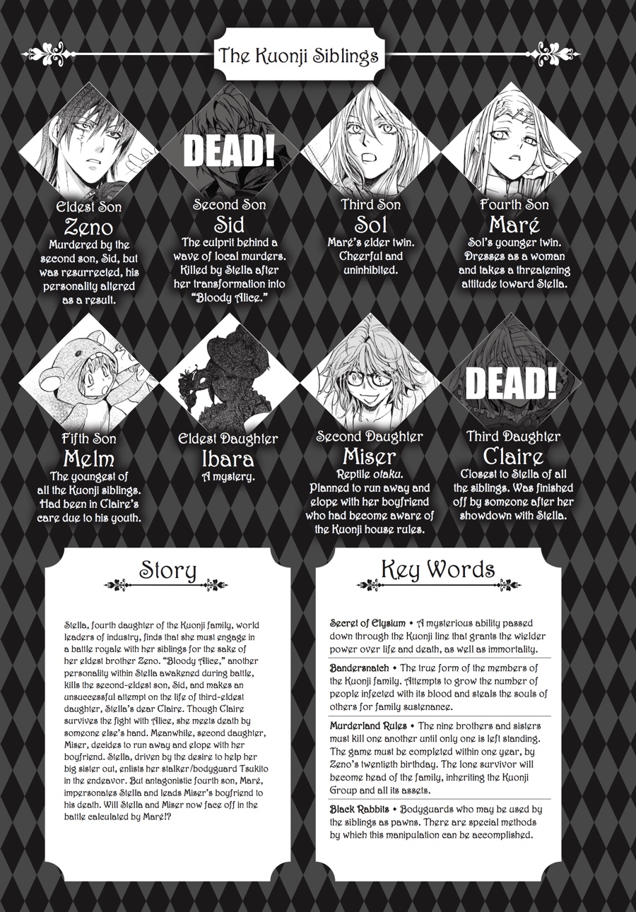 The laboratory where corpses dance... Stella remains locked in a life-or-death struggle with her siblings in order to keep her beloved brother Zeno alive. Dragged into a plot by fourth-eldest brother Mare, she now finds herself pitted against her second-eldest sister, Miser, who has awakened as the Queen of Corpses. "Let's take these kids who drank my 'blood'......and do a little experiment!" Confronted by Miser and her newfound talent for manipulating the dead, the irrepressible "Bloody Alice" makes her entrance and draws her gun--?! Welcome to the haunted party thrown by poor little Miser.
