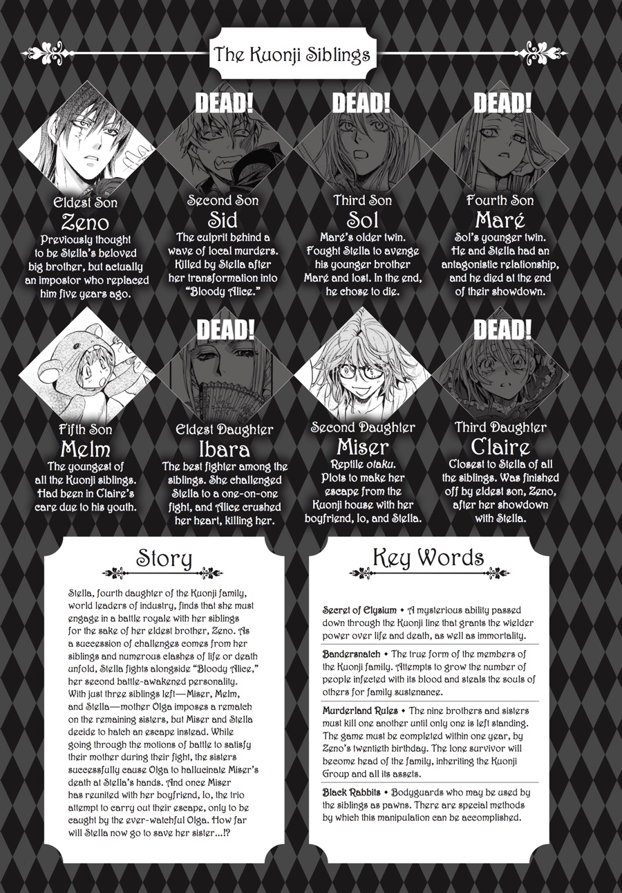 Just two Kuonji siblings remain--Stella and her baby brother, Melm. And their dance to the death is set to take place on the bones of the dead! As the curtains open on the final showdown, Stella discovers to her horror that she and Melm will be fighting in the graveyard where their siblings are buried. As the fight gets underway, Stella glimpses dead sister Claire, and sweet Melm's personality changes entirely! And in the heat of battle, the veil is ripped from the dark secret of the littlest Kuonji!
