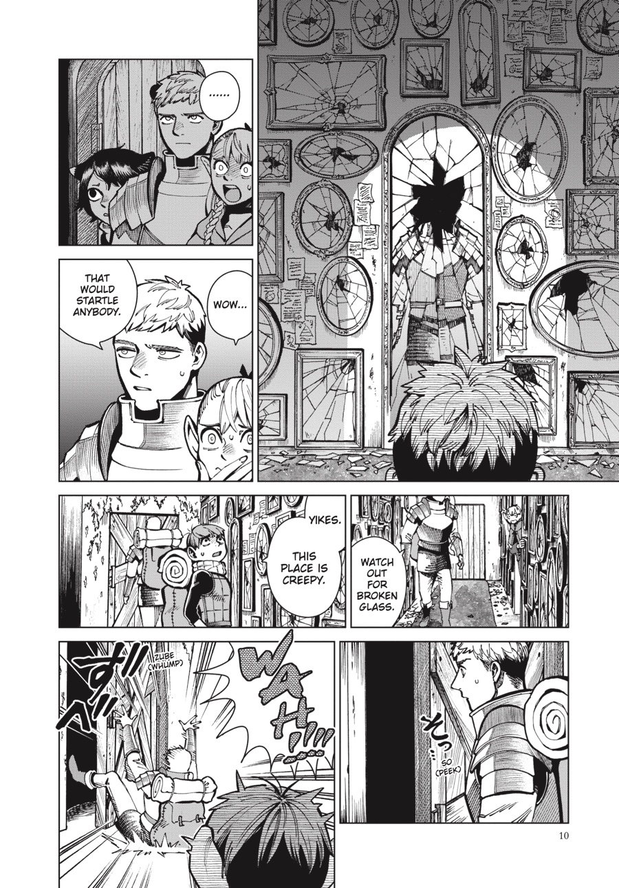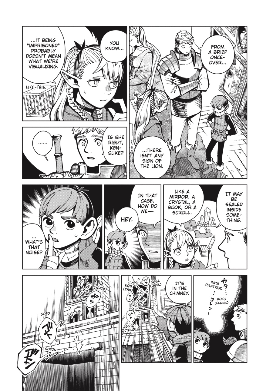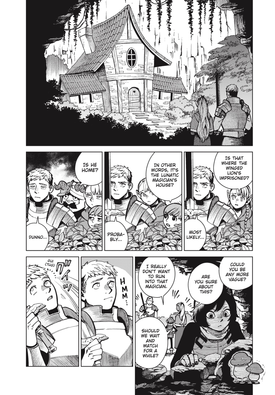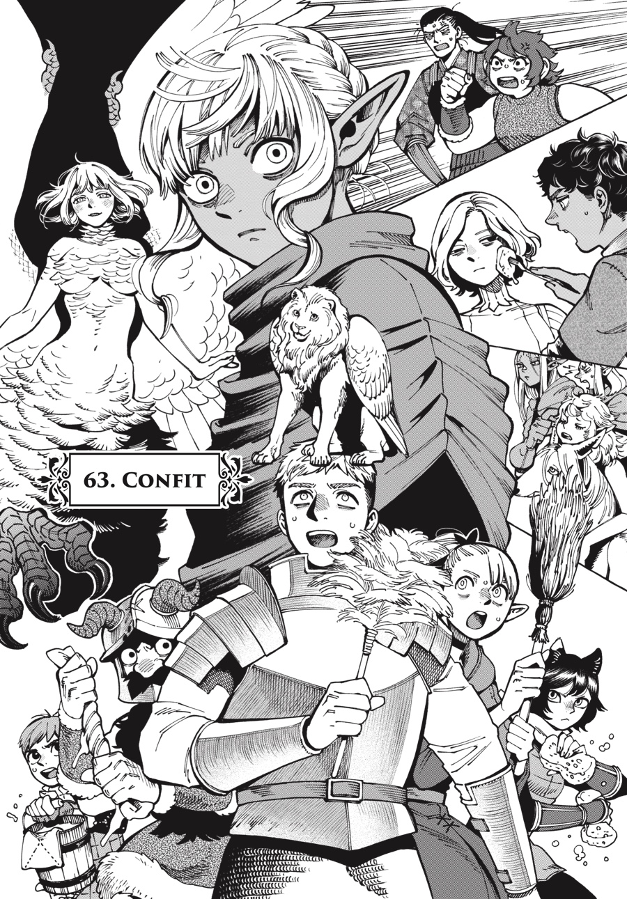 It’s eat or be eaten...literally! Led to Sissel’s threshold by the winged lion imprisoned within it, Laios and friends steel themselves for…some heavy-duty cleaning?! Sissel’s seemingly innocuous cottage is piled with clutter, hindering both their search for the lion and their meal prep! Once satiated, the party hastily lays plans for Falin’s rescue. However, here in the depths of the dungeon, even the cutest residents have a vicious streak a mile wide!