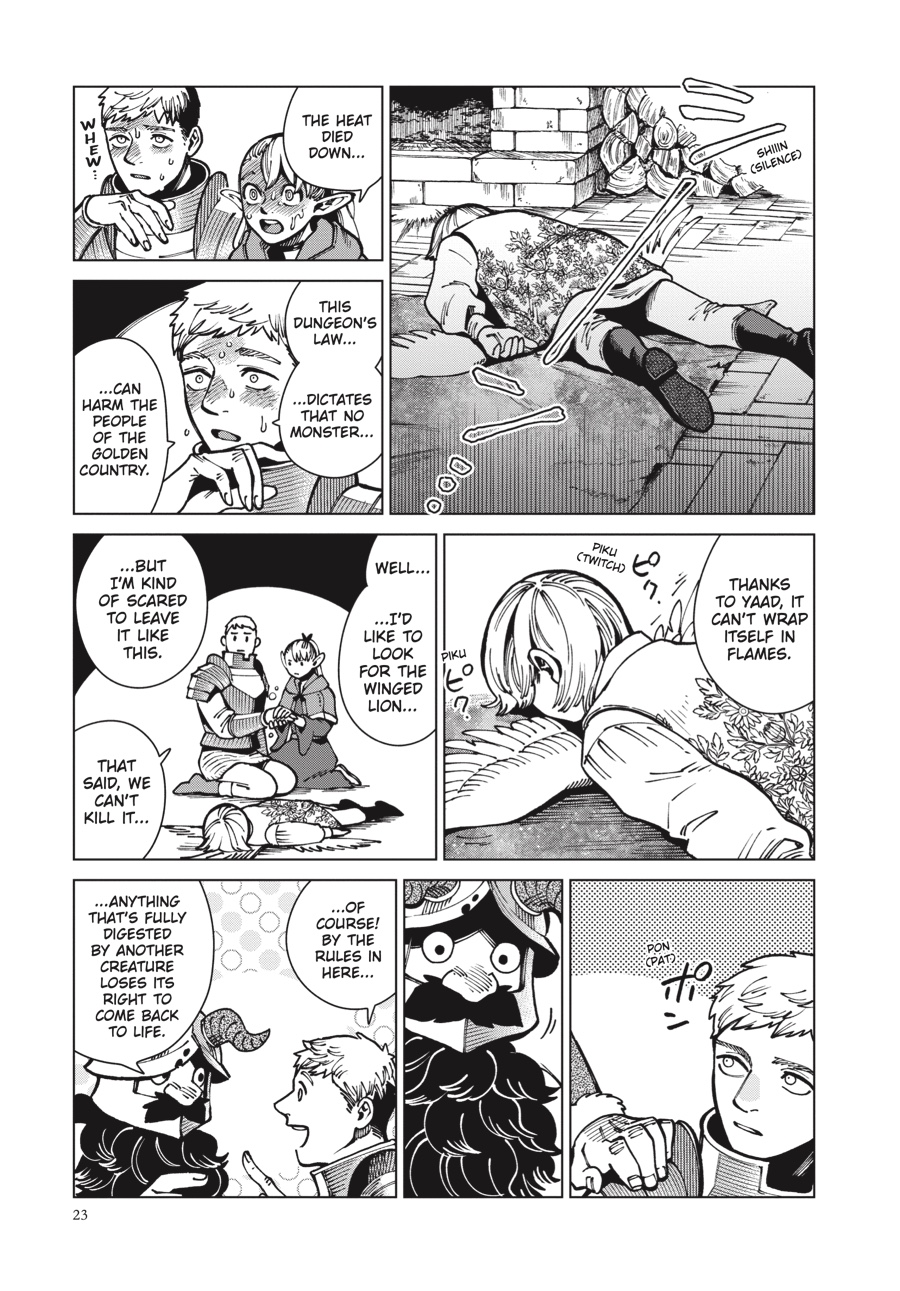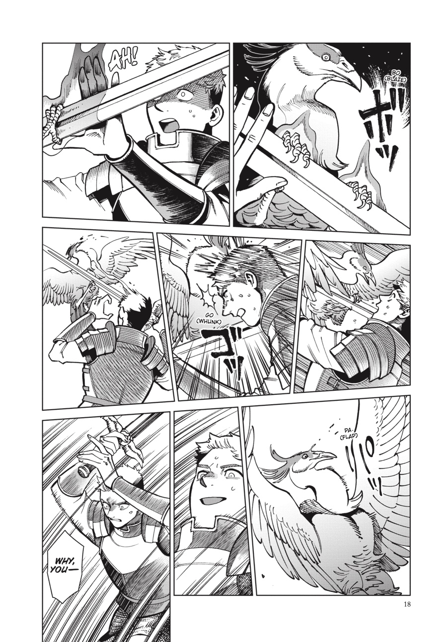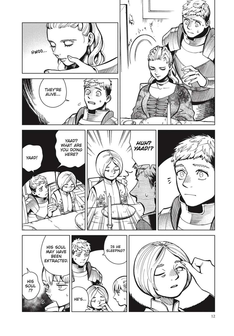 It’s eat or be eaten...literally! Led to Sissel’s threshold by the winged lion imprisoned within it, Laios and friends steel themselves for…some heavy-duty cleaning?! Sissel’s seemingly innocuous cottage is piled with clutter, hindering both their search for the lion and their meal prep! Once satiated, the party hastily lays plans for Falin’s rescue. However, here in the depths of the dungeon, even the cutest residents have a vicious streak a mile wide!