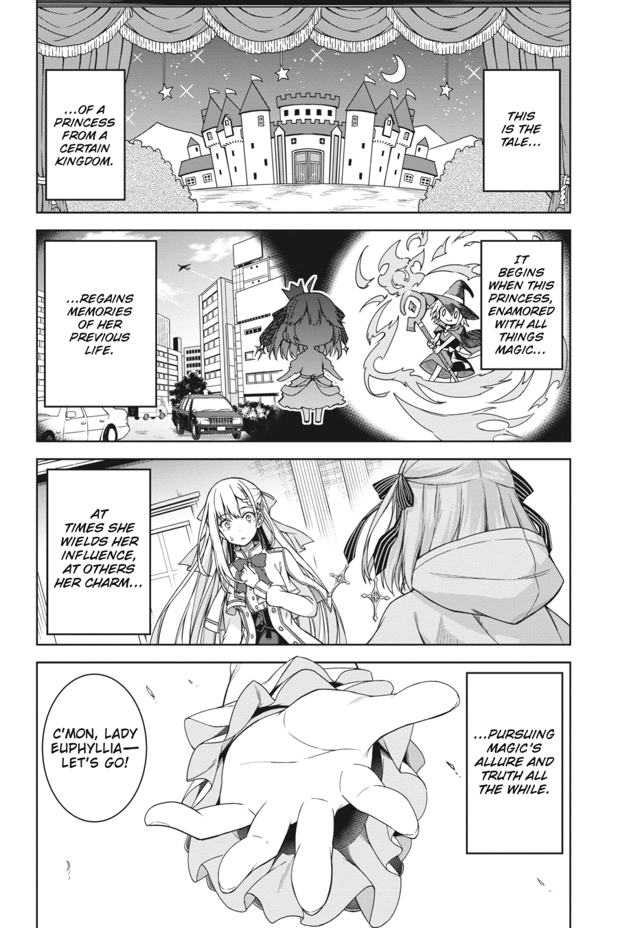 Princess Anisphia may not be able to use magic, but she didn’t let that stop her from developing “magicology,” a unique theory based on memories from her past life. While testing out her new flying broom, she happens across Euphyllia, a magical genius, having her engagement unjustly and publicly broken off. Seeing the tears in Euphyllia’s eyes, Anisphia takes the obvious course of action—kidnapping the girl for herself!