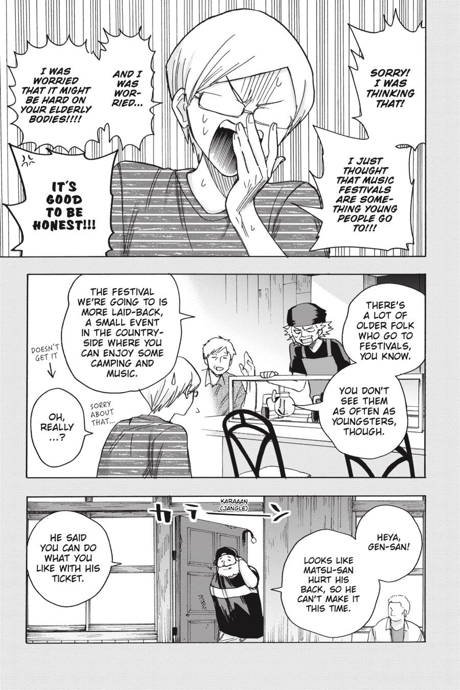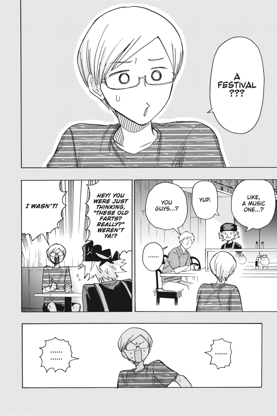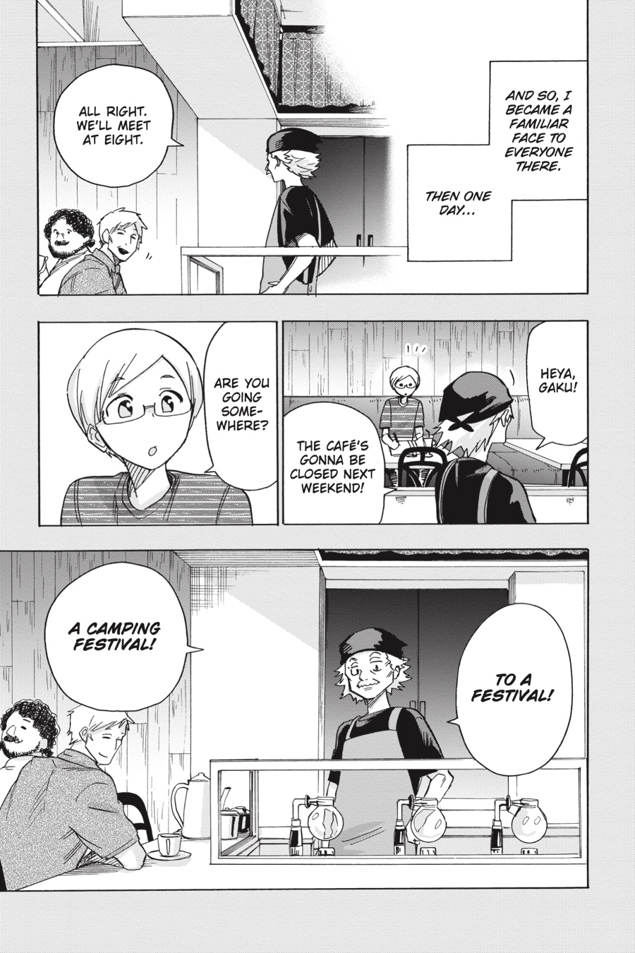 Take a peek into the past as Gaku recalls his first music festival! After stumbling upon a café that shares his name, he’s invited by the elderly owner to come along to an overnight camping festival. Gaku doesn’t know what to expect, but his heart is stolen by the sights and sounds he finds there…!