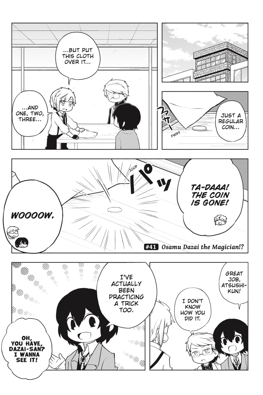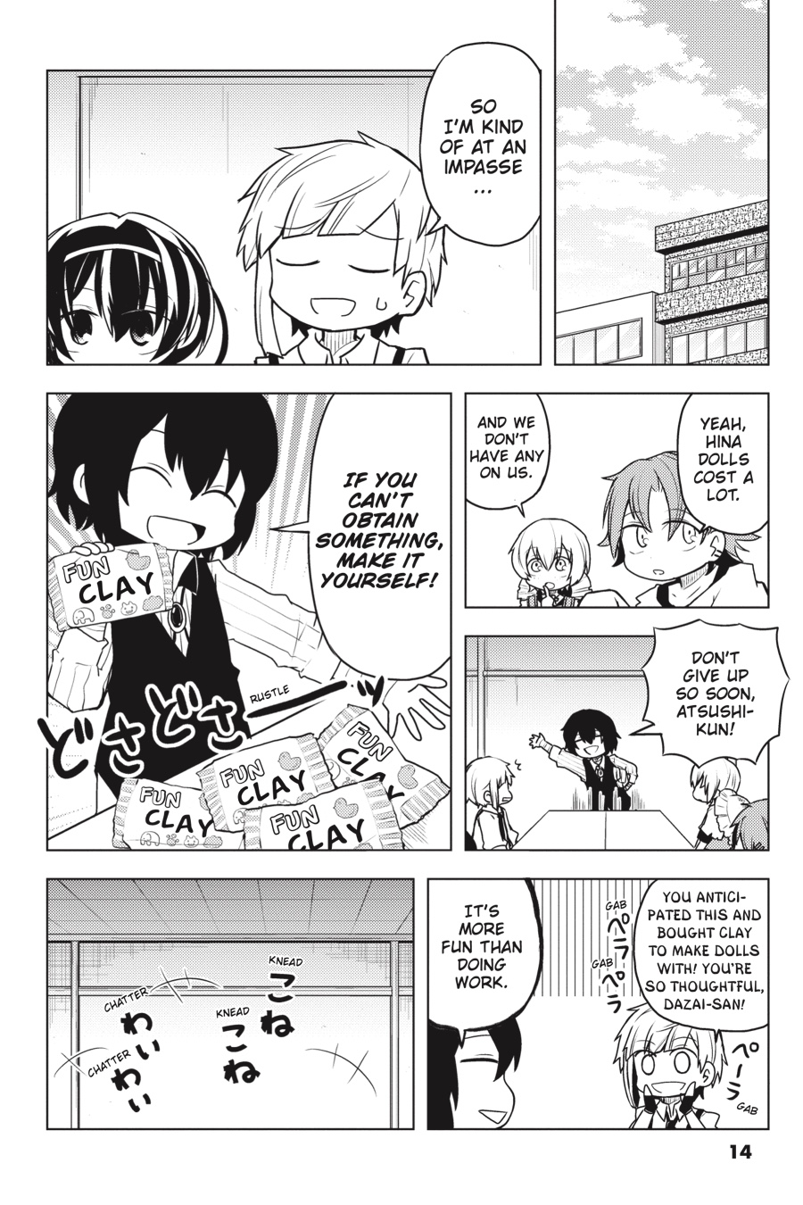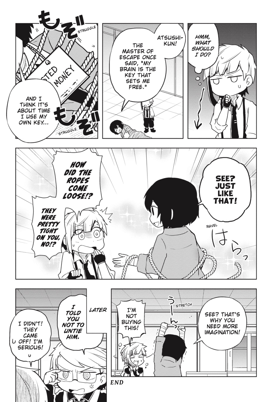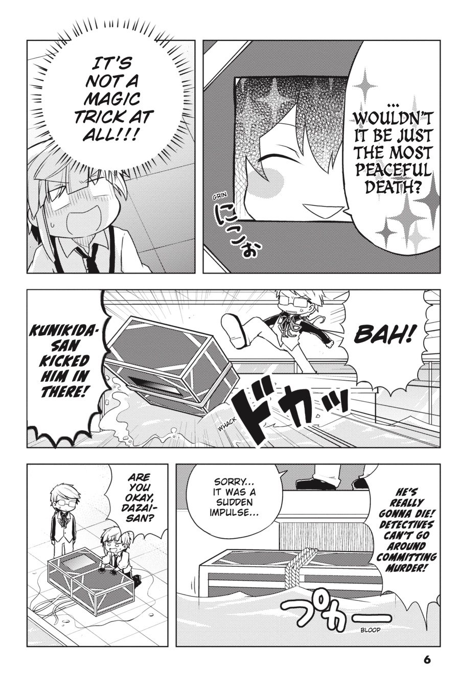 It ’s another peaceful day in Yokohama, but the Armed Detective Agency and the Port Mafia are staying busy. Whether it ’s Dazai per forming his best magic tricks, the Mafia trying to find a body double for the boss, or the two organizations holding a joint spor ts festival, these heartwarming (?) stories from the world of Bungo Stray Dogs are sure to put a smile on your face!