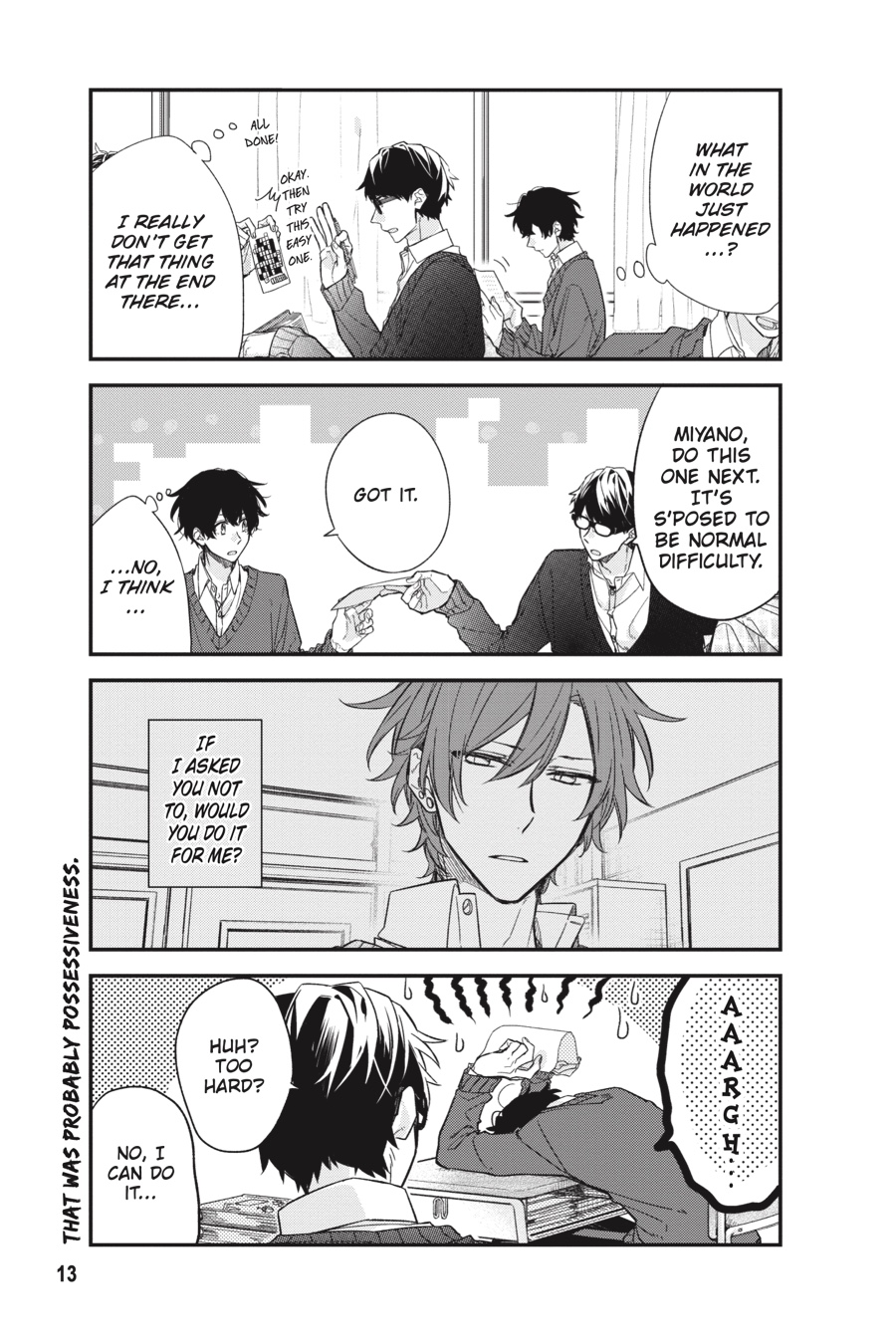 Sasaki is...Sasaki is what to me? A heated exchange between the two leads to absolutely nothing. Well, Miyano isn’t living in a BL story, so that’s fine, right? Except Miyano feels like he’s going to explode, because he can’t stop thinking about hugging his upperclassman...and taking care of him...What does it mean to like someone anyway?