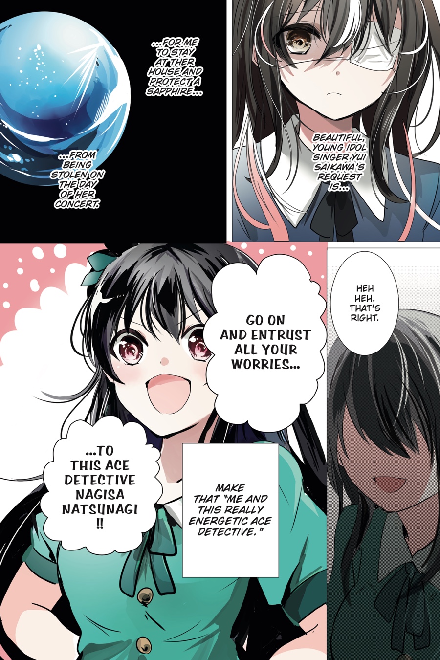 Due to my penchant for getting dragged into things, I, Kimihiko Kimizuka, an ordinary high-school student, suddenly was asked to protect national idol Yui Saikawa's Three-billion-yen sapphire!? When there's a detective, there's always a case, and so, another case begins for me and Siesta’s heart’s recipient, Nagisa Natsunagi!
