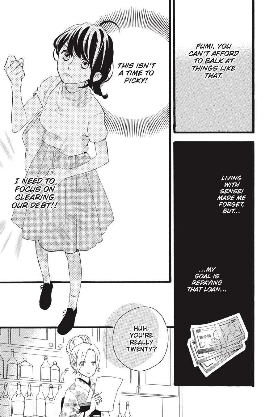 When Fumi started her job as the live-in housekeeper for the acclaimed—and very crabby—author Akatsuki Kibikino, she never thought in a million years that she’d get along with him...yet here she is, her heart fluttering at every tiny gesture! Not that she’s got time to dwell on what it could all mean—with the new kid at school treating her like a gofer, her dad stuck in bed with an injury, and the ever-present loan looming over her head, Fumi’s got more than enough on her plate! If only there was some way to earn lots of money in a short amount of time…