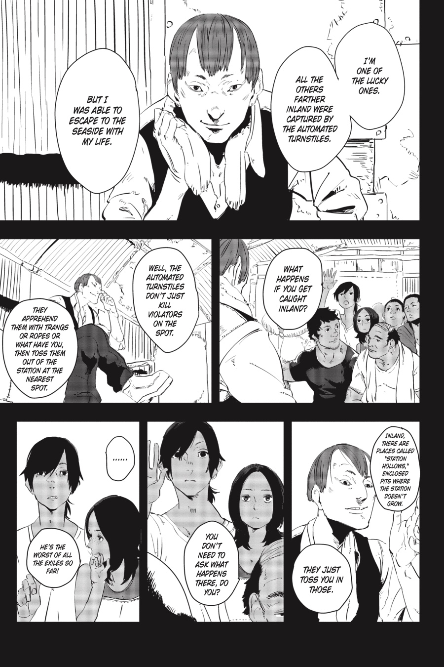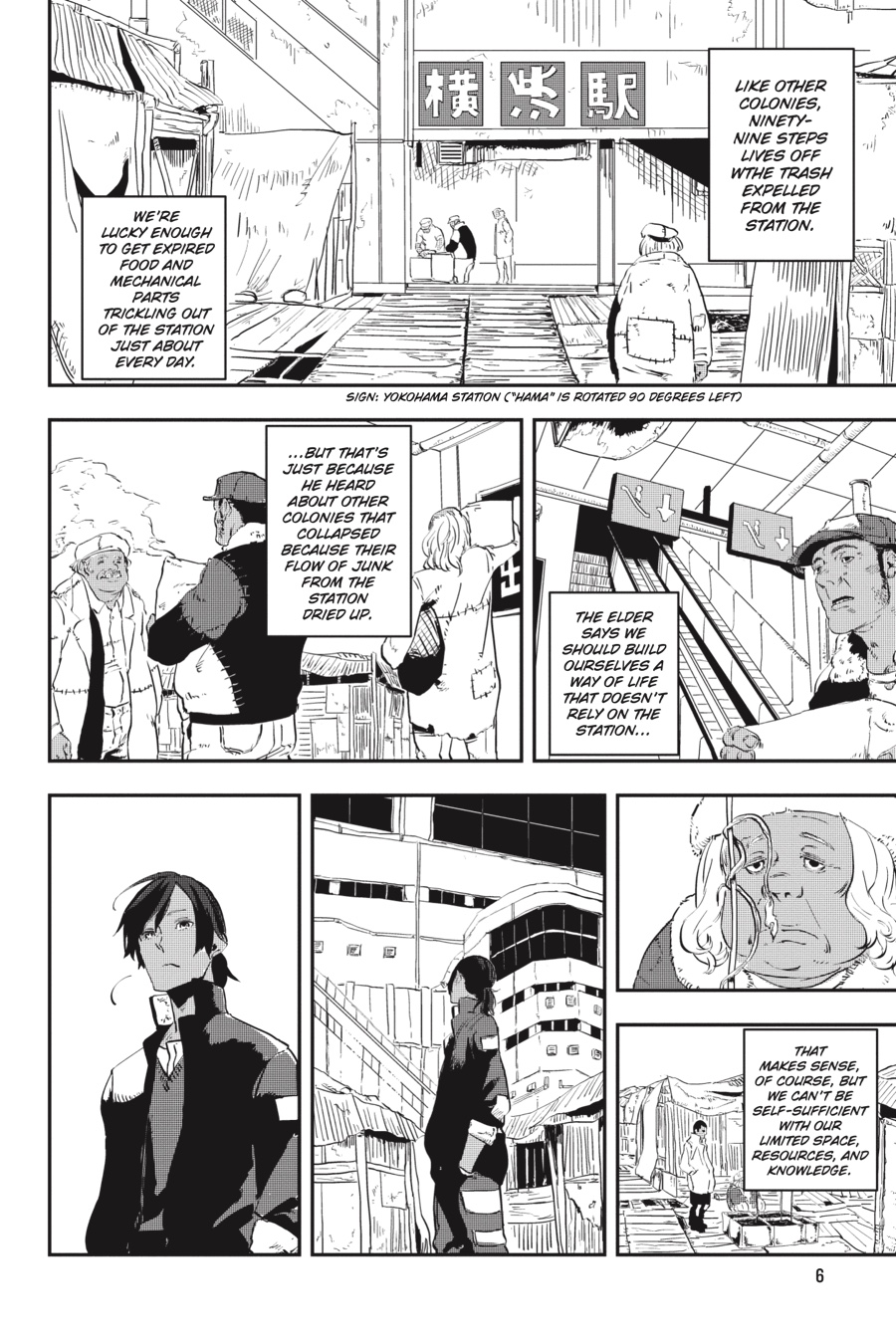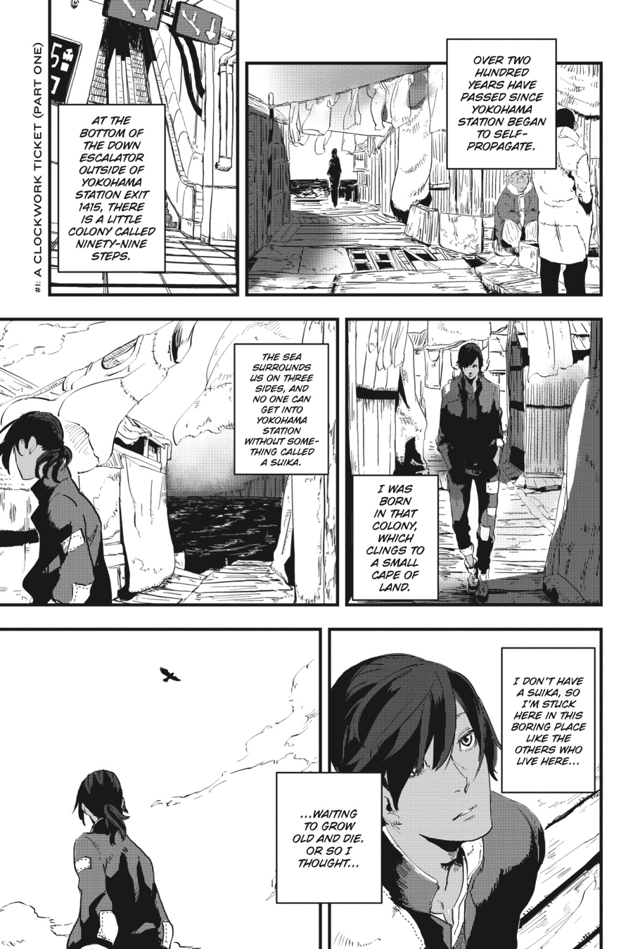 Two hundred years ago, Yokohama Station, which had been under constant construction, developed the ability to self-propagate. Now with nearly all Honshu, the mainisland of Japan, consumed by the growing station, the population has been split into two groups: those who live inside the sprawl with fare cards embedded in their brains and the few who persist on the remaining scraps of untouched land. Hiroto has lived his whole life on the outside, but when an exile from the station entrusts him with a mission and a ticket, he ventures into the ominous belly of the beast for the first time…