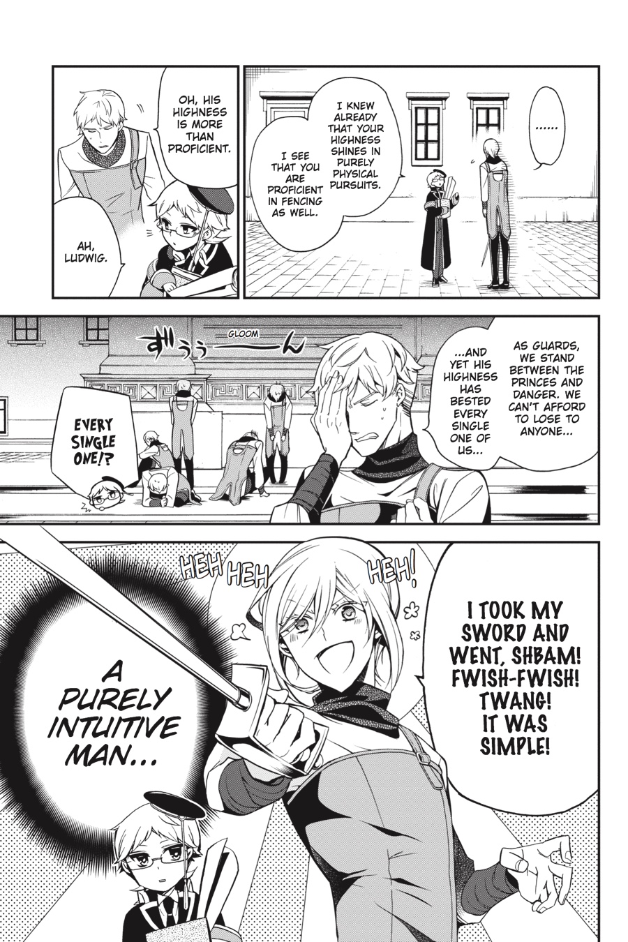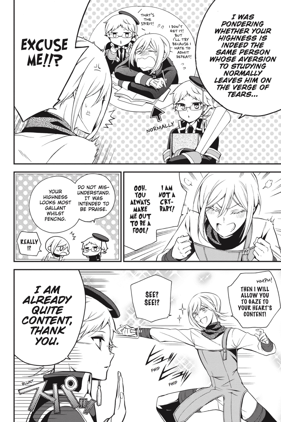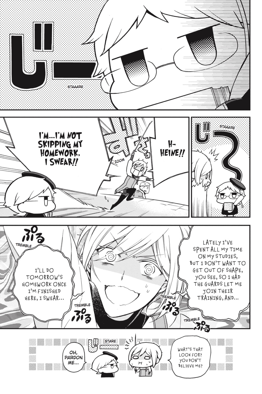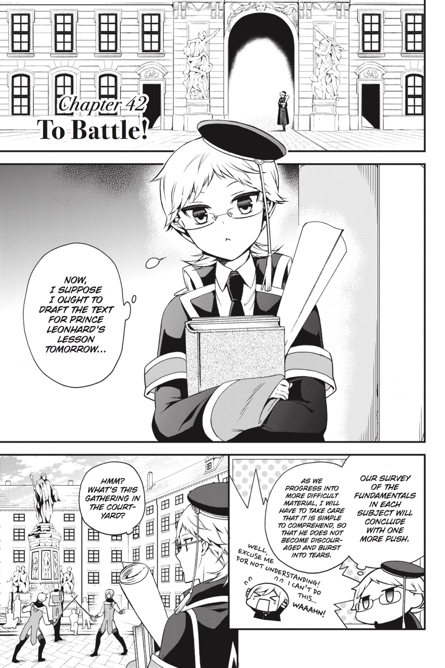 Kai makes a friend at school and invites him over to the palace for tea. He asks his brothers for help in making conversation, but is that really such a good idea...? Then it's a battle of wits when Heine joins the princes (and princess!) for a game in the courtyard. After all the time they've now spent under his tutelage, can the students finally overcome the master?