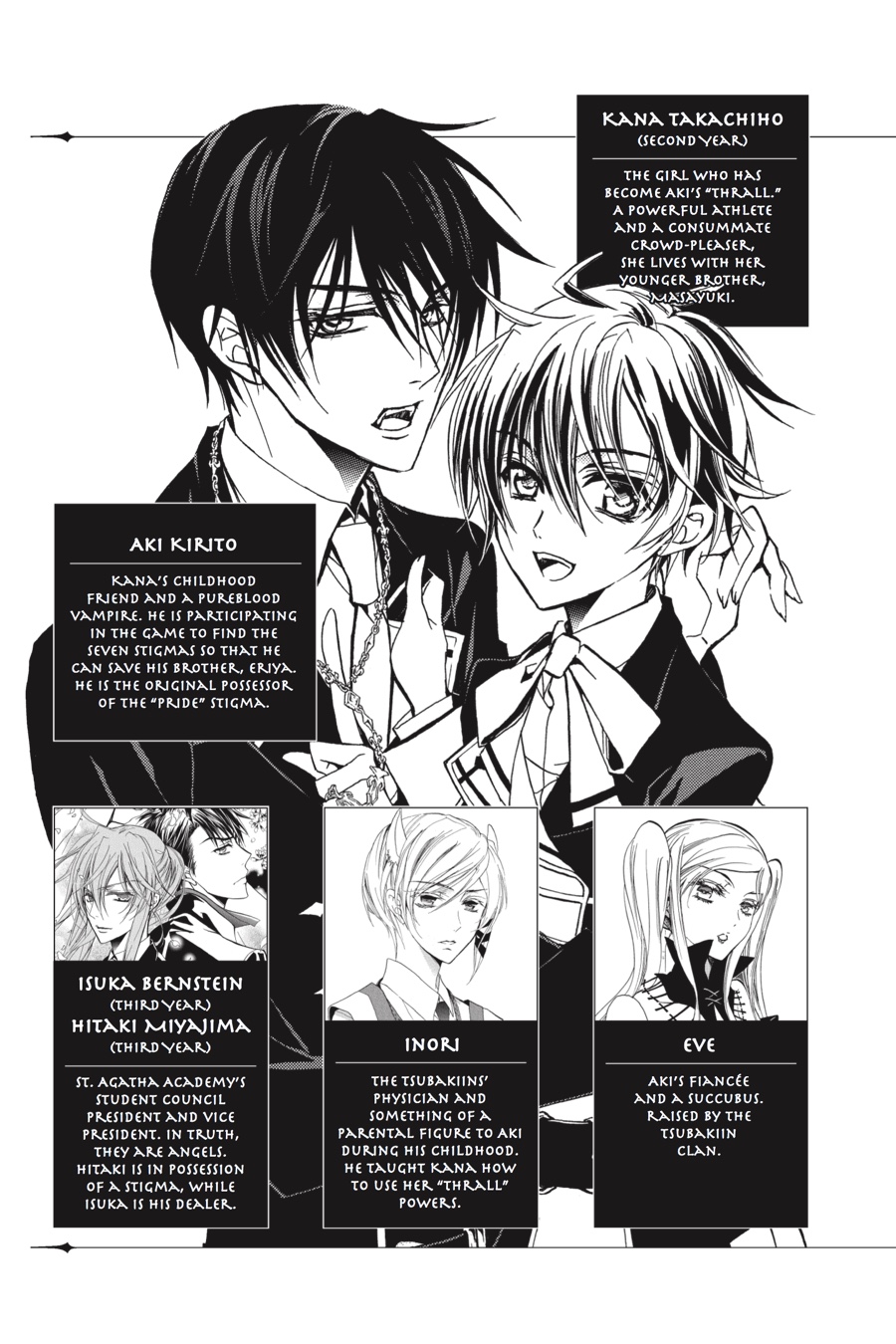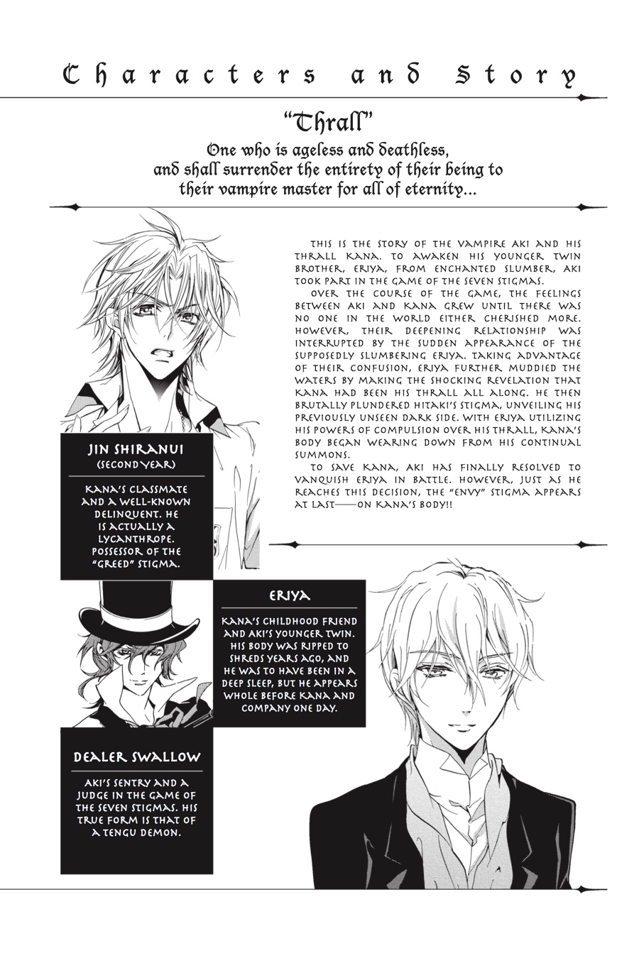 Born together and locked in endless struggle...that leaves us but one fate... Envy, the final Stigma appears at last...on Kana! To protect her, Aki resolves to battle Eriya in earnest and sets out for Tsubakiin Manor. The tale of the love and blood red bonds shared by the beautiful vampire twins and their thrall comes to a thrilling conclusion!