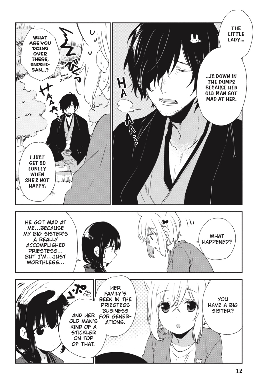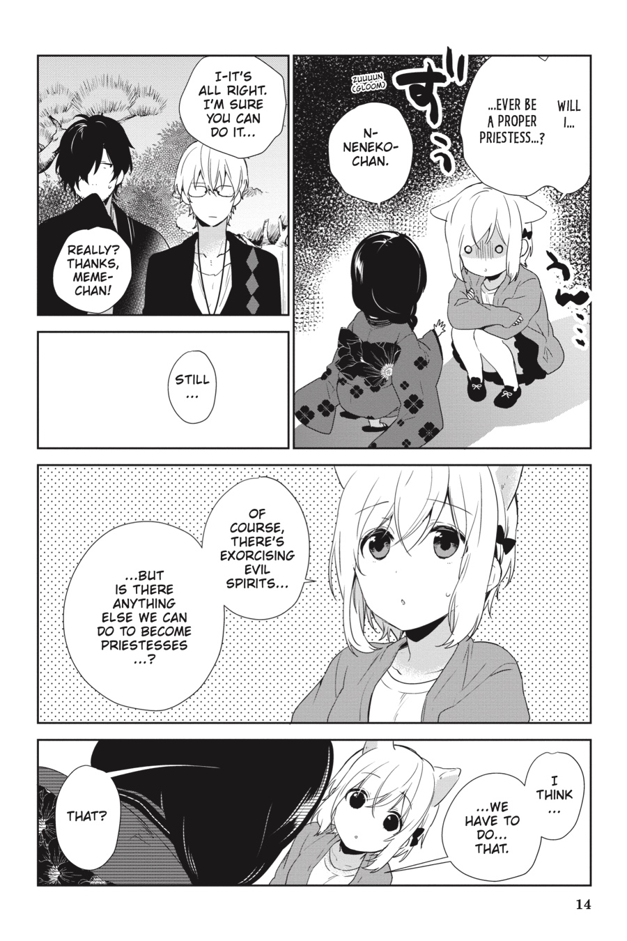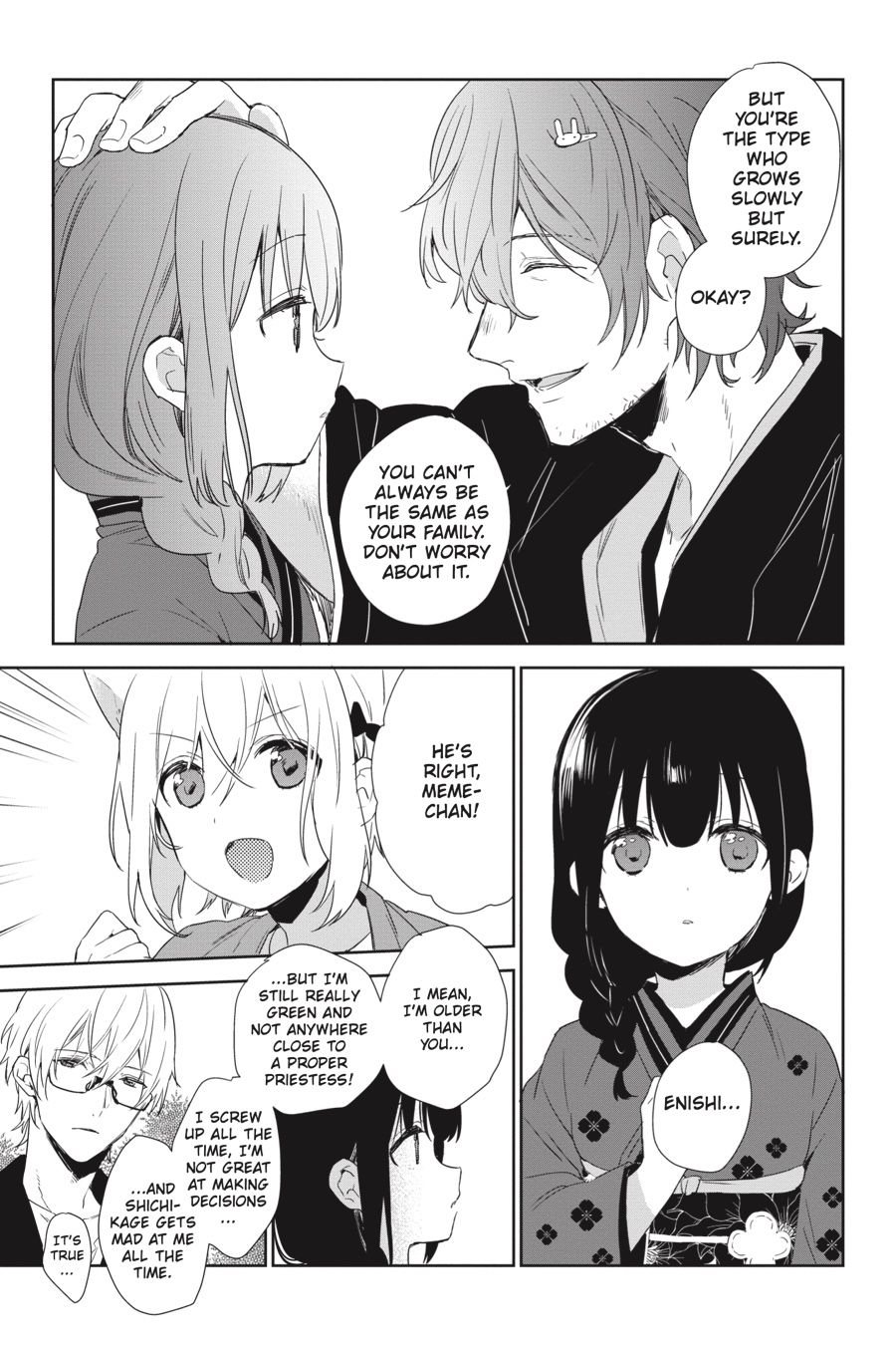 Life’s been rough for Meme. She’s always getting picked on at school, and she still has doubts about her abilities as a priestess. Unable to sit back and watch, Mirai takes matters into his own hands, offering to personally train her. But everything changes when the boy who’s been picking on Meme ends up drawing the ire of a group of spirits! Will Meme choose to save him, or will this bully be left to reap what he’s sown?