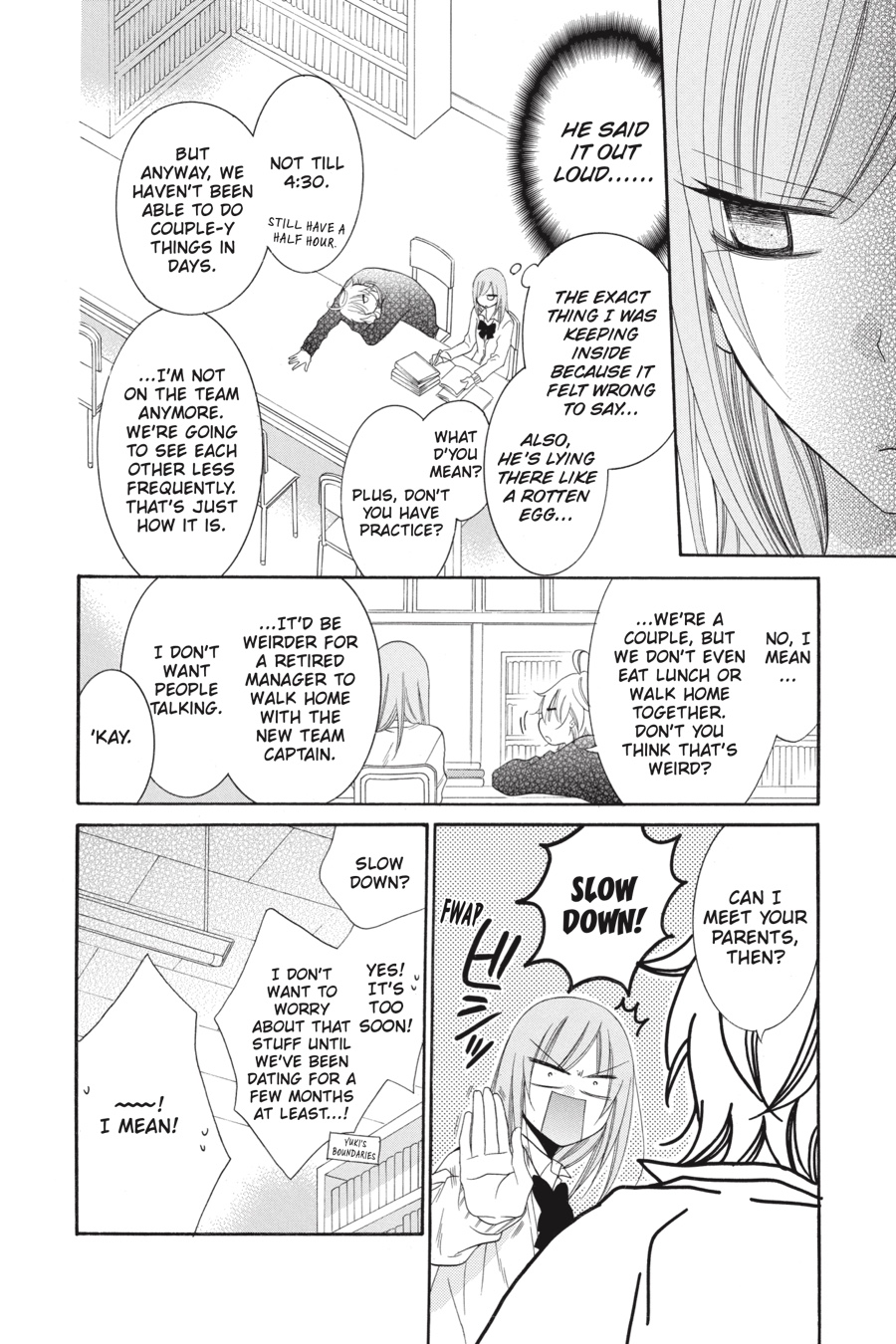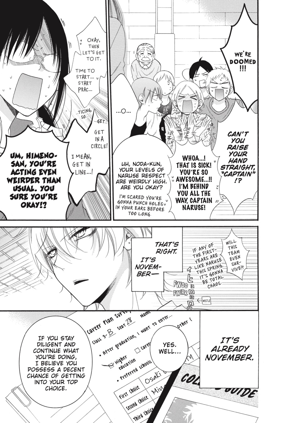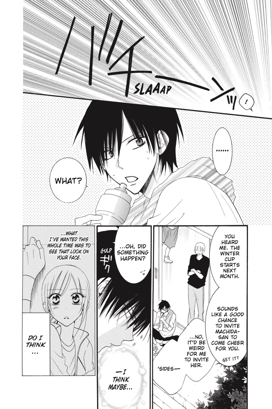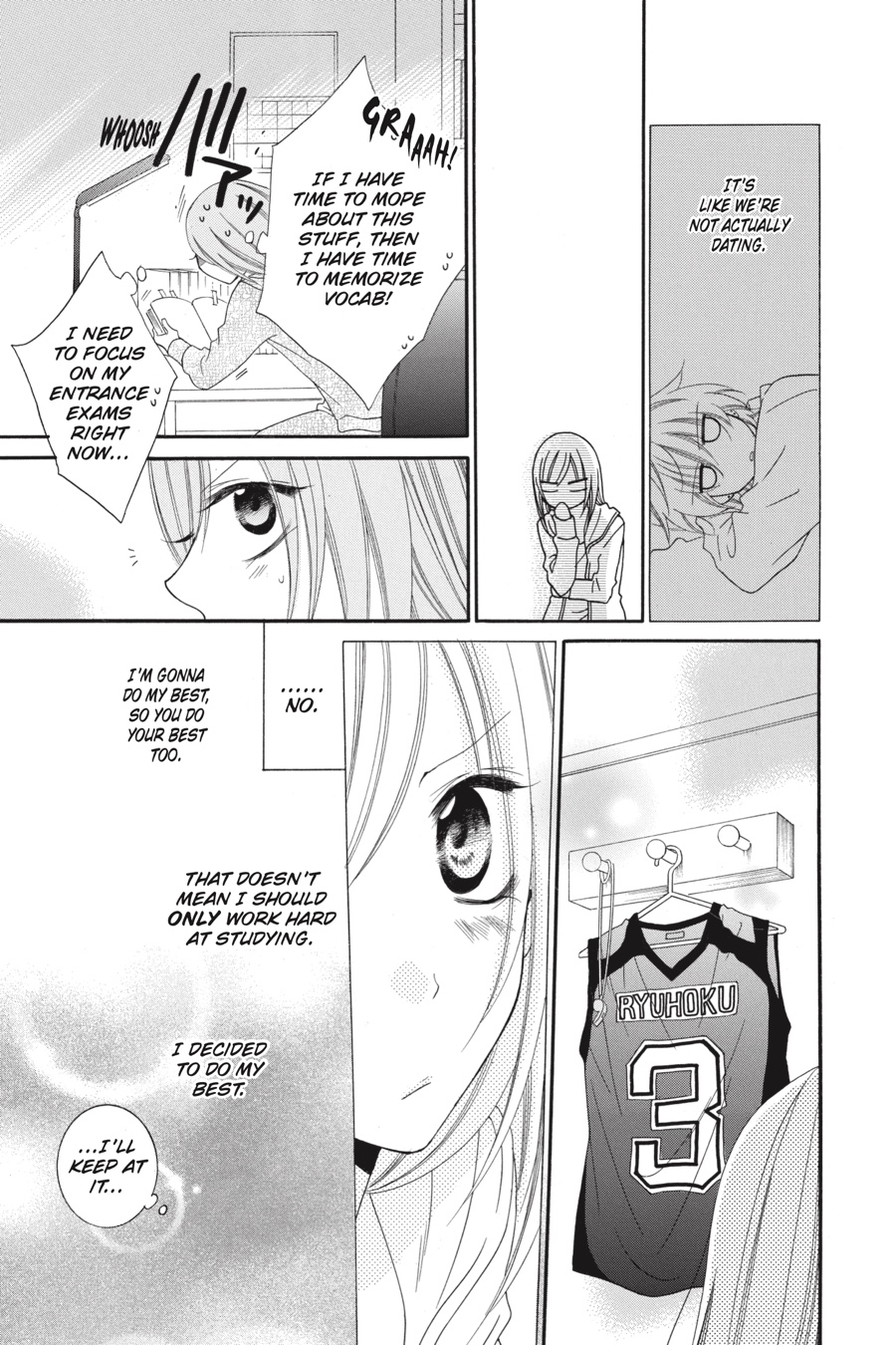 Urrrrgh! Hakamada-kun crushed our dream of winning the Winter Cup, so my tenure as the basketball team’s manager is over…But that just means it’s time for the next phase of my life—exam season. And now, because Naruse’s been busy with his new captaincy and I’ve been swamped with studying, I hardly ever see him anymore. I kind of mi—No, get a grip! Well, I guess if that cheeky brat insists, then maybe, just maaaybe, we can go on our first official date…