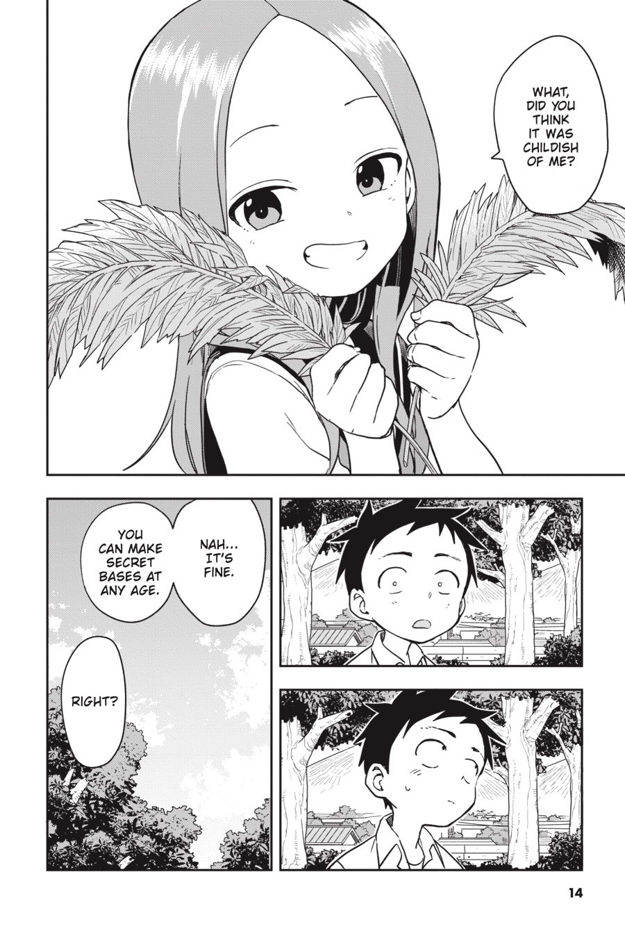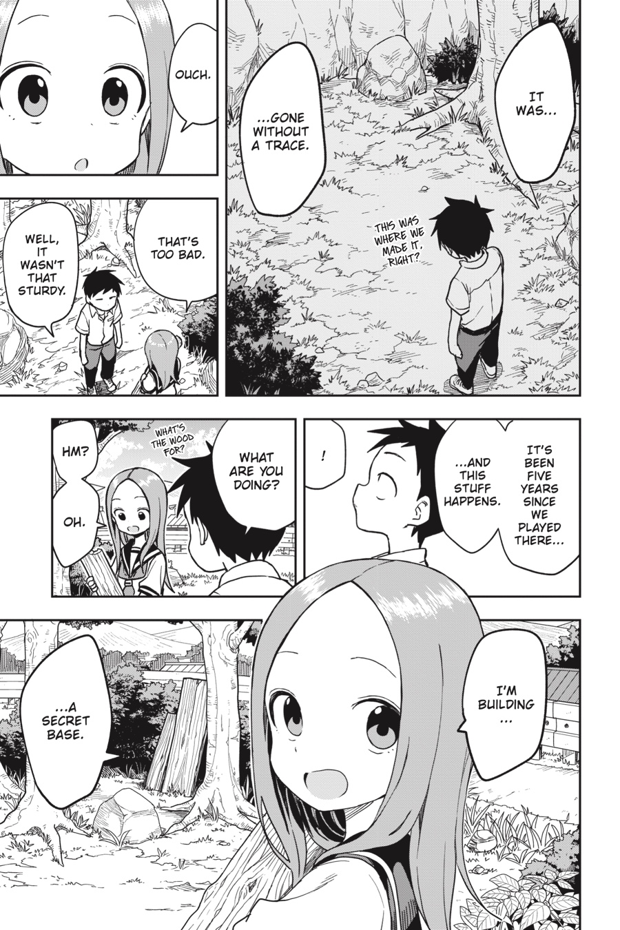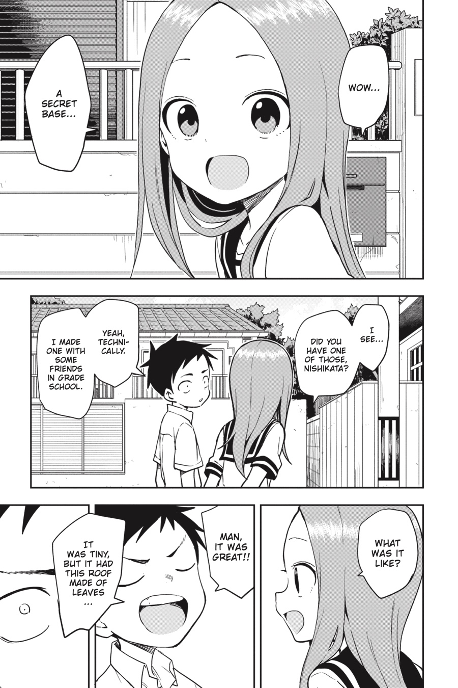 Nishikata and Takagi-san revisit the joys of childhood by building a secret base. Even if Nishikata still can’t compete with Takagisan’s mind games, at least she can’t tease him for being a kid anymore. He’s grown a ton in strength and confidence, so Nishikata has gotta win one of these days!