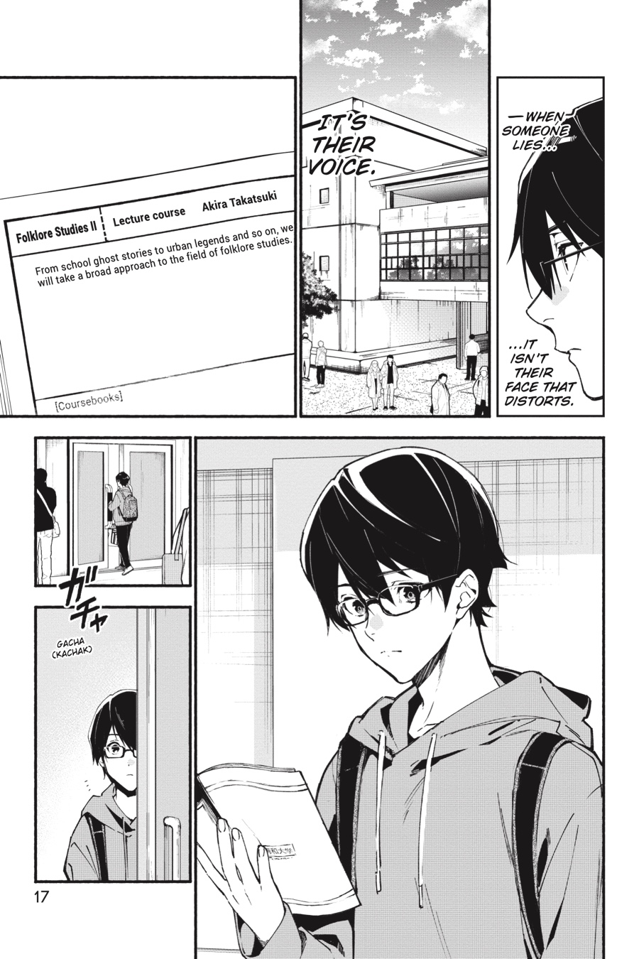 Naoya Fukamachi’s ability to unerringly detect lies has left him friendless and isolated all his life. It certainly isn’t helping him meet new people in college. But when he catches the interest of the handsome but eccentric associate professor of folklore studies, Akira Takatsuki, he finds himself with a part-time job- research assistant in charge of common sense, on a mission to help catalogue the supernatural!