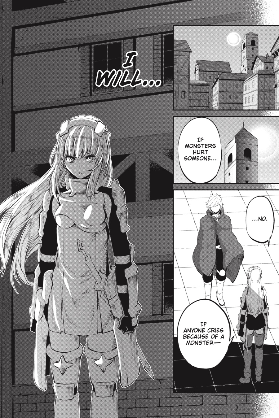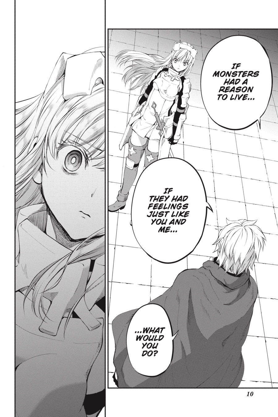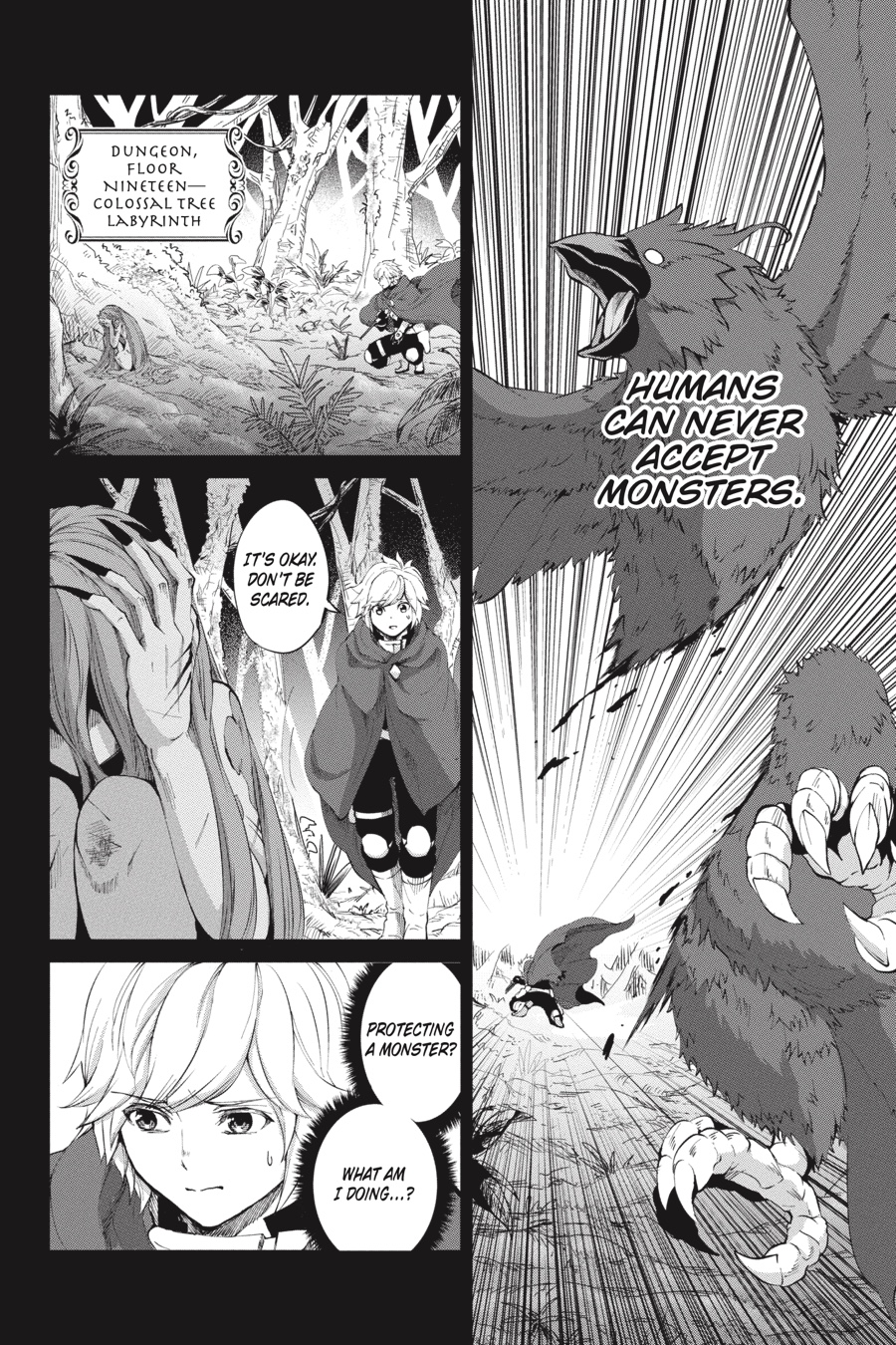 Monsters. Fundamentally different from humans and beasts, these loathsome creatures make their homes underground. To Aiz, such beings only exist to be destroyed, so when they suddenly appear in Orario, she doesn’t hesitate to leap into action. As chaos erupts in the streets, Loki Familia rises to quell the onslaught, only to find Bell Cranell standing in its way. Bell seeks to protect the rampaging monster behind him, but in order to do so, he’ll have to go up against Aiz herself...