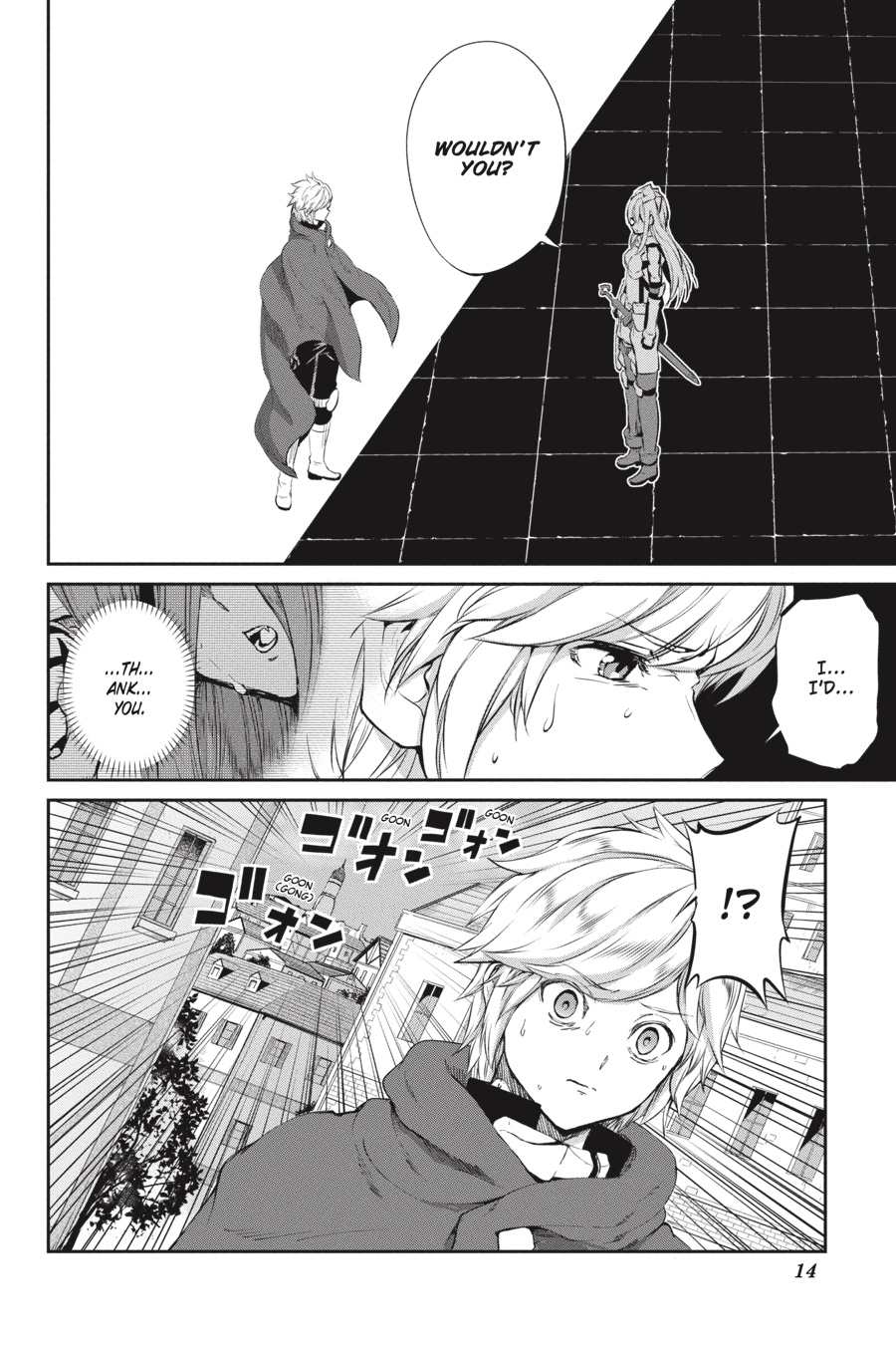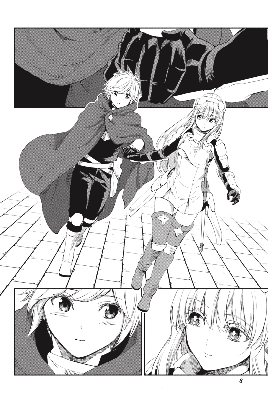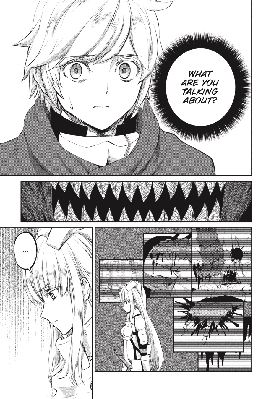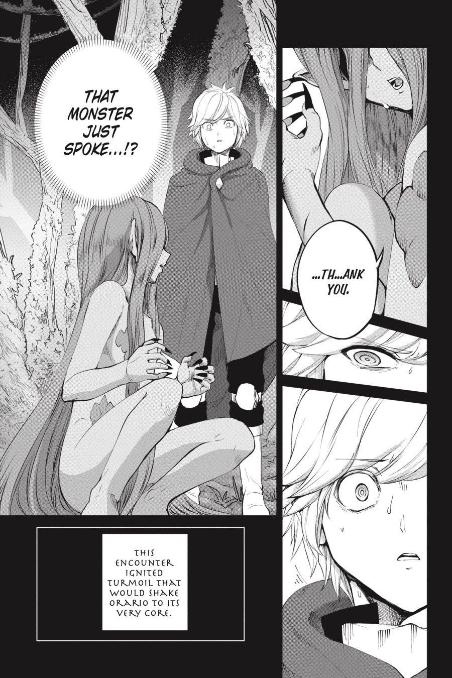 Monsters. Fundamentally different from humans and beasts, these loathsome creatures make their homes underground. To Aiz, such beings only exist to be destroyed, so when they suddenly appear in Orario, she doesn’t hesitate to leap into action. As chaos erupts in the streets, Loki Familia rises to quell the onslaught, only to find Bell Cranell standing in its way. Bell seeks to protect the rampaging monster behind him, but in order to do so, he’ll have to go up against Aiz herself...