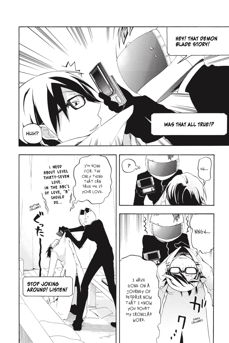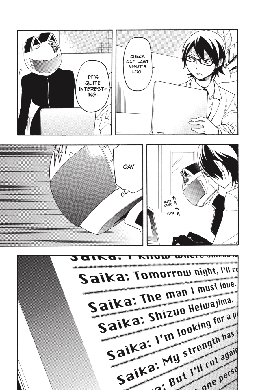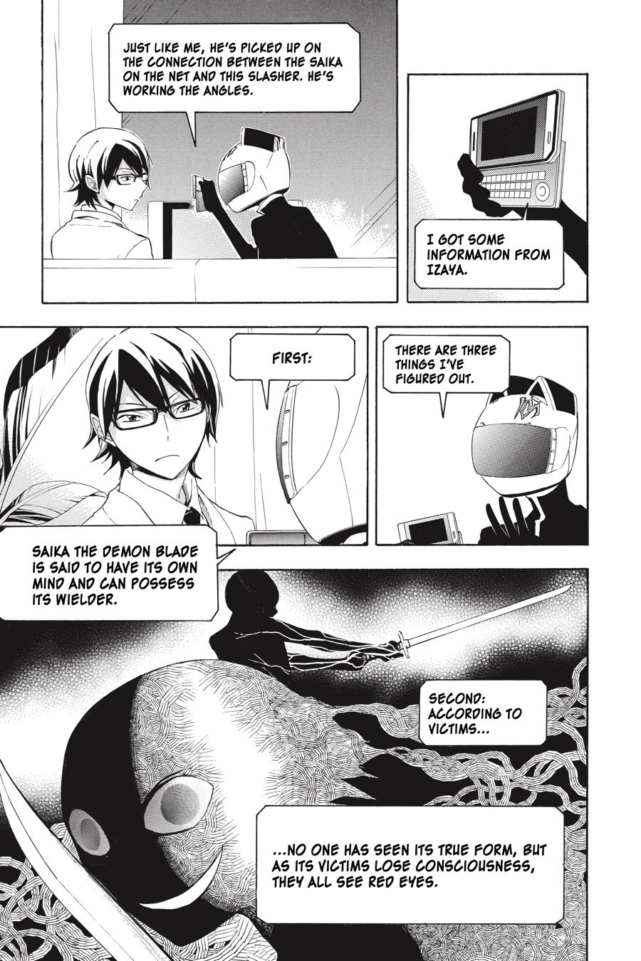 A mysterious serial slasher has struck in Ikebukuro. The username "Saika" appears in online chat rooms in sync with the attacks. Saika-the name of the demon blade that appeared in Shinjuku years and years ago... In its chat room posts, Saika repeats one name over and over again, as though singing the praises of its beloved: Shizuo Heiwajima, Shizuo, Shizuo...