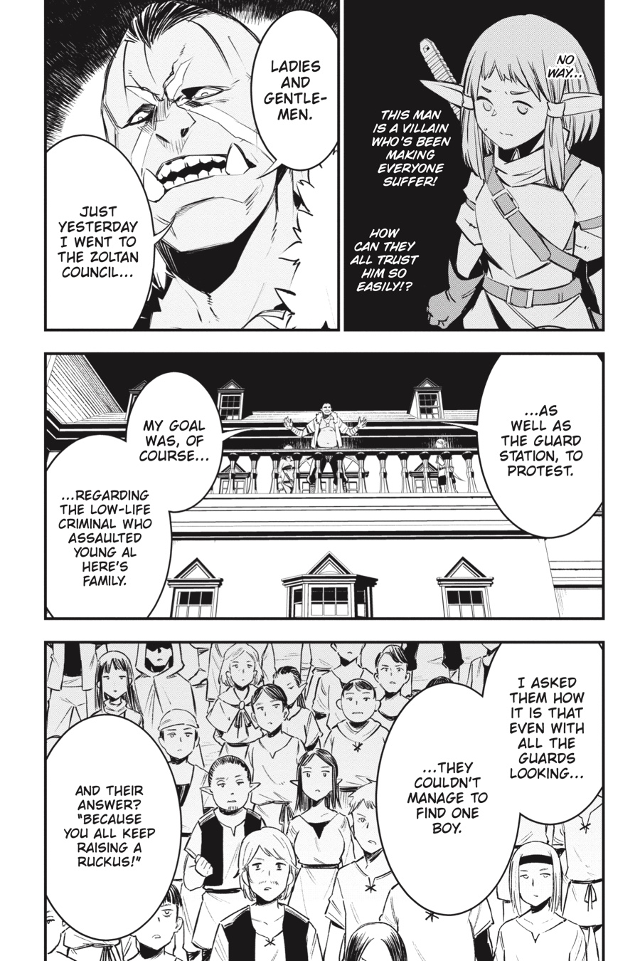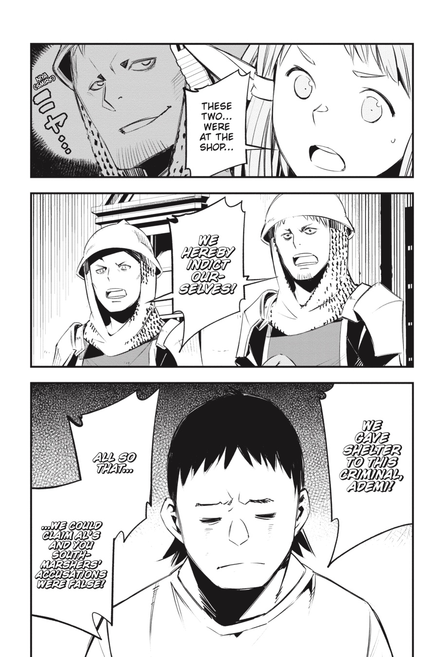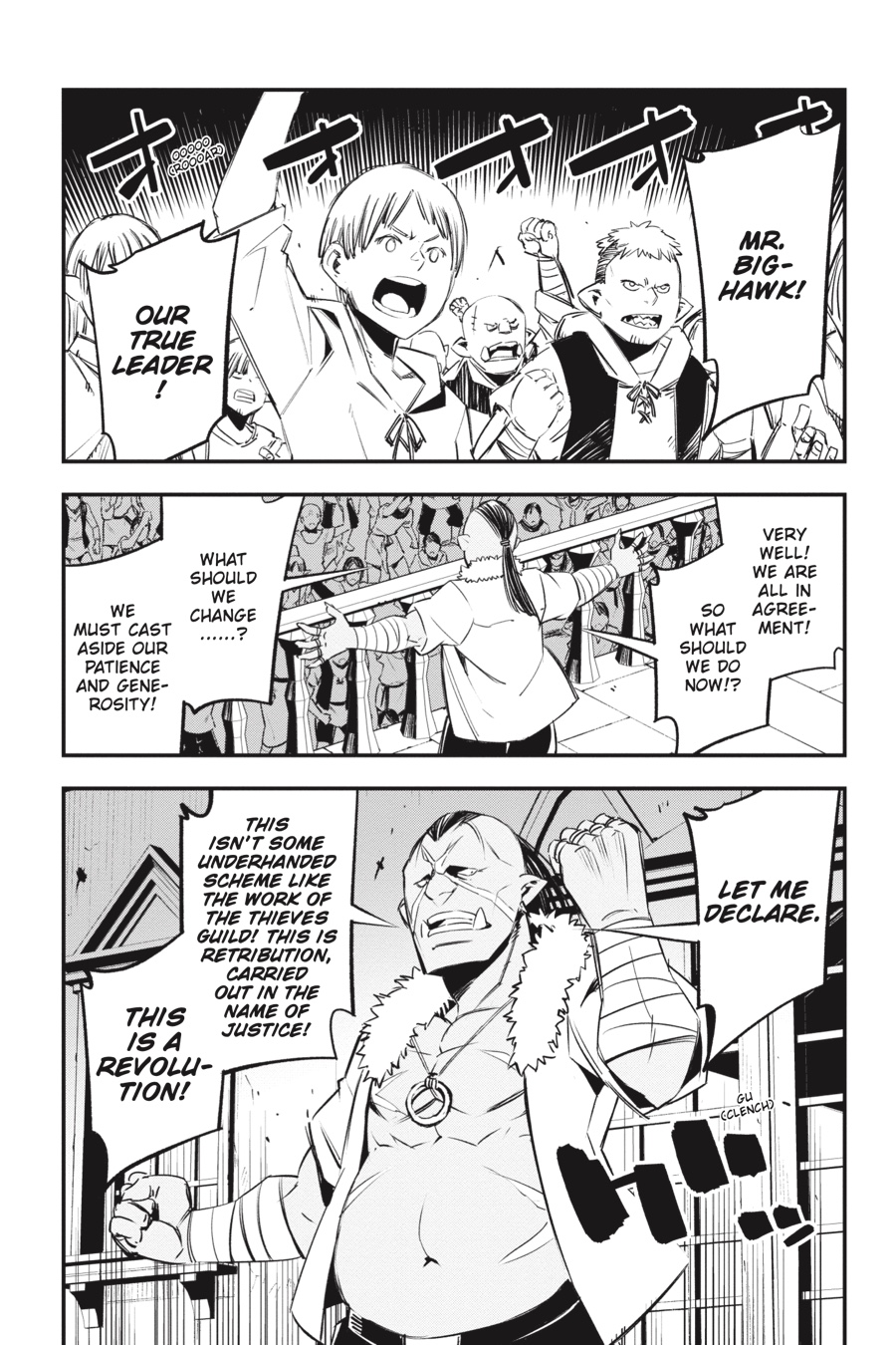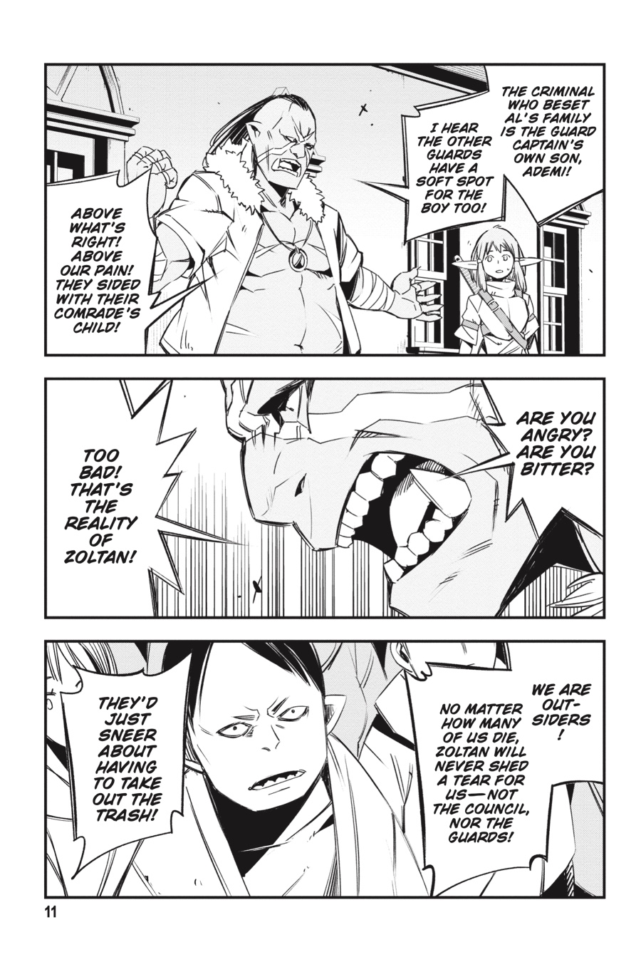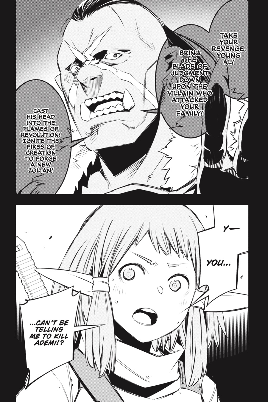 “bring the blade of judgment down upon the villain who attacked your family!” Rit and Red’s scheme to lure out the Thieves Guild goes awry when Al, the half-elf boy in their care, is kidnapped by Bighawk’s henchmen! Their ringleader seems to have grand plans for Al, claiming he’ll make the boy a “hero.” But things quickly turn sour when he brings out the object of Al’s vengeance and local bully Ademi and orders the half-elf to murder him—in front of a huge crowd of townspeople! Will Al do as Bighawk says and exact revenge on his parents’ attacker?!