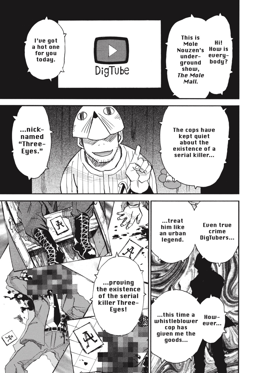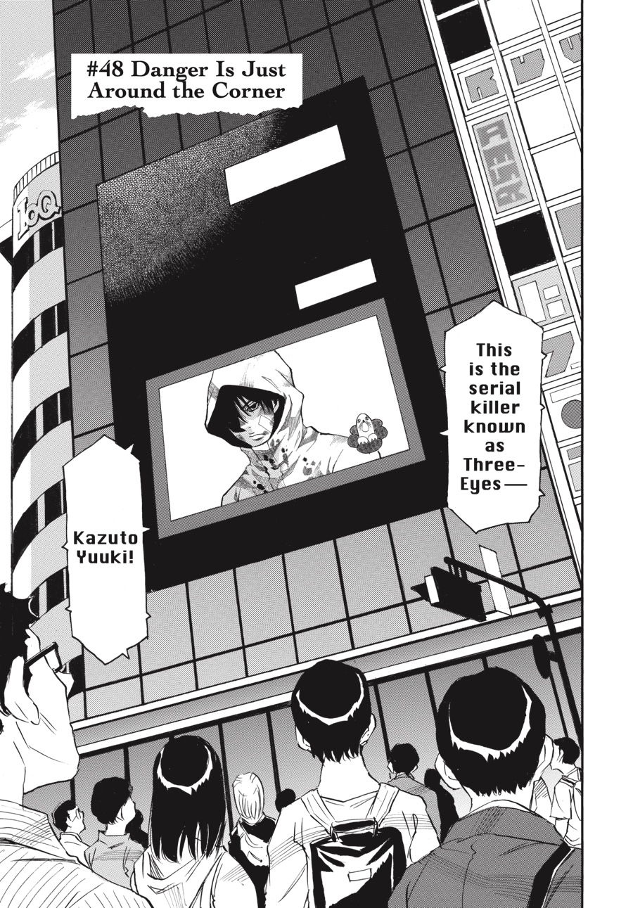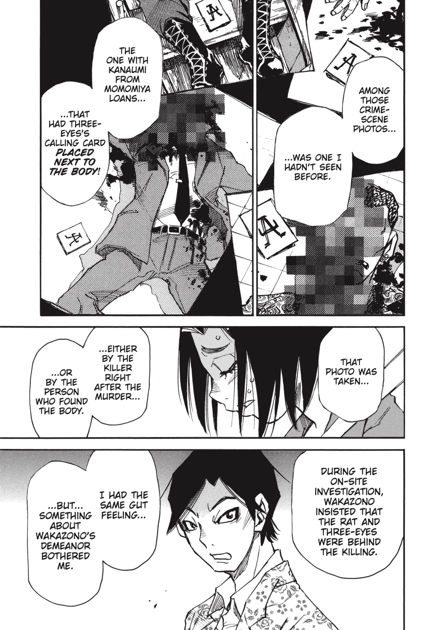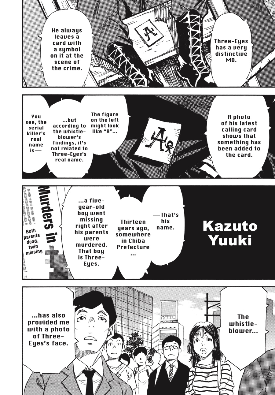 Discontent to remain in the shadows, Wakazono leaks police documents concerning Three-Eyes’s true identity to the press—including a photo of Senri! While the release forces Senri out of the public eye, Wakazono hopes the threat against him will force Kazuto to act, revealing himself and giving him a chance to kill the “fire” man. Unfortunately for Wakazono, he has no idea just what kind of person he’s been dealing with…