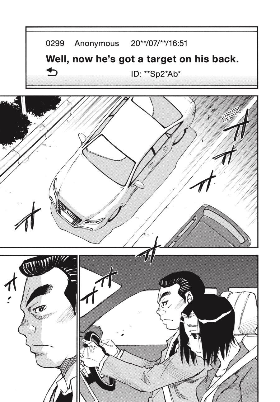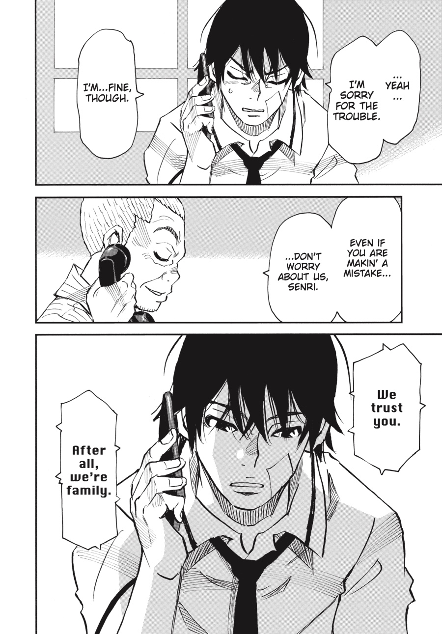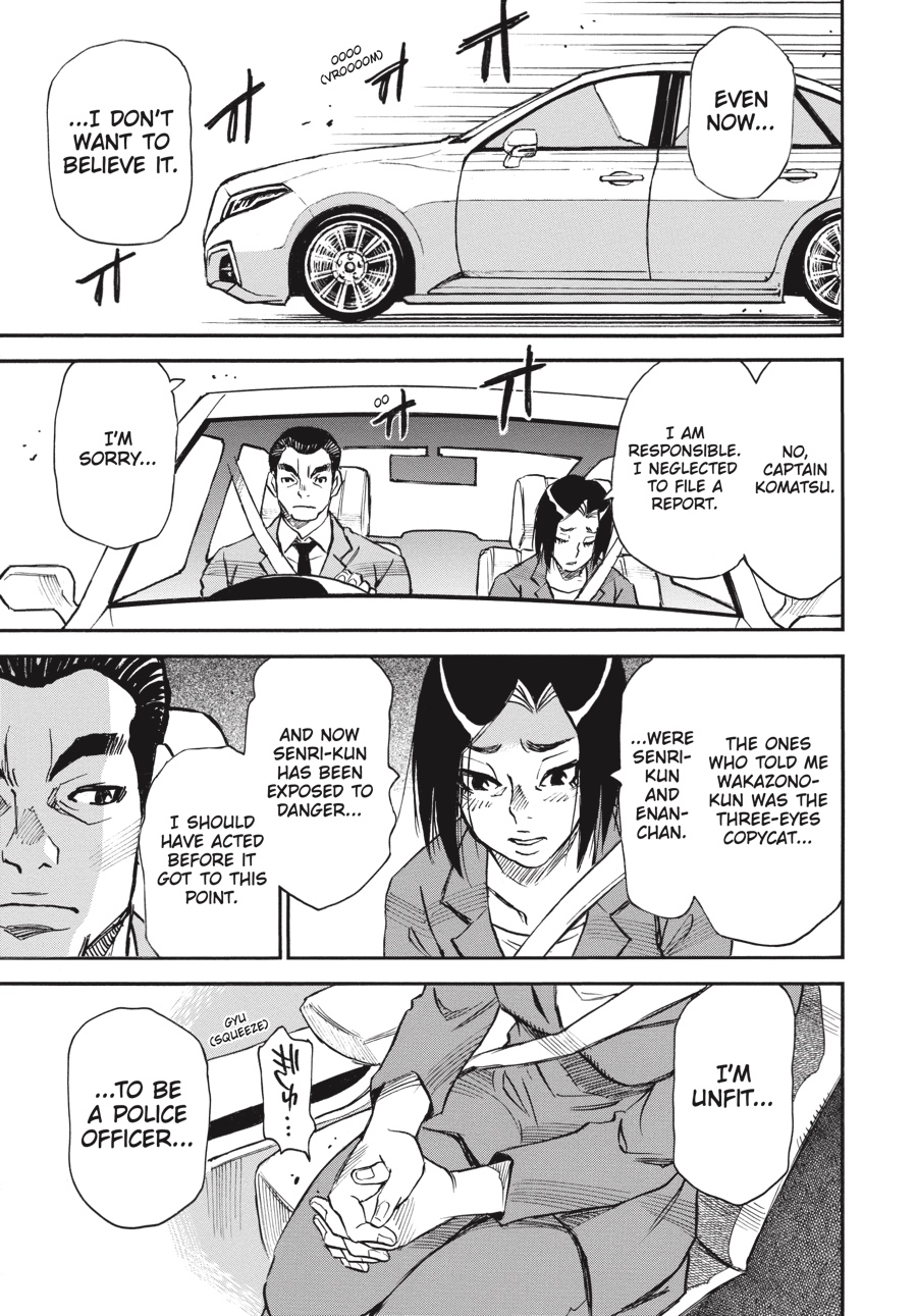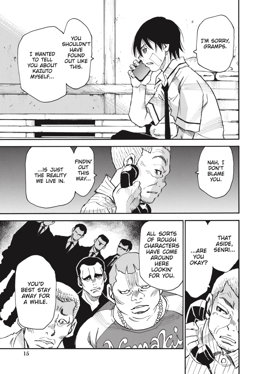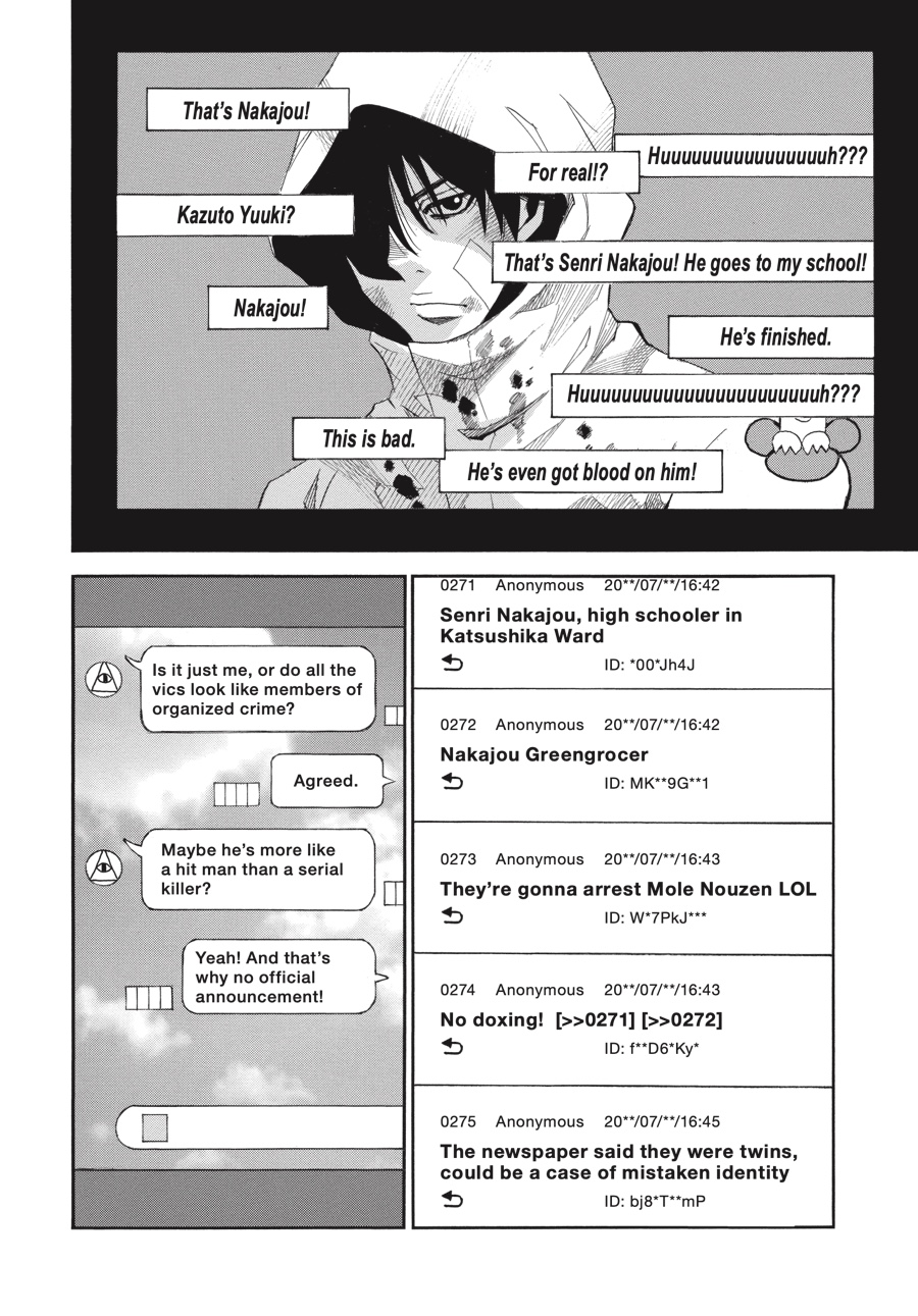Discontent to remain in the shadows, Wakazono leaks police documents concerning Three-Eyes’s true identity to the press—including a photo of Senri! While the release forces Senri out of the public eye, Wakazono hopes the threat against him will force Kazuto to act, revealing himself and giving him a chance to kill the “fire” man. Unfortunately for Wakazono, he has no idea just what kind of person he’s been dealing with…