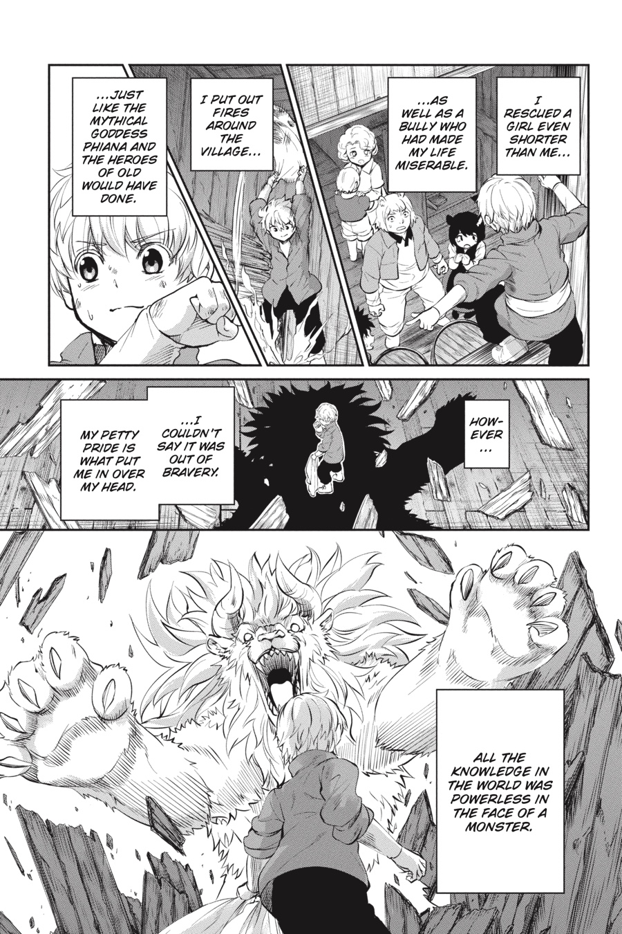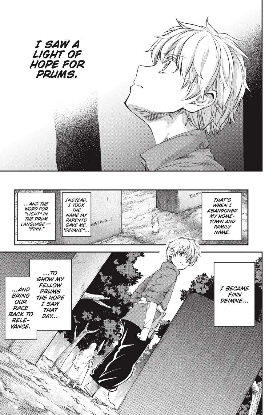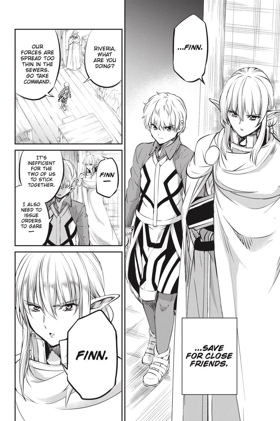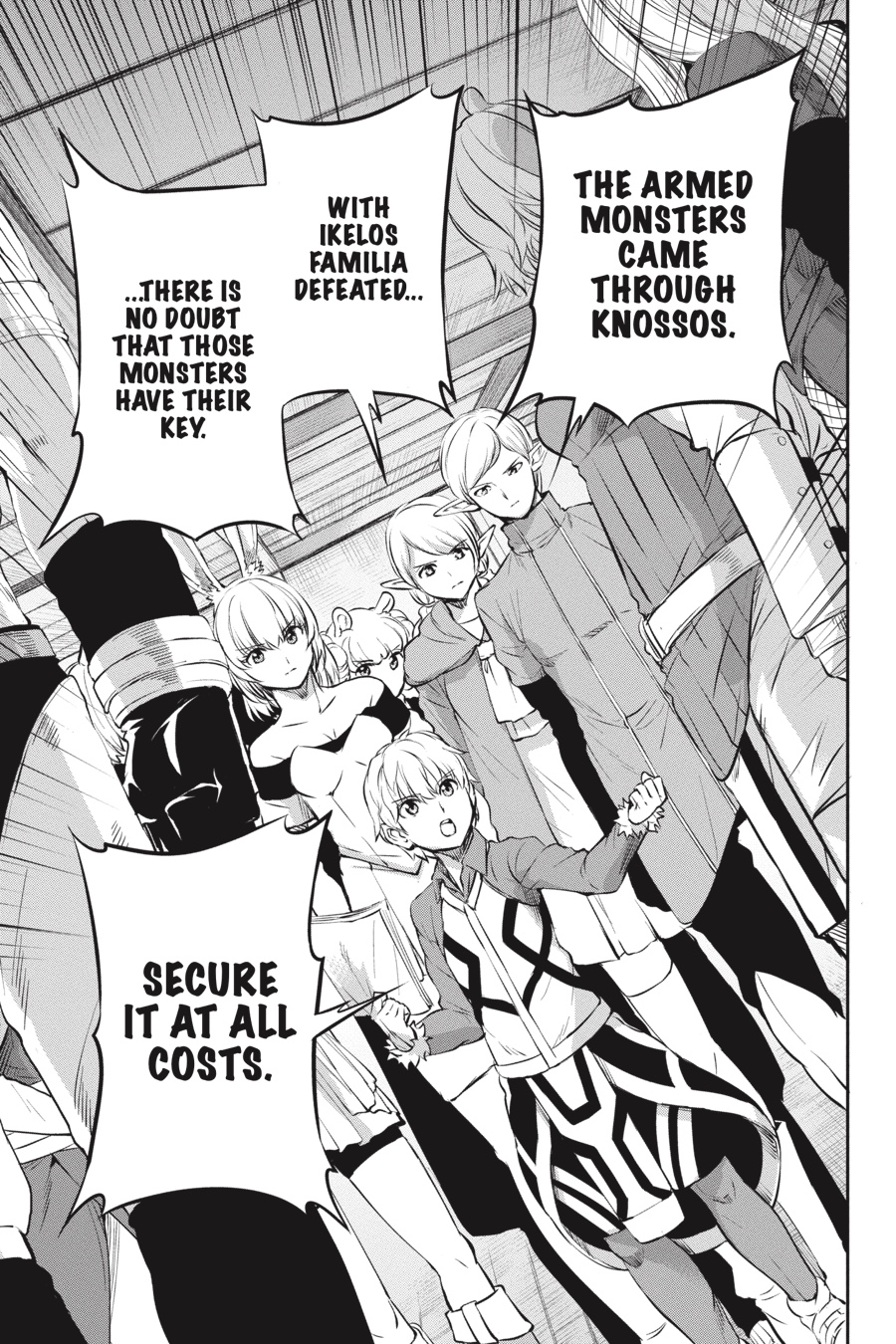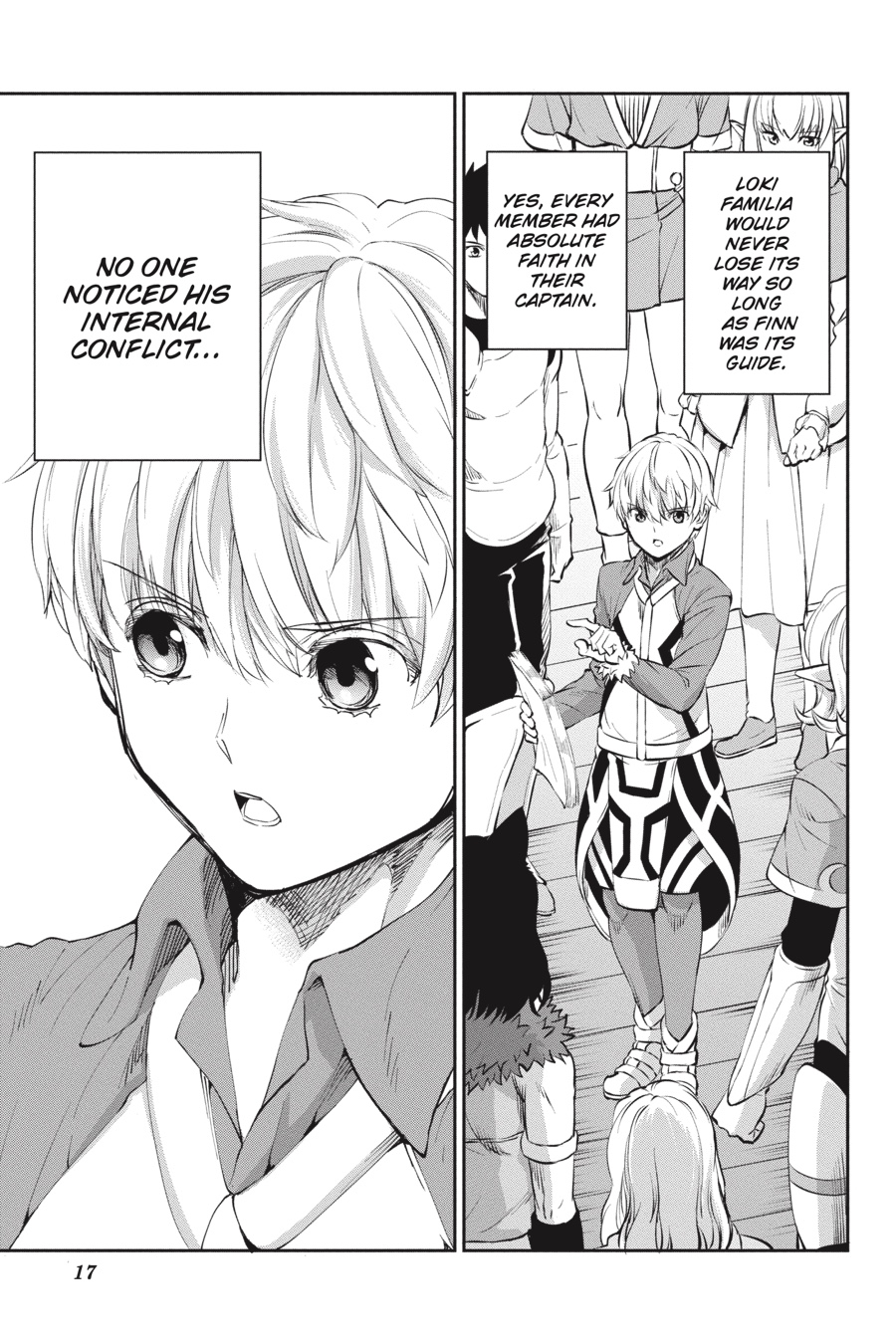 Intelligent monsters, the Evils, the Hestia Familia and Aiz's Loki Familia. Head of the latter, Finn alone is calm amid the chaos. In this clash of wills, what path will Finn take? Unwilling to abandon her anti-monster philosophy, Aiz moves to stop Bell, but she finds her path blocked... The battle with the mysterious gale swordsman begins!