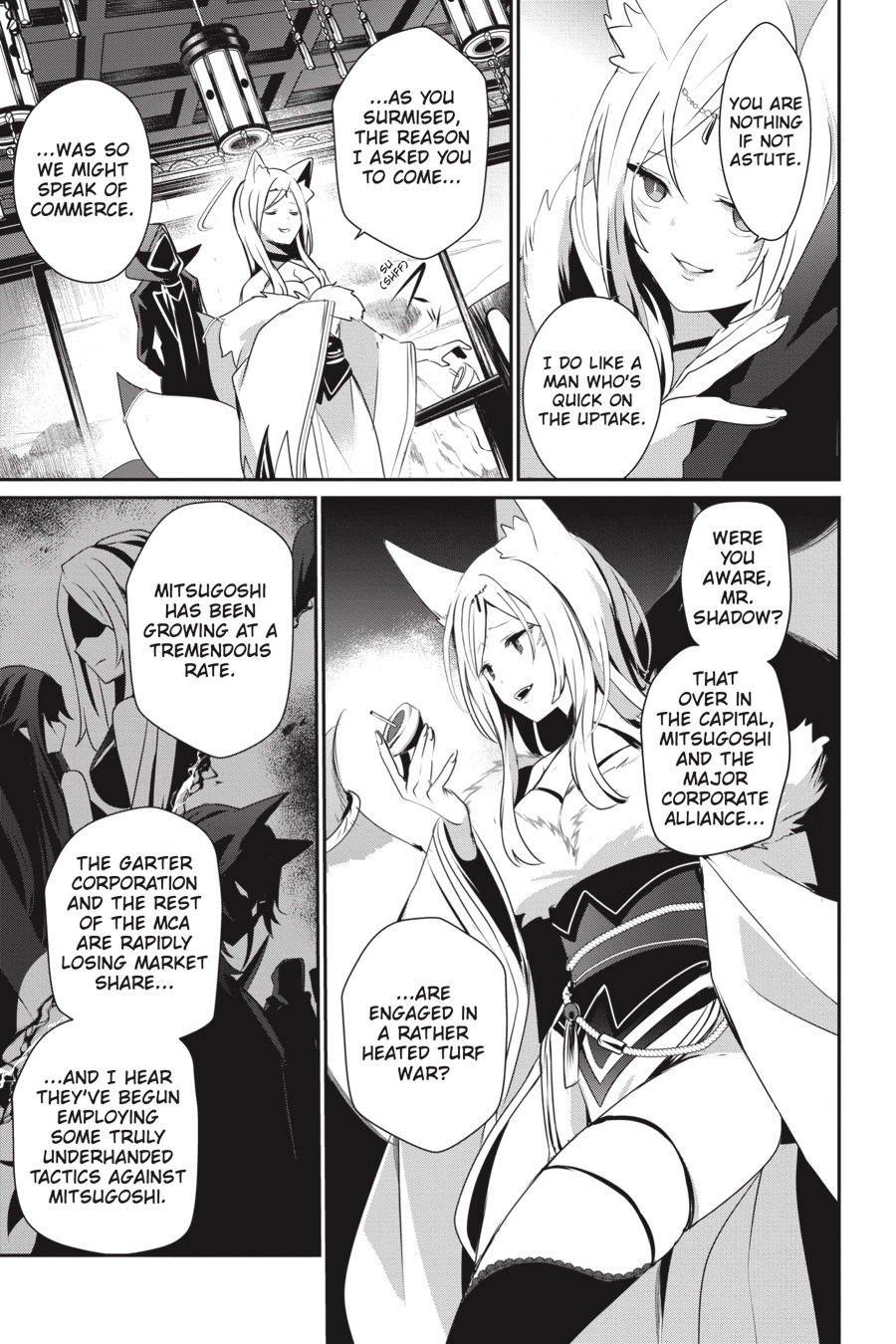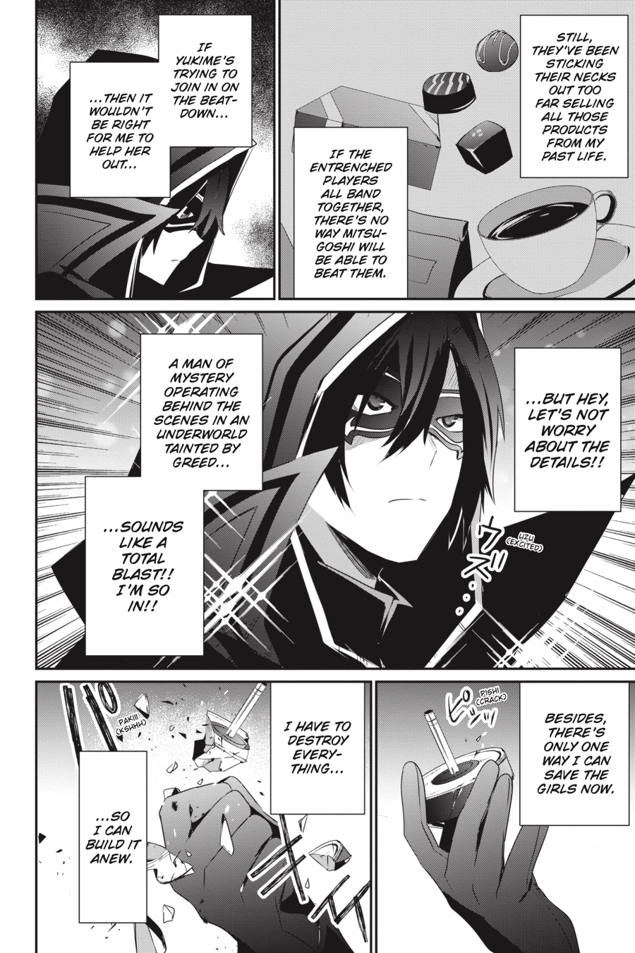 A troubled wind is blowing—Mitsugoshi’s new innovations have put them in the sights of entrenched business interests, and the filthy quagmire of shady underworld schemes is escalating to all-out economic warfare! Naturally, there’s no way Cid would ignore something that cool-sounding! If it looks like the girls are getting in over their heads, he’ll just have to step in and betray them to save the day—not as mild-mannered Cid or the grim and mysterious Shadow, but as Super Elite Agent John Smith, he who destroys all and rebuilds it anew…!