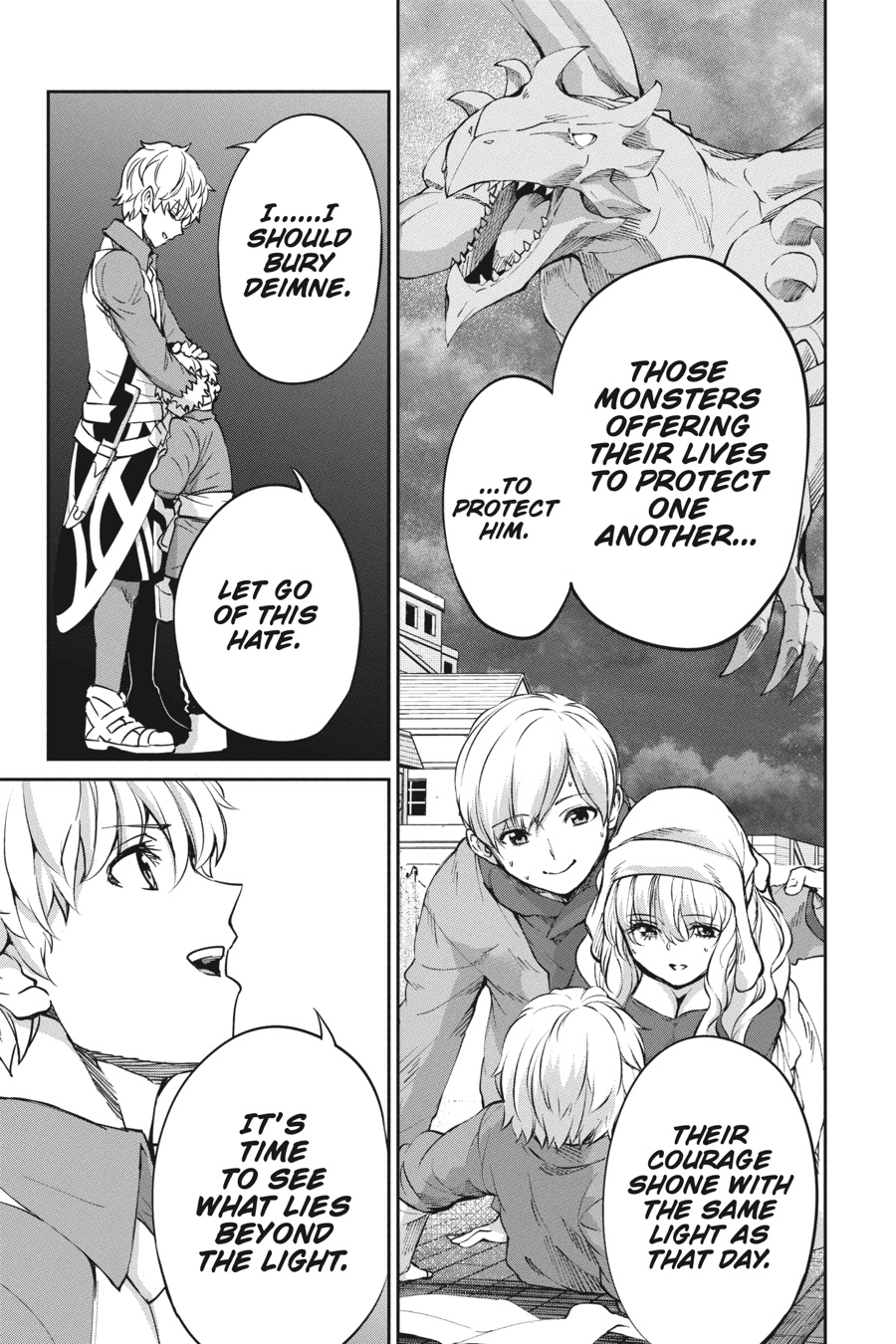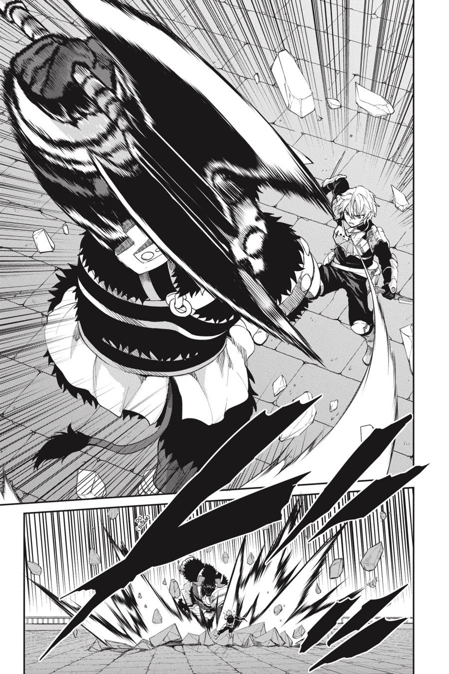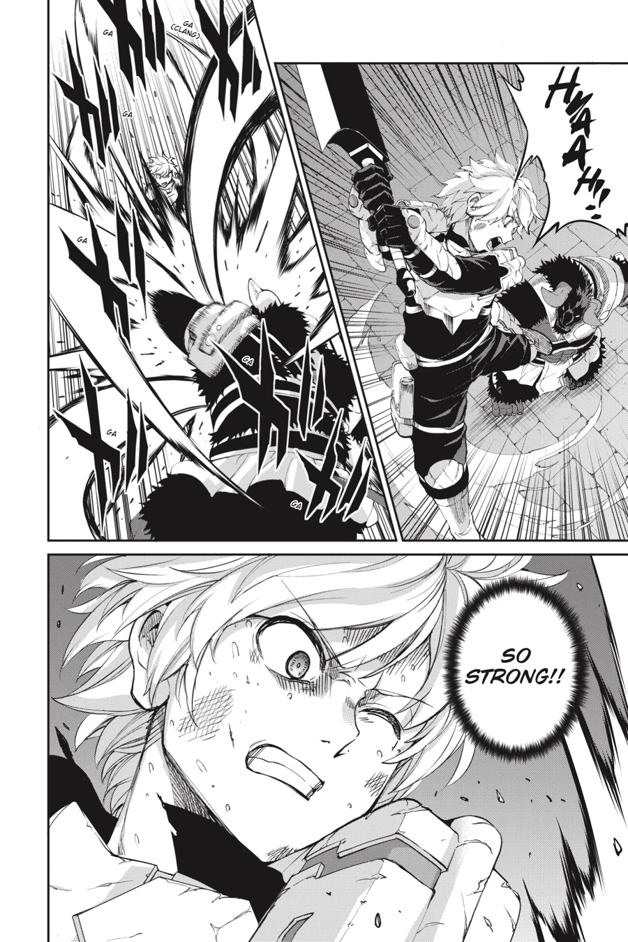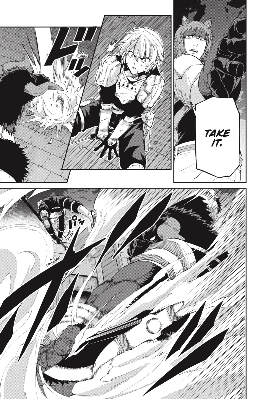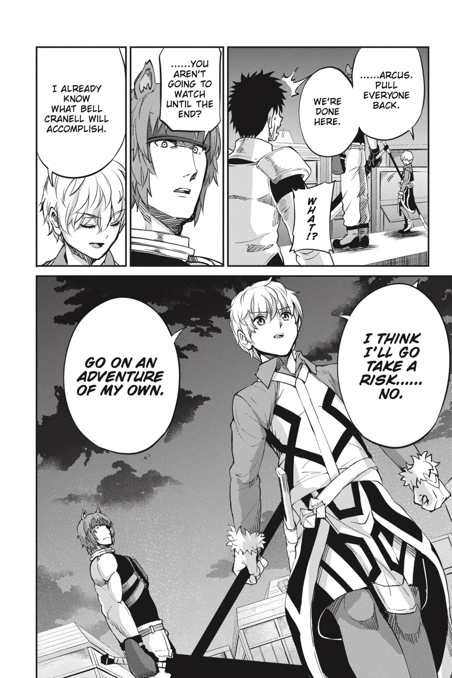 The black minotaur Asterios appears before Bell, challenging him to a long-awaited duel! While Bell’s not one to fight if he can avoid it, he can’t help getting excited at the thought of going up against such a powerful opponent. The townspeople rally around Bell as he battles, and the adventurers in the area, including Aiz, look on in awe. Meanwhile, Finn and the rest of Loki Familia begin to put their plan to destroy the Evils into action…