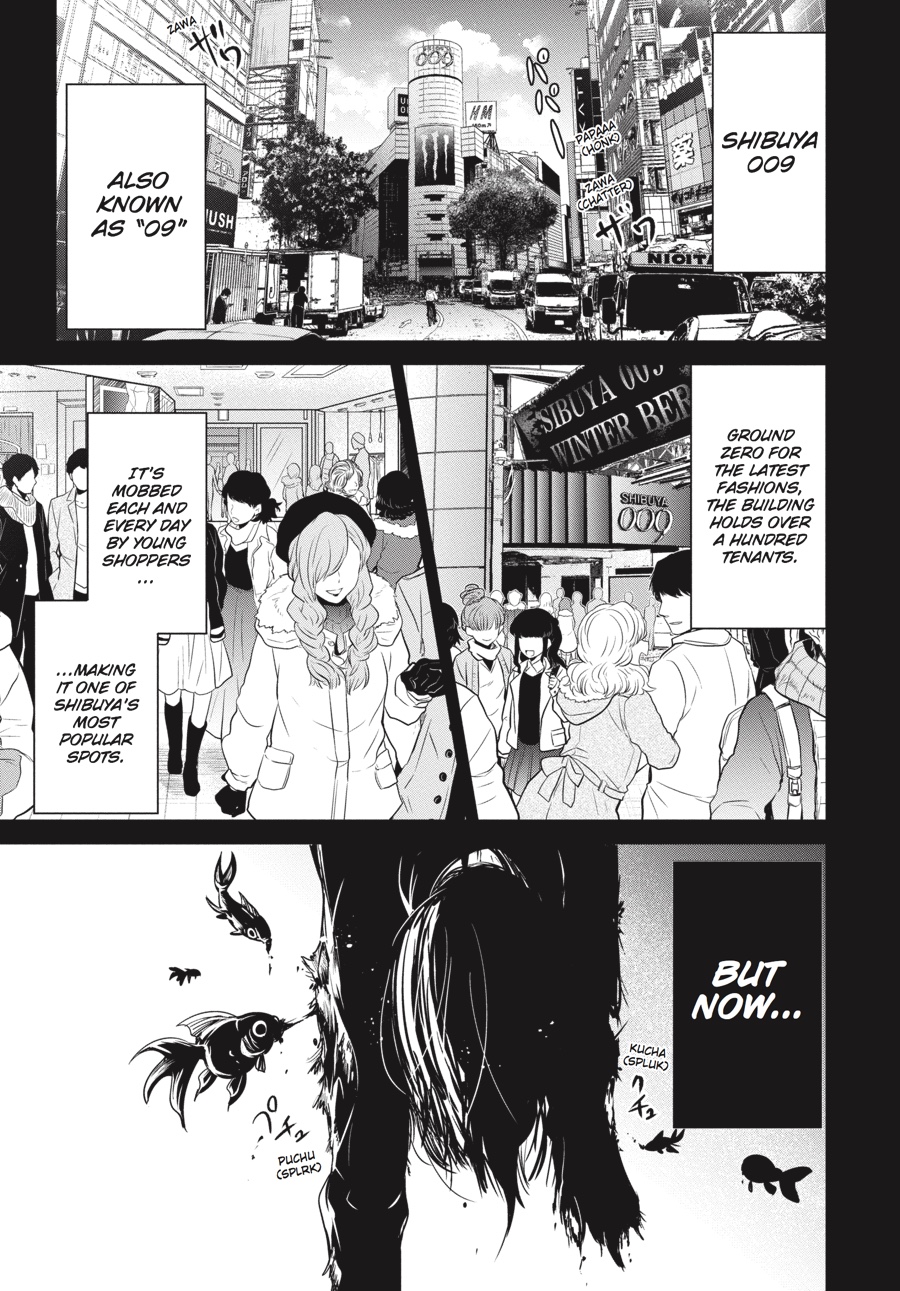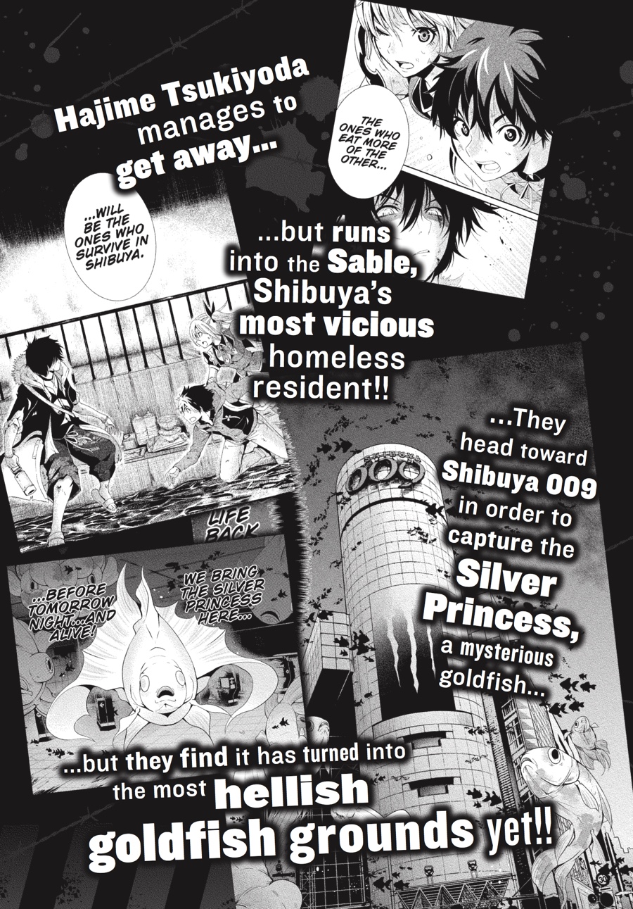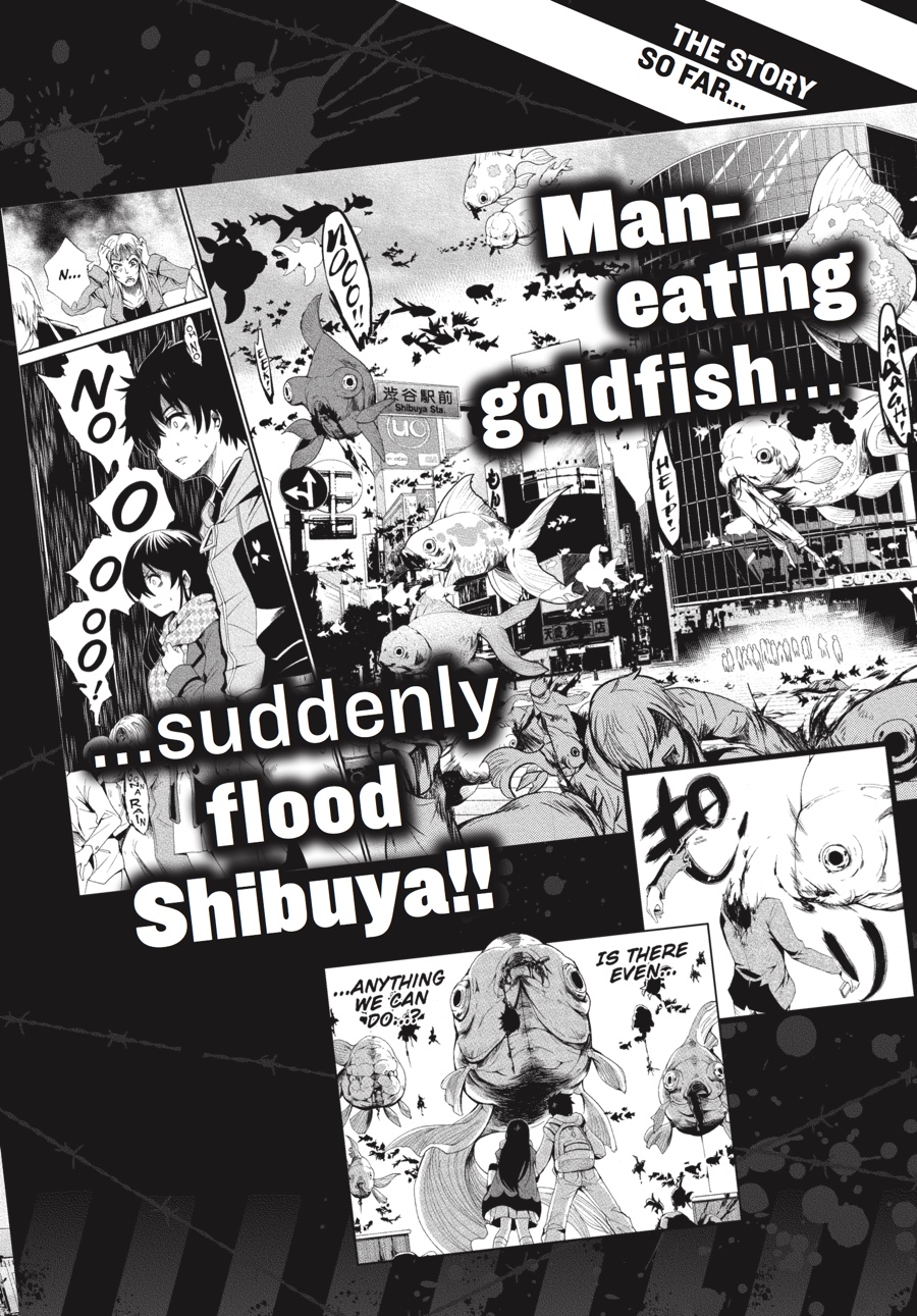 Under the leadership (and threats) of the Sable, a small group of survivors goes on the offensive against the invading goldfish. The 009 building, once a bustling shopping center, is the apparent stronghold of the “Silver Princess,” a pure-white Tosakin goldfish with unique abilities as terrible as her appearance is striking. Capturing the Princess may be the only way to save Alisa and ultimately escape Shibuya, but her giant, bloodthirsty entourage is proof that absolutely anything can happen and nothing can be taken for granted. Thirteen enter 009—how many will make it out?!