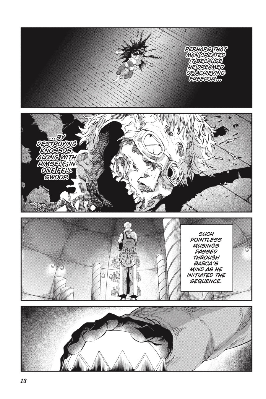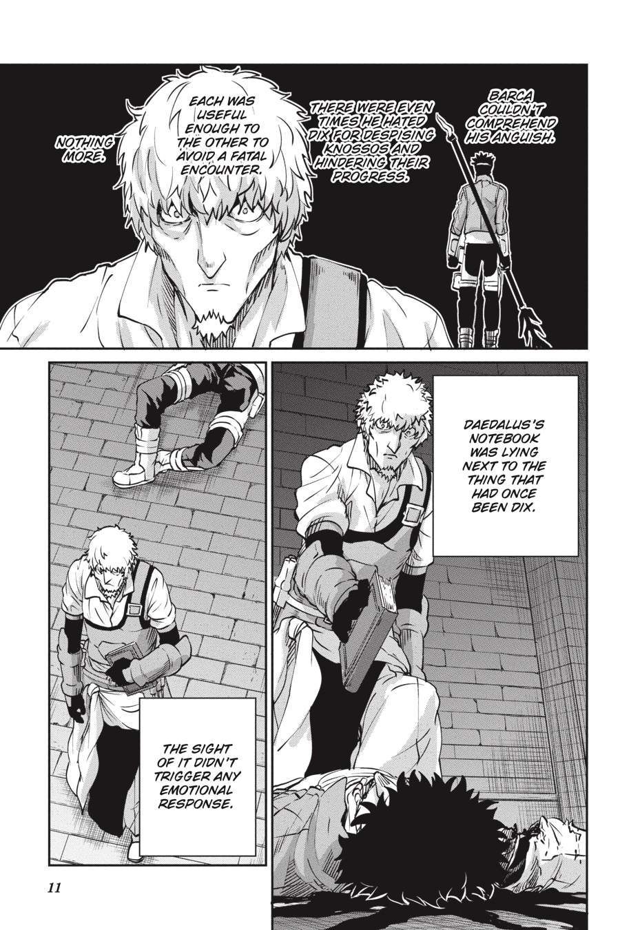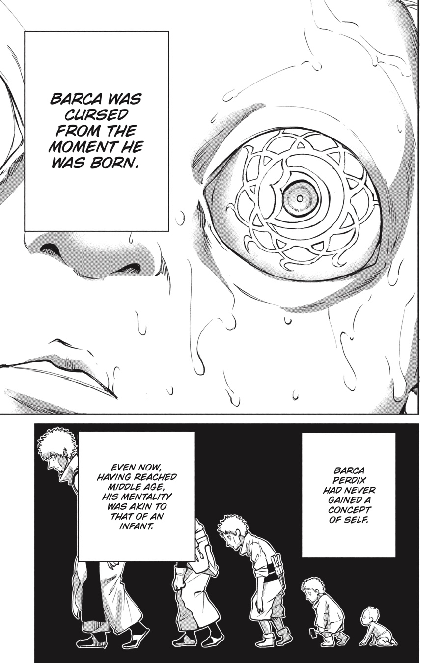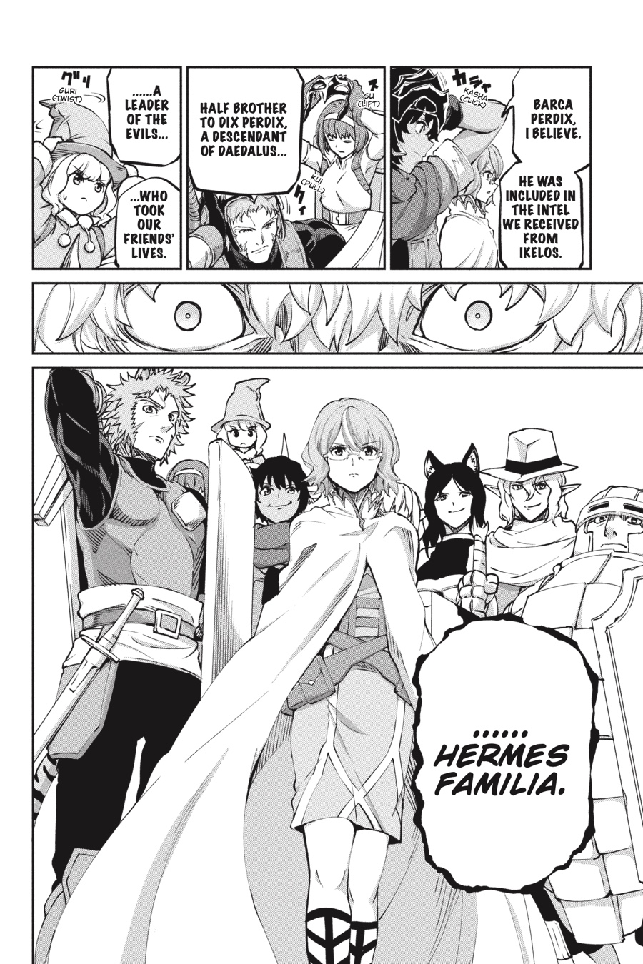 Barca, who’s been cornered by Loki Familia, counterattacks with Destruction, transforming into a monster in the process! Finn and the others are helpless in the face of the beast born from Daedalus’s obsession, which specializes in deadly curses... Meanwhile, Dea Saint Amid splits from the group pursuing Thanatos as she works to dispel the hexes, but how will she fare without Loki Familia to back her up?