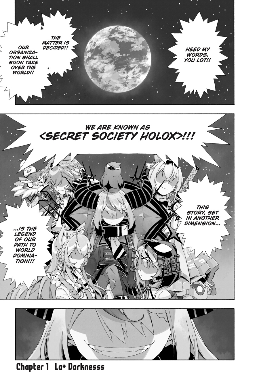 When a job offer arrives from a company she never applied to, Sakamata Chloe is naturally suspicious, but she can’t say no to the generous salary. Her new workplace is the Secret Society holoX, where fellow members Takane Lui, Hakui Koyori, Kazama Iroha, and their leader La+ Darknesss strive to achieve nothing short of world domination! (If they ever manage to scrounge up the funds, that is.) Discover the origins of the self-proclaimed “rightful rulers of Eden’s planet” in this story based on the mega-popular virtual YouTuber stars of Hololive. “YES MY DARK!”