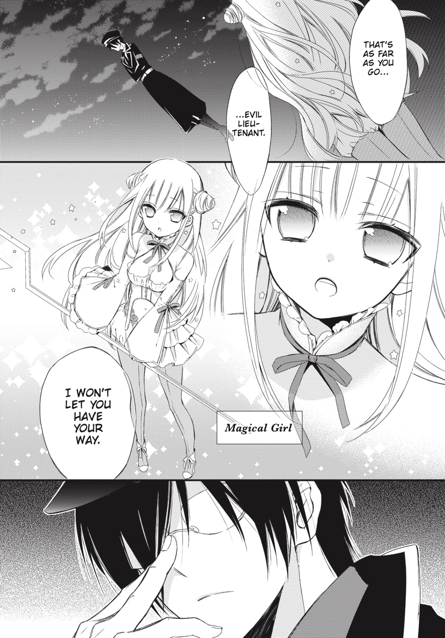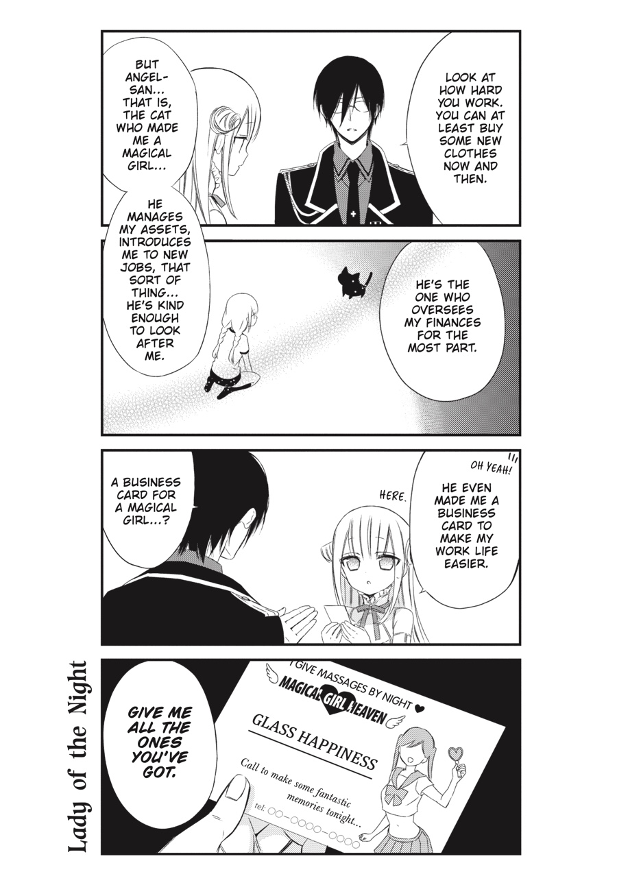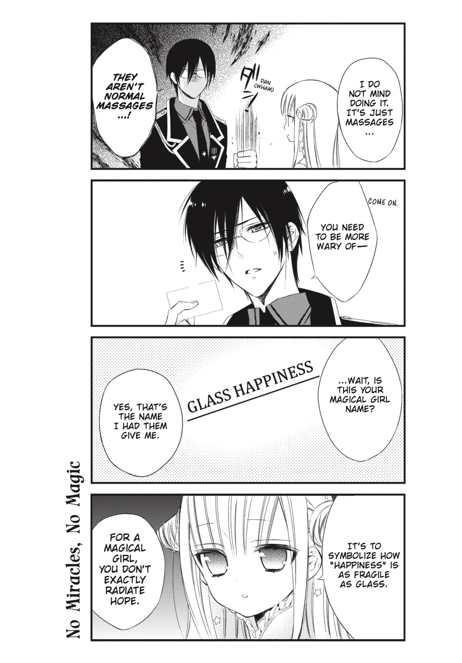 Byakuya is the alter ego of the heroic magical girl Glass Happiness. Mira is a villainous lieutenant to the Evil King, and he’s prepared to do what it takes to eliminate his wand-wielding nemesis once and for all. While his cunning is unmatched, the last thing Mira expected was love at first sight! Now, instead of devising schemes to defeat Byakuya, he’s finding excuses to see her! What’s more, she doesn’t seem to mind…?!