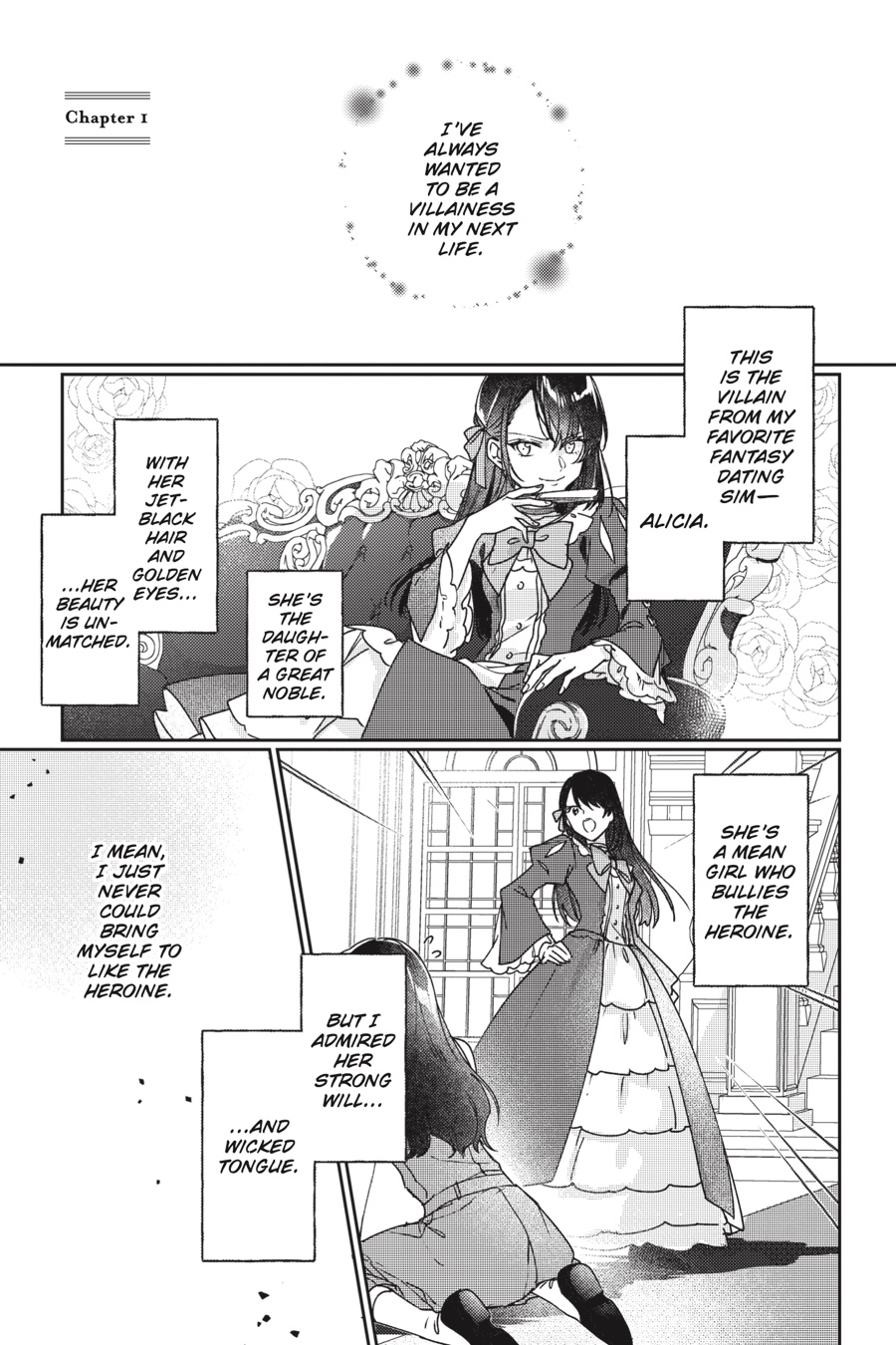 Most people want to be the heroine. I mean, who wouldn’t after being reincarnated into a fantasy dating game as the beautiful, prodigious daughter of a noble family? But screw that, being the villainess is way more fun—and that’s exactly who Alicia Williams is going to be! Yet the more pluck, audacity, and insolence she musters, the more everyone seems to like her! What’s a villainess got to do to leave her mark on history?!