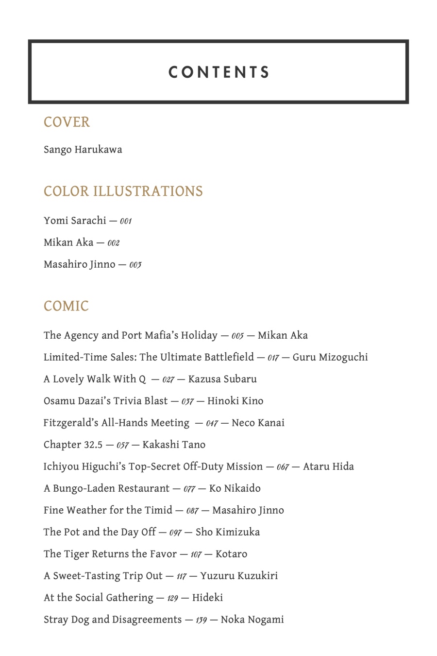The cast of Bungo Stray Dogs returns in this second volume of the hit supernatural action series’s comic anthology! With an all-new lineup of guest authors, this premium collection features a bevy of exceptional side stories following the everyday adventures of the Armed Detective Agency, the Port Mafia, and even the Guild!