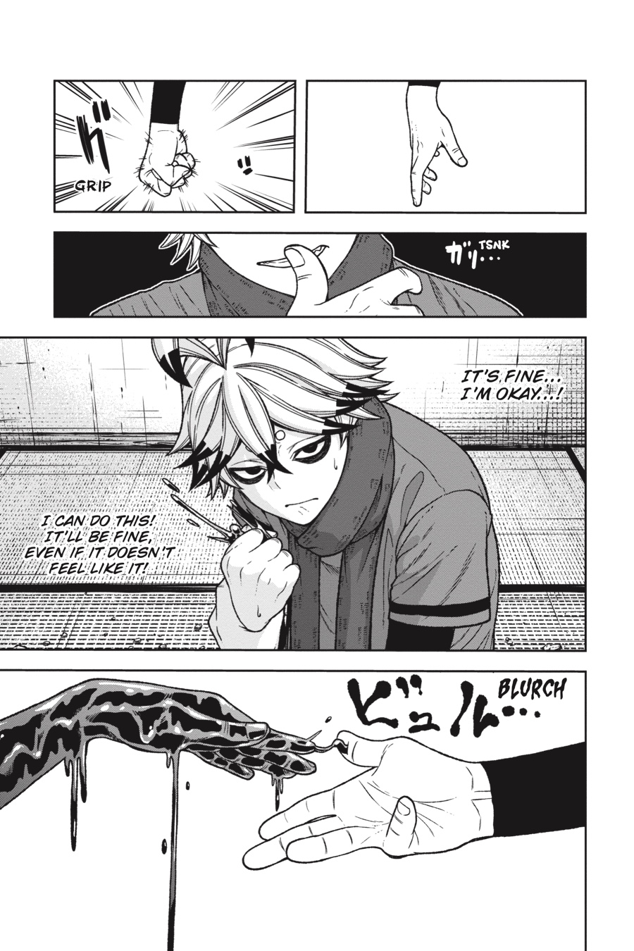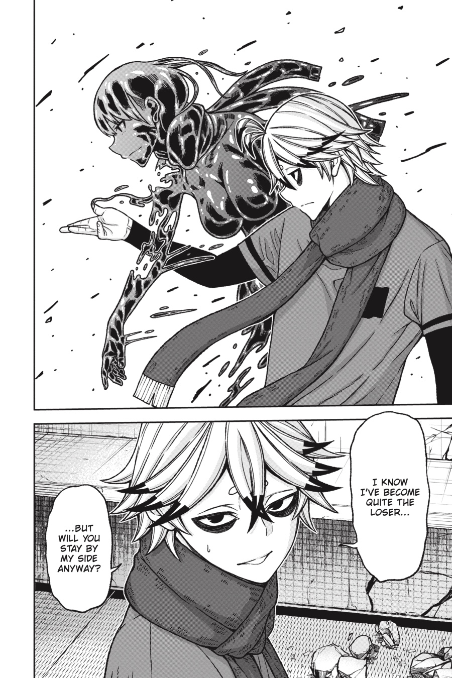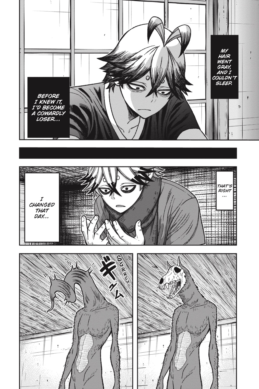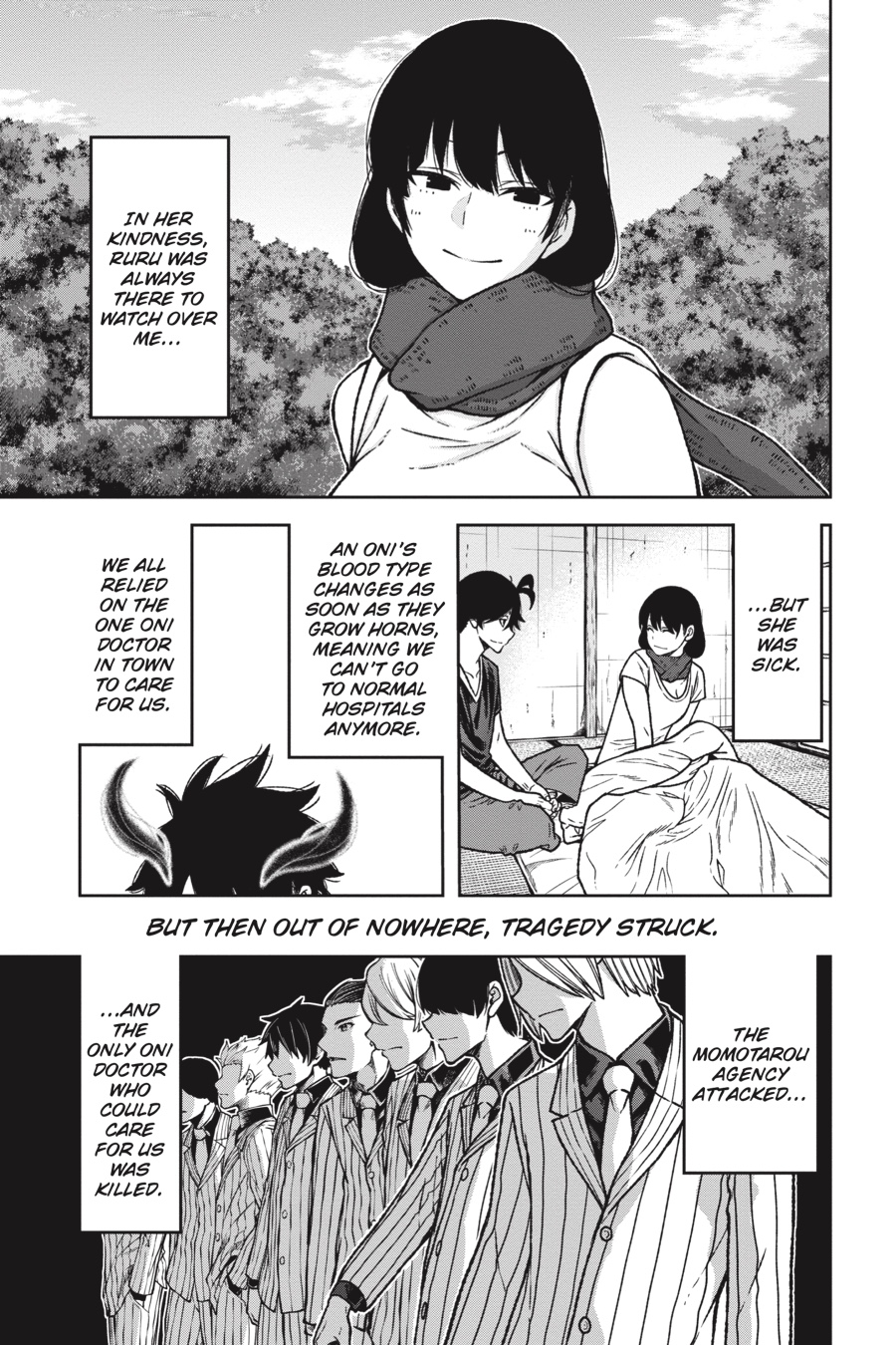 The Oni base below Kiyomizudera has been overrun by Tsubakiri’s abominations! After fending off one Aguri, a second puts the devoted Kuina out of action. Now it’s up to the cowardly Rokuro to get them both out in one piece, but the quivering boy who knelt there just moments ago is no longer. As Rokuro prepares to unleash his terrifying Oni blood, an unsettling, deadly calm spills forth from him…Meanwhile, the rest of the class fights for their lives against the creatures and Momotarou stalking the halls. With their exits cut off, these students are about to receive their first practical combat lesson—one where failure means a fate worse than death…