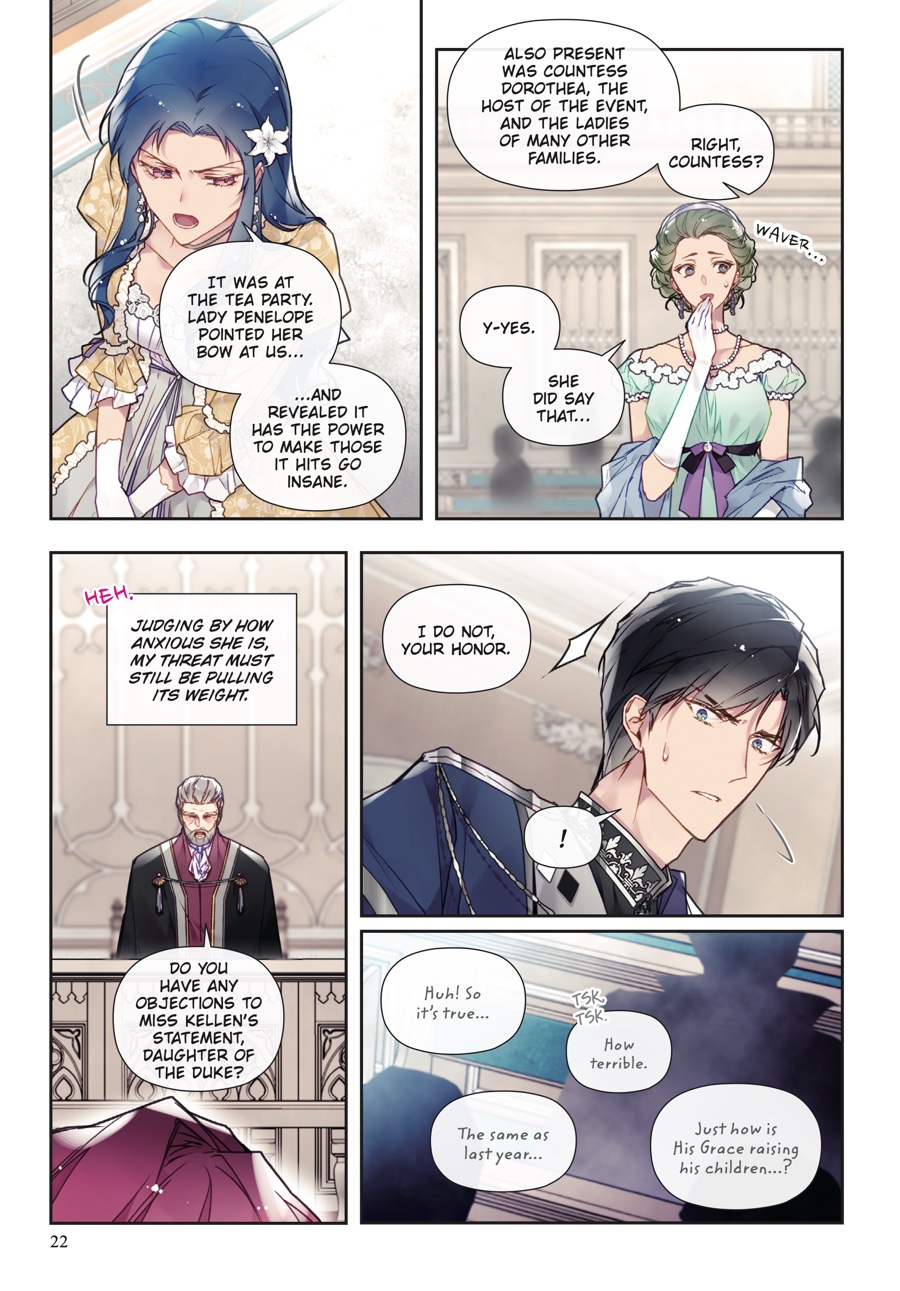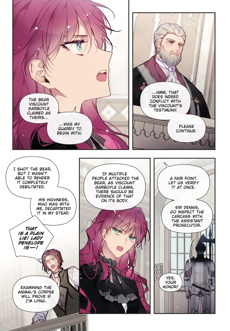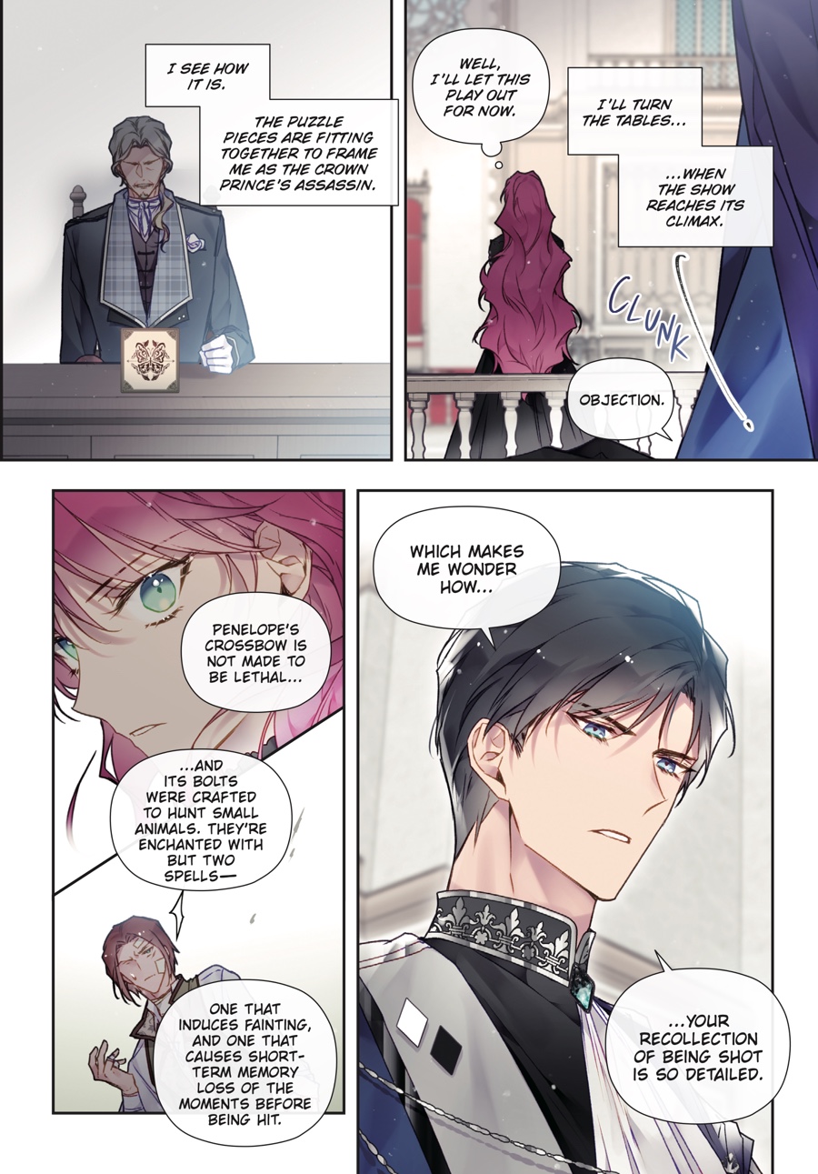 Penelope and Callisto safely escaped the assassins, but the danger is far from over. The crown prince has been left in mortal peril, and Penelope…is standing trial for attempted murder?! Accused of attacking seven nobles during the Hunt, she faces a court proceeding that, in actuality, is nothing more than an elaborate sham to frame her. With false testimonies filling the courtroom, Derrick proving himself untrustworthy, and Callisto being unfit to tak e the stand, will Penelope rise against all odds and prevail…?
