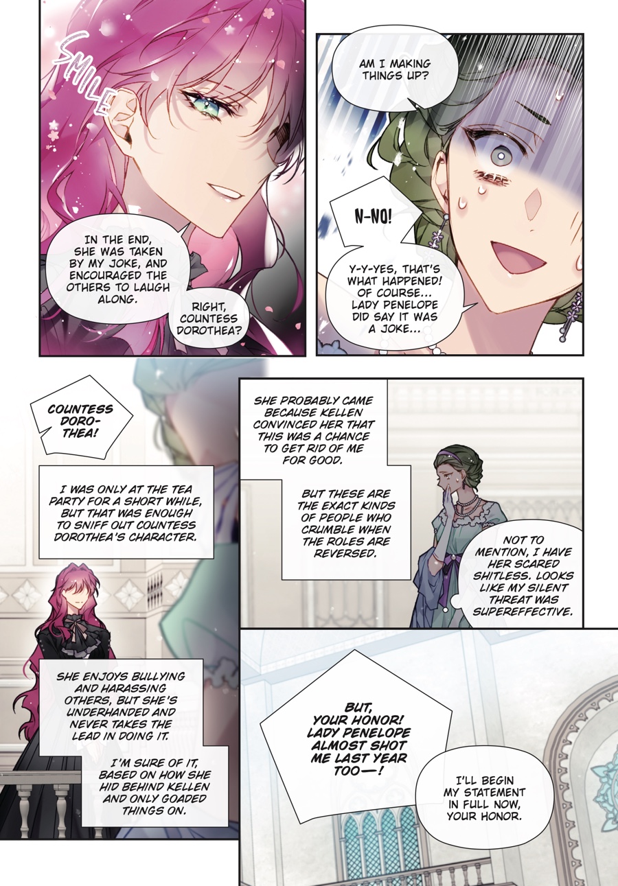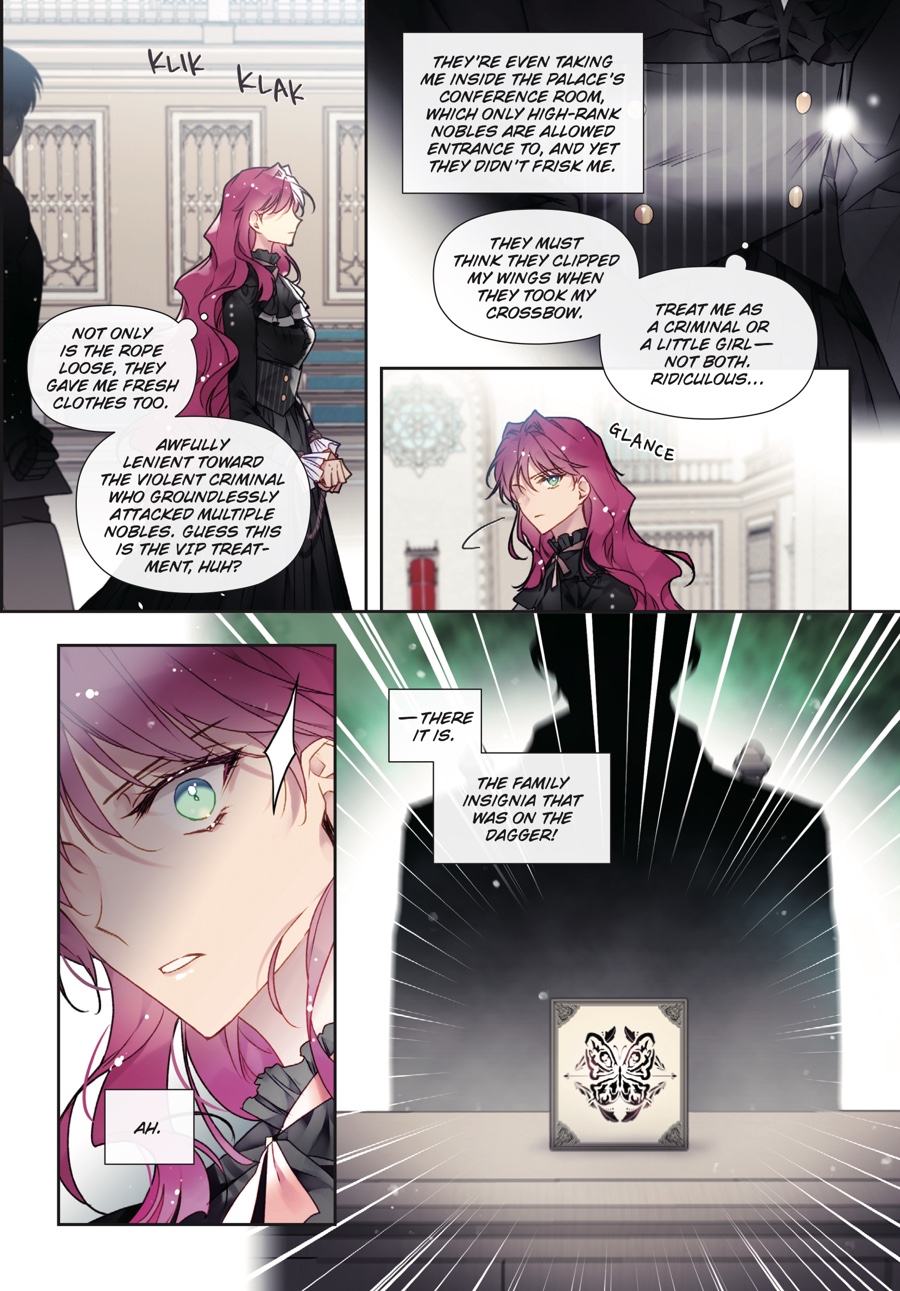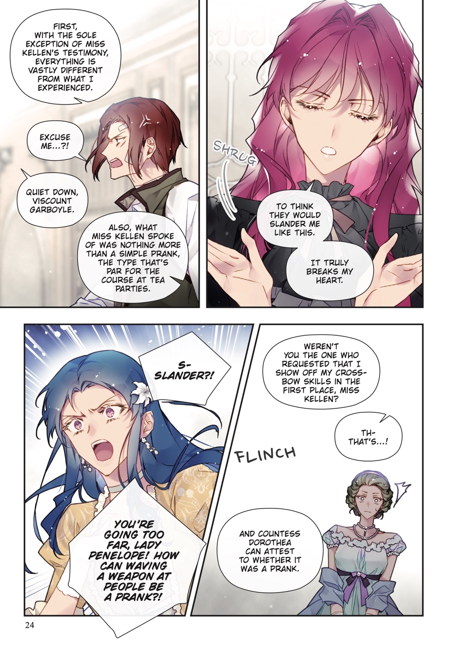 Penelope and Callisto safely escaped the assassins, but the danger is far from over. The crown prince has been left in mortal peril, and Penelope…is standing trial for attempted murder?! Accused of attacking seven nobles during the Hunt, she faces a court proceeding that, in actuality, is nothing more than an elaborate sham to frame her. With false testimonies filling the courtroom, Derrick proving himself untrustworthy, and Callisto being unfit to tak e the stand, will Penelope rise against all odds and prevail…?