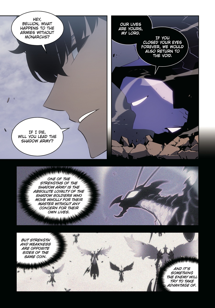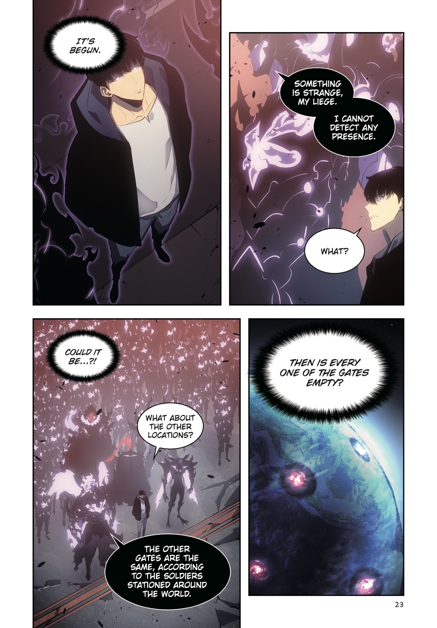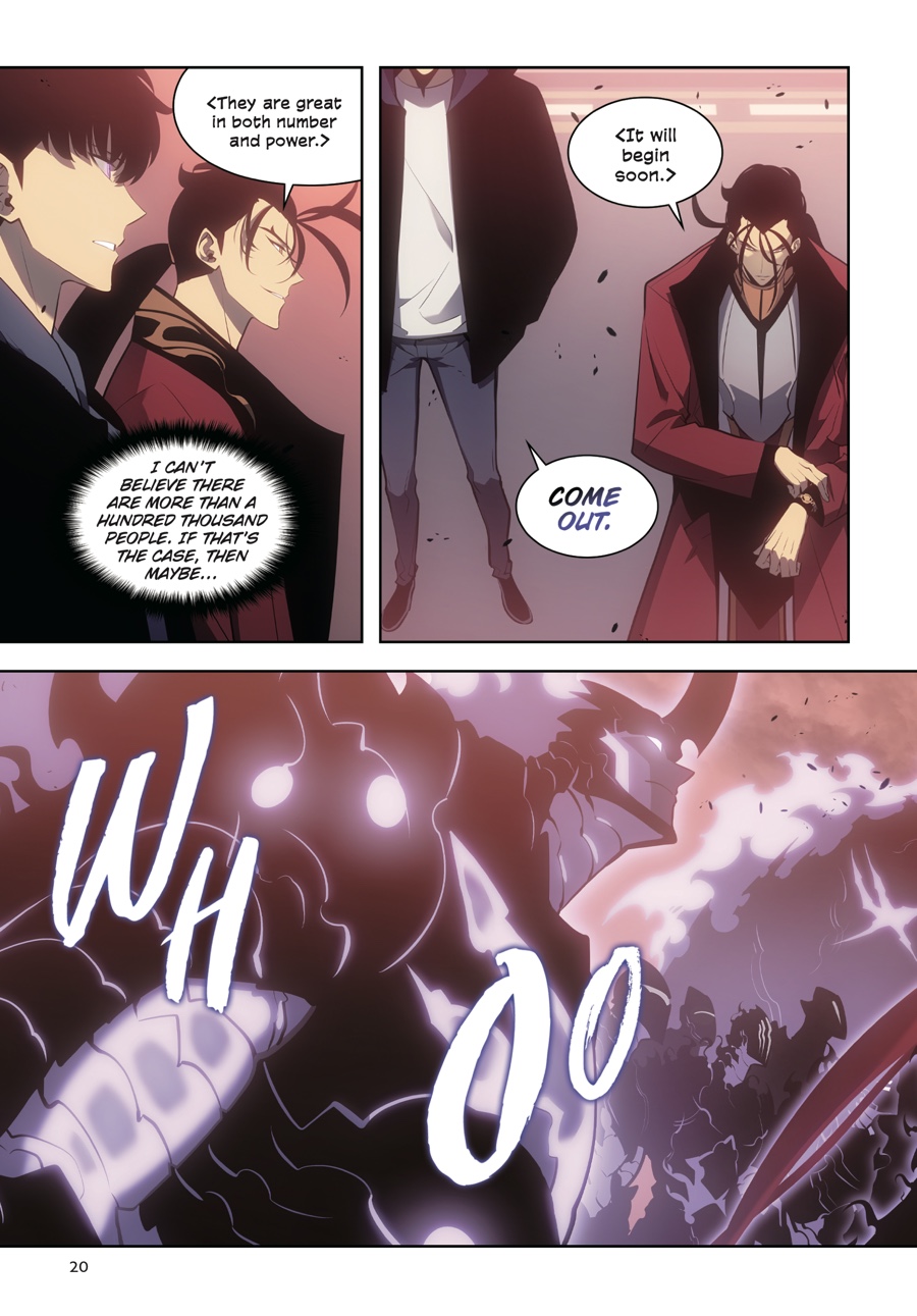 Outnumbered a hundred to one, Jinwoo and his shadow army ready themselves for the fight that will determine the fate of the whole world. As hunters worldwide gather to make mankind’s last stand, Jinwoo focuses on the gate closest to home and those he loves. A superior strategy is his only hope in the face of such overwhelming odds, but as the first wave emerges, it’s clear his foes are already a step ahead of the new Shadow Monarch...Has Jinwoo leveled up enough to defend humanity from certain destruction?!