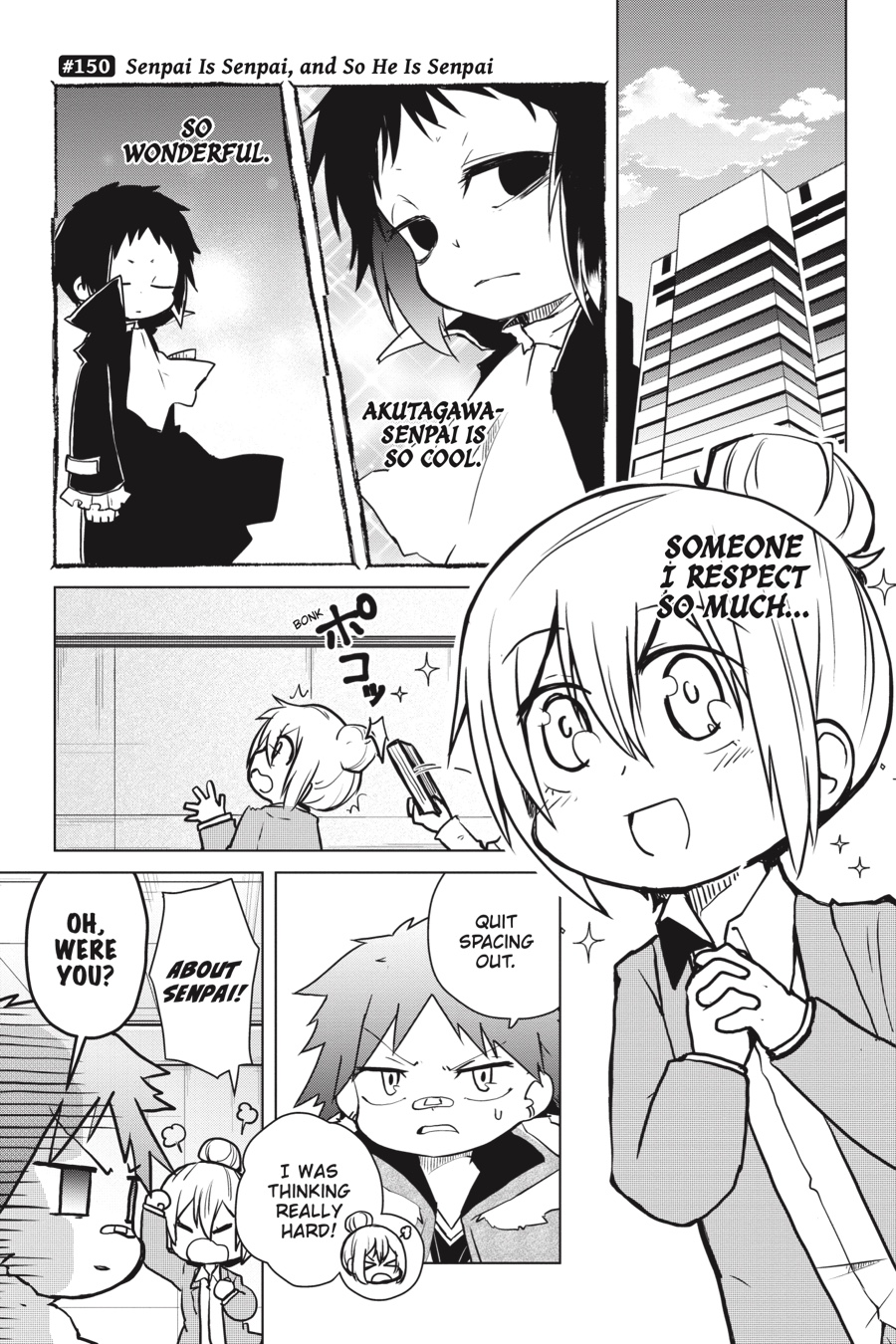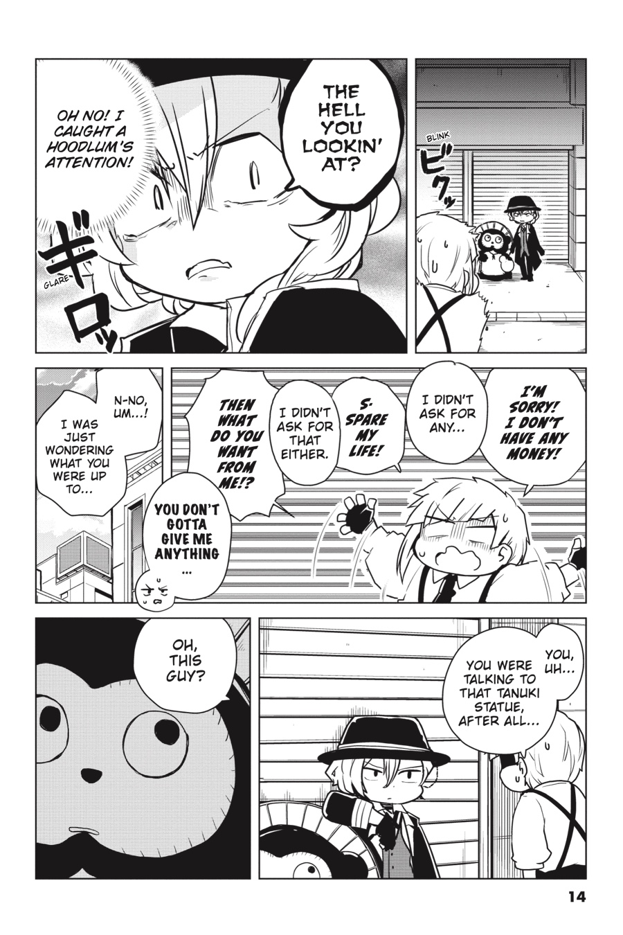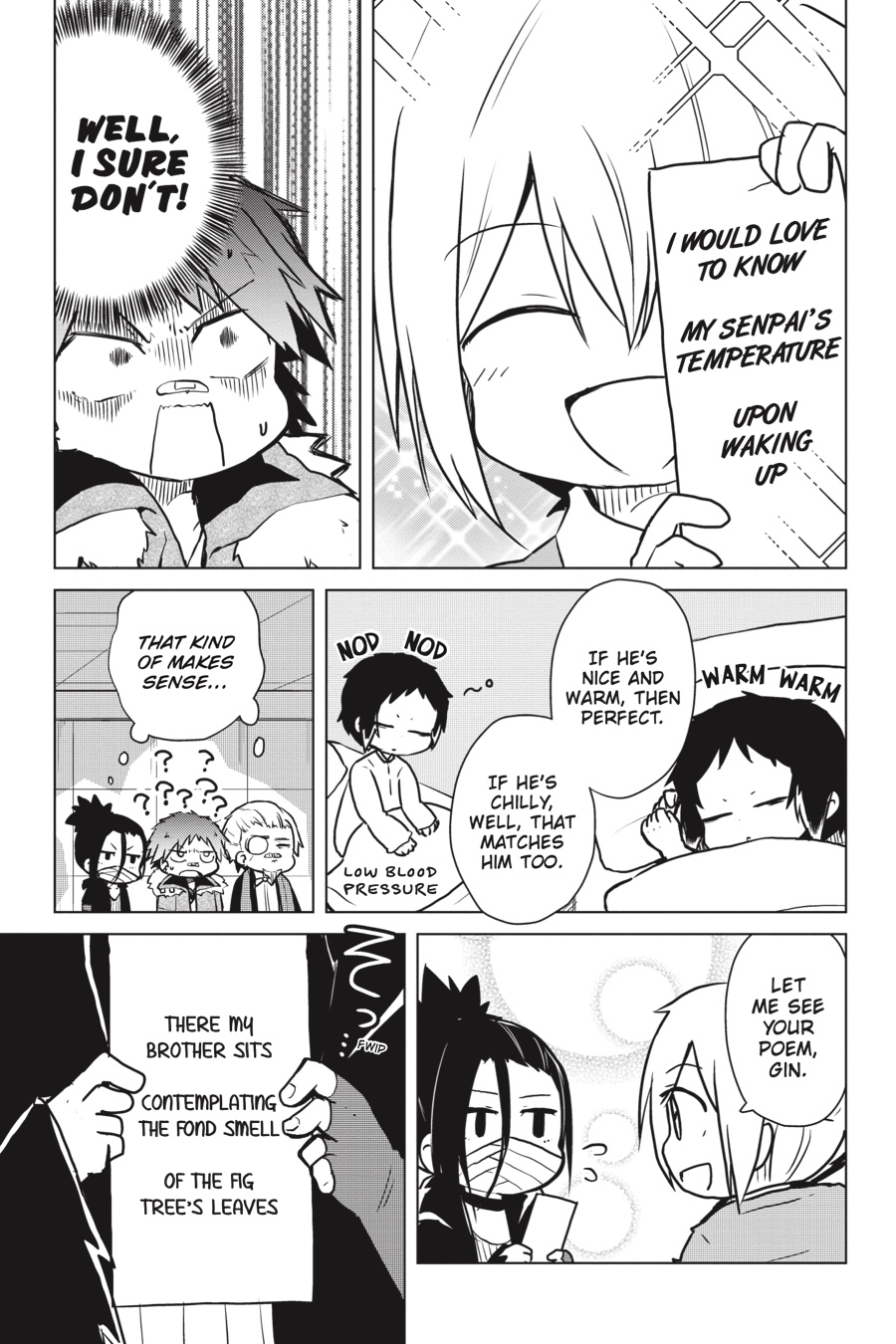 The colorful cast of Bungo Stray Dogs returns! Higuchi gets in touch with her creative side as she tries her hand at writing haiku, Chuuya elicits concern as he’s seen talking to inanimate objects, and Dazai has a totally serious conversation with his Dark Era buddies about what it truly means to apologize. Even the bad guys are getting into the gag manga groove as the Hunting Dogs, the Guild, and Dostoyevsky take the stage!