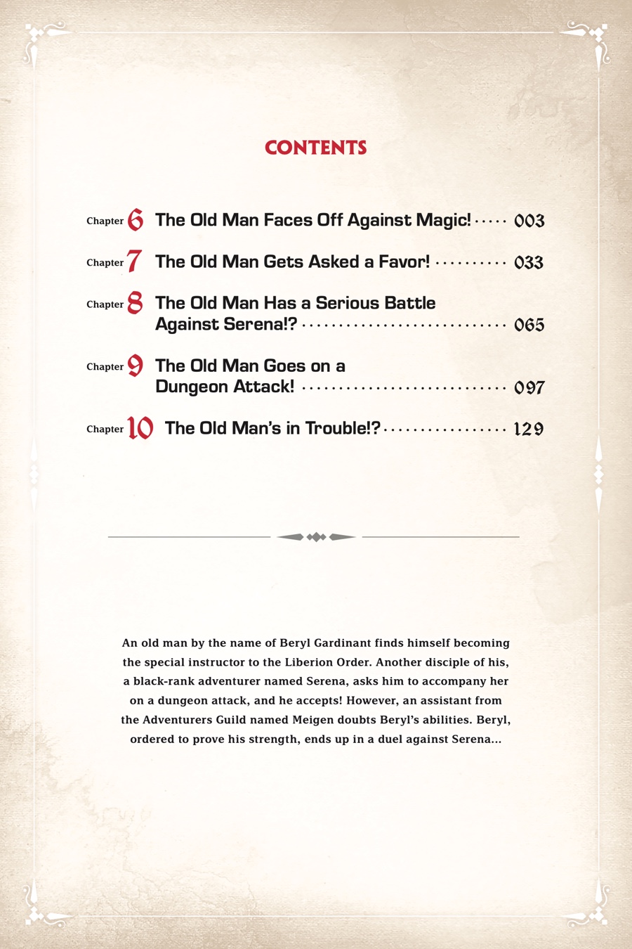 Old swordmaster Beryl Gardinant has become a special instructor for the order of knights. His former disciple Serena, now a black rank adventurer, asks him to help her go on a dungeon attack. Though he has almost no dungeon-attacking experience, Beryl accepts her request. But when representatives from the adventurer’s guild doubt his strength, he somehow ends up dueling Serena...?!
