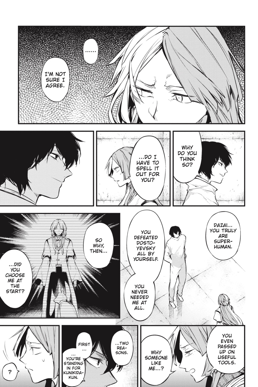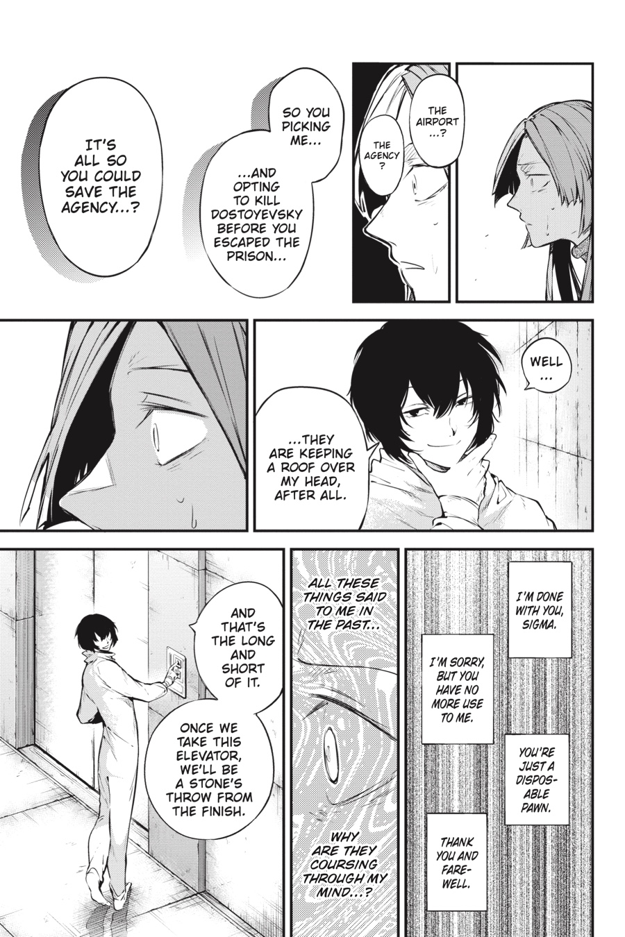 Together with their partners, Dazai and Dostoyevsky engage in a deadly battle of minds as they blitz through the security of Meursault. Sigma seeks to steal the secrets of Dostoyevsky’s skill, but such a prize will not come without its price. Meanwhile, Atsushi agonizes over what he’s learned, only to be forced once again to fight against Akutagawa—now a vampire. With the struggle for One Order coming to a head, who will come out on top?!